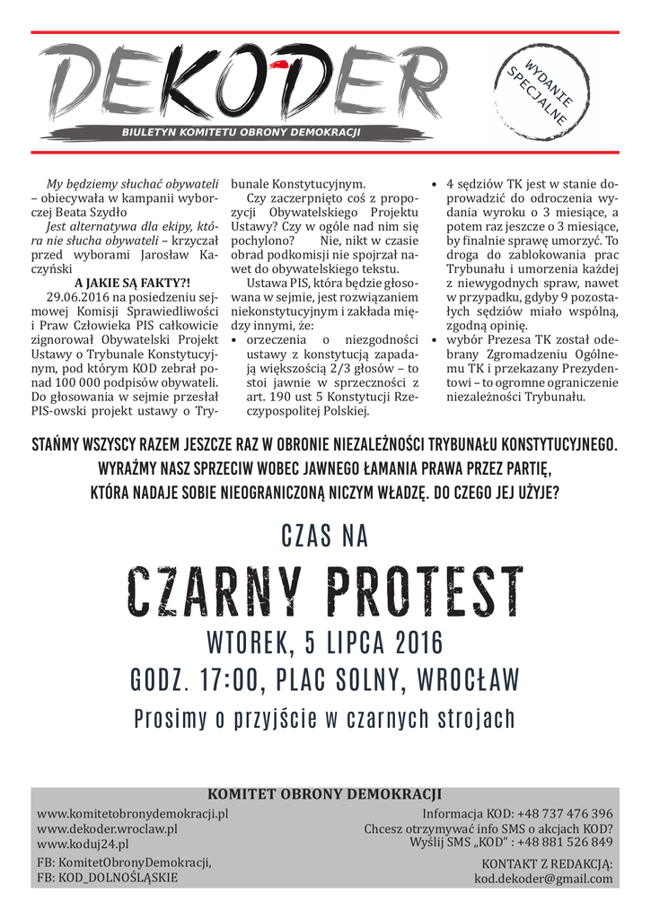 E NI NE DA AL WY ECJ SP BIULETYN KOMITETU OBRONY DEMOKRACJI My będziemy słuchać obywateli – obiecywała w kampanii wyborczej Beata Szydło Jest alternatywa dla ekipy, która nie słucha obywateli – krzyczał przed wyborami Jarosław Kaczyński A JAKIE SĄ FAKTY?! 29.06.2016 na posiedzeniu sejmowej Komisji Sprawiedliwości i Praw Człowieka PIS całkowicie zignorował Obywatelski Projekt Ustawy o Trybunale Konstytucyjnym, pod którym KOD zebrał ponad 100 000 podpisów obywateli. Do głosowania w sejmie przesłał PIS-owski projekt ustawy o Try- bunale Konstytucyjnym. • 4 sędziów TK jest w stanie doCzy zaczerpnięto coś z propoprowadzić do odroczenia wyzycji Obywatelskiego Projektu dania wyroku o 3 miesiące, a Ustawy? Czy w ogóle nad nim się potem raz jeszcze o 3 miesiące, pochylono? Nie, nikt w czasie by finalnie sprawę umorzyć. To obrad podkomisji nie spojrzał nadroga do zablokowania prac wet do obywatelskiego tekstu. Trybunału i umorzenia każdej Ustawa PIS, która będzie głosoz niewygodnych spraw, nawet wana w sejmie, jest rozwiązaniem w przypadku, gdyby 9 pozostaniekonstytucyjnym i zakłada mięłych sędziów miało wspólną, dzy innymi, że: zgodną opinię. • orzeczenia o niezgodności • wybór Prezesa TK został odeustawy z konstytucją zapadabrany Zgromadzeniu Ogólneją większością 2/3 głosów – to mu TK i przekazany Prezydenstoi jawnie w sprzeczności z towi – to ogromne ograniczenie art. 190 ust 5 Konstytucji Rzeniezależności Trybunału. czypospolitej Polskiej. STAŃMY WSZYSCY RAZEM JESZCZE RAZ W OBRONIE NIEZALEŻNOŚCI TRYBUNAŁU KONSTYTUCYJNEGO. WYRAŹMY NASZ SPRZECIW WOBEC JAWNEGO ŁAMANIA PRAWA PRZEZ PARTIĘ, KTÓRA NADAJE SOBIE NIEOGRANICZONĄ NICZYM WŁADZĘ. DO CZEGO JEJ UŻYJE? CZAS NA CZARNY PROTEST WTOREK, 5 LIPCA 2016 GODZ. 17:00, PLAC SOLNY, WROCŁAW Prosimy o przyjście w czarnych strojach KOMITET OBRONY DEMOKRACJI www.komitetobronydemokracji.pl www.dekoder.wroclaw.pl www.koduj24.pl FB: KomitetObronyDemokracji, FB: KOD_DOLNOŚLĄSKIE Informacja KOD: +48 737 476 396 Chcesz otrzymywać info SMS o akcjach KOD? Wyślij SMS „KOD” : +48 881 526 849 KONTAKT Z REDAKCJĄ: [email protected] 2 Numer specjalny | lipiec 2016 WŁADZA KPI Z PRAW OBYWATELI fragment relacji Jarosława Marciniaka, prezentującego w Sejmie Obywatelski Projekt Ustawy o Trybunale Konstytucyjnym Konstytucja Rzeczypospolitej Polskiej Art. 4: 1. Władza zwierzchnia w Rzeczypospolitej Polskiej należy do Narodu. 2. Naród sprawuje władzę przez swoich przedstawicieli lub BEZPOŚREDNIO. Dzięki wykonanej wspólnie pracy, poświęceniu wielu dni i godzin cennego wolnego czasu przez zaangażowanych w obronę wspólnych wartości Polaków, KOD zaprezentował w Sejmie ustawę o Trybunale Konstytucyjnym. Zrobiliśmy to po to, by pokazać, że możemy sprawować władzę bezpośrednio, potrafimy się do tego zorganizować i przygotować. Podpisy zebrane przez wolontariuszy w każdym zakątku Polski umożliwiły nam uczestnictwo w procesie tworzenia prawa, dla instytucji, w której obronie zrodził się nasz ruch. Po prezentacji ustawy na pierwszym czytaniu ustawę skierowano do pracy w Komisji Sprawiedliwości i Praw Człowieka, w której pracach również braliśmy udział. Prace niestety nie były nastawione na to, by efekt był merytoryczny, by ustawa pomogła w jakimkolwiek stopniu na przyszłość zażegnać sytuacji, której jesteśmy świadkami od jesieni 2015 roku. Jak wyglądały prace w specjalnie powołanej podkomisji, najbardziej trafnie odda to jedno słowo „szybko”. Posłowie i posłanka PiS, w pierwszym głosowaniu w podkomisji uznali swój projekt za projekt główny, nad którym będą pracować. A następnie w drodze szybkiego głosowania w ciągu 3 dni artykuł po artykule z tej ustawy został przez nich przegłosowany. Czy zwracali uwagę na krytyczne opinie KOD, czy zwracali uwagę na krytyczne głosy opozycji, czy może zwrócili uwagę na krytyczne głosy Biura Legislacji Sejmu? NIE, obowiązywała jedyna słuszna wizja partii, od której nie można odstąpić. Czy zaczerpnięto coś z naszej propozycji? Czy w ogóle nad nią się pochylono? NIE, nikt w czasie obrad podkomisji nie spojrzał do naszego tekstu. Czy wczoraj, w czasie 13,5 godzinnego posiedzenia Komisji wydarzyło się coś ciekawego ? Przebieg z pewnością był burzliwy od samego początku, gdy poseł Piotrowicz wpadł na pomysł, by wyrzucić kamery telewizyjne z sali, w której miały być prowadzone prace komisji. Na szczęście głośny protest z naszej strony, a także posłów i posłanek PO, Nowoczesnej i PSL. doprowadził do zmiany decyzji przewodniczącego i pozostania stacji telewizyjnych na obradach. Jednak same obrady przypominały jeden do jednego obrady podkomisji. Nie został wysłuchany ani nasz głos, ani opozycji, ani Biura Legislacji Sejmu. Ustawa, która jest efektem prac komisji, to rozwiązanie na wskroś niekonstytucyjne: • orzeczenia o niezgodności ustawy z konstytucją lub umową międzynarodową zapadają większością 2/3 głosów – to stoi jawnie w sprzeczności z art. 190 ust. 5 Konstytucji Rzeczypospolitej Polskiej. • 4 sędziów TK jest w stanie doprowadzić do odroczenia wydania wyroku o 3 miesiące, a potem raz jeszcze o 3 miesiące, by finalnie sprawę umorzyć. To droga • • • • do zablokowania prac Trybunału i umorzenia każdej z niewygodnych spraw, nawet w przypadku, gdyby 9 pozostałych sędziów miało wspólną, zgodną opinię. skuteczność wyroku TK w postępowaniu dyscyplinarnym będzie uzależniona od decyzji 2 osób Prezydenta i Prezesa Rady Ministrów. ograniczono udział Rzecznika Praw Obywatelskich w postępowaniu przed TK wybór Prezesa TK został de facto odebrany Zgromadzeniu Ogólnemu TK i przekazany Prezydentowi, to ogromne ograniczenie niezależności trybunału. sprawy będą odbywały się tylko na rozprawach, co spowolni prace TK Od redakcji: W ten sposób Jarosław Marciniak zwrócił się do posłów P
