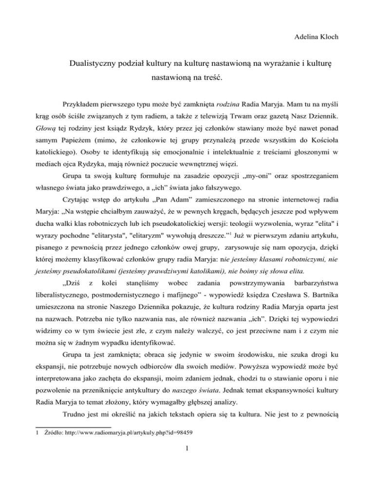 Adelina Kloch Dualistyczny podział kultury na kulturę nastawioną na wyrażanie i kulturę nastawioną na treść. Przykładem pierwszego typu może być zamknięta rodzina Radia Maryja. Mam tu na myśli krąg osób ściśle związanych z tym radiem, a także z telewizją Trwam oraz gazetą Nasz Dziennik. Głową tej rodziny jest ksiądz Rydzyk, który przez jej członków stawiany może być nawet ponad samym Papieżem (mimo, że członkowie tej grupy przynależą przede wszystkim do Kościoła katolickiego). Osoby te identyfikują się emocjonalnie i intelektualnie z treściami głoszonymi w mediach ojca Rydzyka, mają również poczucie wewnętrznej więzi. Grupa ta swoją kulturę formułuje na zasadzie opozycji „my-oni” oraz spostrzeganiem własnego świata jako prawdziwego, a „ich” świata jako fałszywego. Czytając wstęp do artykułu „Pan Adam” zamieszczonego na stronie internetowej radia Maryja: „Na wstępie chciałbym zauważyć, że w pewnych kręgach, będących jeszcze pod wpływem ducha walki klas robotniczych lub ich pseudokatolickiej wersji: teologii wyzwolenia, wyraz "elita" i wyrazy pochodne "elitarysta", "elitaryzm" wywołują dreszcze.”1 Już w pierwszym zdaniu artykułu, pisanego z pewnością przez jednego członków owej grupy, zarysowuje się nam opozycja, dzięki której możemy klasyfikować członków grupy radia Maryja: nie jesteśmy klasami robotniczymi, nie jesteśmy pseudokatolikami (jesteśmy prawdziwymi katolikami), nie boimy się słowa elita. „Dziś z kolei stanęliśmy wobec zadania powstrzymywania barbarzyństwa liberalistycznego, postmodernistycznego i mafijnego” - wypowiedź księdza Czesława S. Bartnika umieszczona na stronie Naszego Dziennika pokazuje, że kultura rodziny Radia Maryja oparta jest na nazwach. Potrzeba nie tylko nazwania nas, ale również nazwania „ich”. Dzięki tej wypowiedzi widzimy co w tym świecie jest złe, z czym należy walczyć, co jest przeciwne nam i z czym nie można się w żadnym wypadku identyfikować. Grupa ta jest zamknięta; obraca się jedynie w swoim środowisku, nie szuka drogi ku ekspansji, nie potrzebuje nowych odbiorców dla swoich mediów. Powyższa wypowiedź może być interpretowana jako zachęta do ekspansji, moim zdaniem jednak, chodzi tu o stawianie oporu i nie pozwolenie na przeniknięcie antykultury do naszego świata. Jednak temat ekspansywności kultury Radia Maryja to temat złożony, który wymagałby głębszej analizy. Trudno jest mi określić na jakich tekstach opiera się ta kultura. Nie jest to z pewnością 1 Źródło: http://www.radiomaryja.pl/artykuly.php?id=98459 1 Katechizm Kościoła Katolickiego czy Biblia, raczej interpretacja tych tekstów dokonywana przez ojca Rydzyka i jego media. To, co zostanie powiedziane w radiu Maryja, telewizji Trwam czy napisane w Naszym Dzienniku uznawane jest za prawdziwe i słuszne, a to co jest z tym sprzeczne lub odmienne uznawane jest za przynależące do kultury przeciwnej, a tym samym fałszywe. Przykładem drugiego typu kultury są czytelniczki (i czytelnicy?), a także twórcy pisma „Wysokie Obcasy” (cotygodniowego dodatku do Gazety Wyborczej). Nie mówię tu o osobach, które przypadkowo, czy nawet z zaangażowaniem, bądź niechęcią, czytają to pismo, lecz o tych, którzy się z nim identyfikują. Czują się z nim związane, emocjonalnie i intelektualnie, czyją się świat Wysokich Obcasów to „ich świat”. Kultura „Wysokich Obcasów” nie jest oparta na opozycji „my-oni”, lecz na regułach, zgodnie z którymi teksty można tworzyć i przyporządkowywać, jako należące do naszego świata lub jako te stworzone bez naszej ingerencji, te które kulturą nie są. Widać to np. w przypadku publikowanych w gazecie listów, choć są one dość zróżnicowane to myślę, że dogłębna analiza pozwoliłaby odkryć reguły zgodnie, z którymi dobiera się listy do publikacji. W tekstach „WO” nie tworzy się świata poprzez nazwy i proste opozycje, to gazeta, która zajmuje się tą częścią świata, która została uporządkowana według znanych nam reguł. Nawet jeżeli dotyka tematów spoza tego świata to „oswaja” je poprzez mierzenie się z nimi według własnych zasad. Ciekawym przykładem jest to, że numer poświęcony tematyce śmierci pojawił się dopiero tydzień lub dwa tygodnie po samym 1 listopada, który w naszej kulturze uznawany jest za czas zadumy nad śmiercią. Wobec tego w samym piśmie gości tematyka śmierci, a jednocześnie „WO” zaznaczają swoją odrębność od tradycyjnego, katolickiego podejścia do tego tematu (było to także widać w tematyce artykułów). „WO” to kultura, która dąży do ekspansji i podporządkowania coraz większej części tego, co funkcjonuje bez jej ingerencji. To, co jest poza nią i poza regułami zgodnie z którymi funkcjonuje traktowane jest jako zaściankowe, konserwatywne, patriarchalne – to, czemu trzeba pomóc by mogło funkcjonować swobodnie, niezależnie, ale i tak zgodnie z naszymi regułami. 2