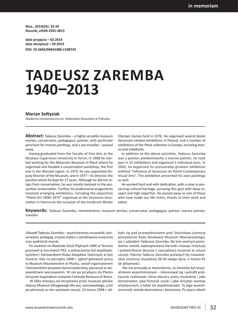 in memoriam Muz., 2014(55): 32-34 Rocznik, eISSN 2391-4815 data przyjęcia – 02.2014 data akceptacji – 03.2014 DOI: 10.5604/04641086.1108742 TADEUSZ ZAREMBA 1940–2013 Marian Sołtysiak Akademia Humanistyczna im. Aleksandra Gieysztora w Pułtusku Abstract: Tadeusz Zaremba – a highly versatile museum worker, conservator, pedagogue, painter, with particular penchant for marine paintings, and a sea traveller – passed away. Having graduated from the Faculty of Fine Arts at the Nicolaus Copernicus University in Toruń, in 1968 he started working for the Mazovian Museum in Płock where he organised and headed a conservation workshop, the first one in the Warsaw region. In 1973, he was appointed Deputy Director of the Museum, and in 1977 – its Director, the position which he kept for 27 years. Although he did not resign from conservation, he was mostly involved in the preventive conservation. Further, his professional assignments involved arranging exhibitions, including the exposition “Polish Art 1900–1975” organised at the Secession Association in Vienna on the occasion of the Innsbruck Winter Olympic Games held in 1976. He organised several dozen Secession-related exhibitions in Poland, and a number of exhibitions of the Płock collection in Europe, including Arezzo and Indelheim. In addition to the above activities, Tadeusz Zaremba was a painter, predominantly a marine painter; he took part in 52 exhibitions and organised 5 individual ones. In 2002, he organised his presumably greatest exhibition entitled “Influence of Secession on Polish Contemporary Visual Arts”. The exhibition presented his own paintings as well. He worked hard and with dedication, with a view to preserving cultural heritage, pursuing this goal with deep respect and high expertise. He passed away as one of those who have made our life richer, thanks to their work and talent. Keywords: Tadeusz Zaremba, remembrance, museum worker, conservator, pedagogue, painter, marine painter, traveller. Odszedł Tadeusz Zaremba – wszechstronny muzealnik, konserwator, pedagog, artysta malarz z zamiłowania marynista oraz podróżnik morski. Po studiach na Wydziale Sztuk Pięknych UMK w Toruniu pracował w toruńskich PKZ, a jednocześnie był współzałożycielem i kierownikiem Klubu Związków Twórczych w tym mieście. Gdy na początku 1968 r. zgłosił gotowość pracy w Muzeum Mazowieckim w Płocku, został organizatorem i kierownikiem pracowni konserwatorskiej, pierwszej w województwie warszawskim. W rok po przybyciu do Płocka otrzymał stypendium Instytuto Centrate Restauro di Roma. W kilka miesięcy od otrzymania przez muzeum płockie statusu Muzeum Okręgowego dla woj. warszawskiego, a też po pierwszej w nim wystawie secesji, 14 marca 1968 r. od- www.muzealnictworocznik.com było się pod przewodnictwem prof. Stanisława Lorentza posiedzenie Rady Naukowej Muzeum Mazowieckiego, już z udziałem Tadeusza Zaremby. Na tym ważnym posiedzeniu zostały zaakceptowane kierunki rozwoju instytucji i potwierdzono decyzję o specjalizacji muzeum w sztuce secesji. Później Tadeusz Zaremba poświęcił tej mazowieckiej instytucji muzealnej 38 lat swego życia, a miastu 45 lat aktywności. Nie ma przesady w stwierdzeniu, że Zaremba był muzealnikiem wszechstronnym − interesował się i potrafił praktycznie realizować różne obszary pracy muzealnej i jako konserwator, jako historyk sztuki i jako inicjator wystaw artystycznych, a także ich współrealizator. Ta Jego wszechstronność została dostrzeżona i doceniona. Po pięciu latach MUZEALNICTWO 55 32 został wicedyrektorem Muzeum Mazowieckiego, a po dalszych czterech jego dyrektorem. Nie zrezygnował jednak z uprawiania konserwatorstwa, ale zajmował się nim inaczej, w sposób, który określamy obecnie jako konserwacja zapobiegawcza. Był to dla muzeum ważny czas: zmiana siedziby, ogromny przyrost zbiorów. Nowe usytuowanie i poszerzone kompetencje Tadeusza Zaremby były dla muzeum bardzo pożyteczne, gdyż gwarantowały skuteczniejszą dbałość o zbiory. Podczas realizacji nowych ekspozycji łączył Tadeusz niekiedy obowiązki konserwatora i jednocześnie projektanta, i tak w 1975 r. aranżował pierwszą i chyba jedyną w Warszawie wystawę secesji, którą Muzeum Mazowieckie zaprezentowało w Muzeum Narodowym. Jako projektant wystawiennik zadziwił mnie rok później, w Wiedniu. Muzeum Mazowieckie otrzymało zadanie zorganizowania w Towarzystwie Secesja wystawy „Sztuka polska 1900–1975” z okazji Olimpiady Zimowej w Innsbrucku. Już samo miejsce ekspozycji, tak niezwykłe dla nas, wprowadzało element nadzwyczajnych emocji, ale prawdziwą trudność stanowiło zaaranżowanie wystawy, także tych drobnych obiektów, w dużej sali Towarzystwa. Po wielu rozmowach o kształcie projektowym wystawy Tadeusz zdecydował się zmierzyć z tym zadaniem. Obaj przeżywaliśmy niepokój o sukces ekspozycji, ale gdy już na miejscu zrealizował najprostsze i jakże skuteczne rozwiązanie – u sufitu podwiesił ogromne ważki i motyle z papieroplastyki, wystawa ożyła jako całość. Pod tymi owadami, tak ulubionymi przez secesję, obiekty wystawowe ujawniły się, były pięknie widoczne. Całą wystawę i sposób ekspozycji docenili zarówno członkowie Międzynarodowego Komitetu Olimpijskiego, goście Olimpiady, jak i publiczność wiedeńska. W 1977 r. Tadeusz Zaremba zastąpił mnie w Płocku, został dyrektorem Muzeum Mazowieckiego i piastował tę funkcję przez 27 lat. I tu znowu ujawniła się Jego wszechstronność: nie tylko konsekwentnie uzupełniał kolekcję zgodnie z założeniami z 1968 r., niestrudzenie prowadząc poszukiwania najcenniejszych dzieł secesyjnych, ale też bardzo zasłużył się w rozpropagowaniu secesji w Polsce i kolekcji płockiej w Europie. Zrealizował wiele wystaw, które jeżdżąc po kraju najpierw przekonywały do secesji, a później odpowiadały na ogromne nią zainteresowanie. Wystaw było kilkadziesiąt, niektór