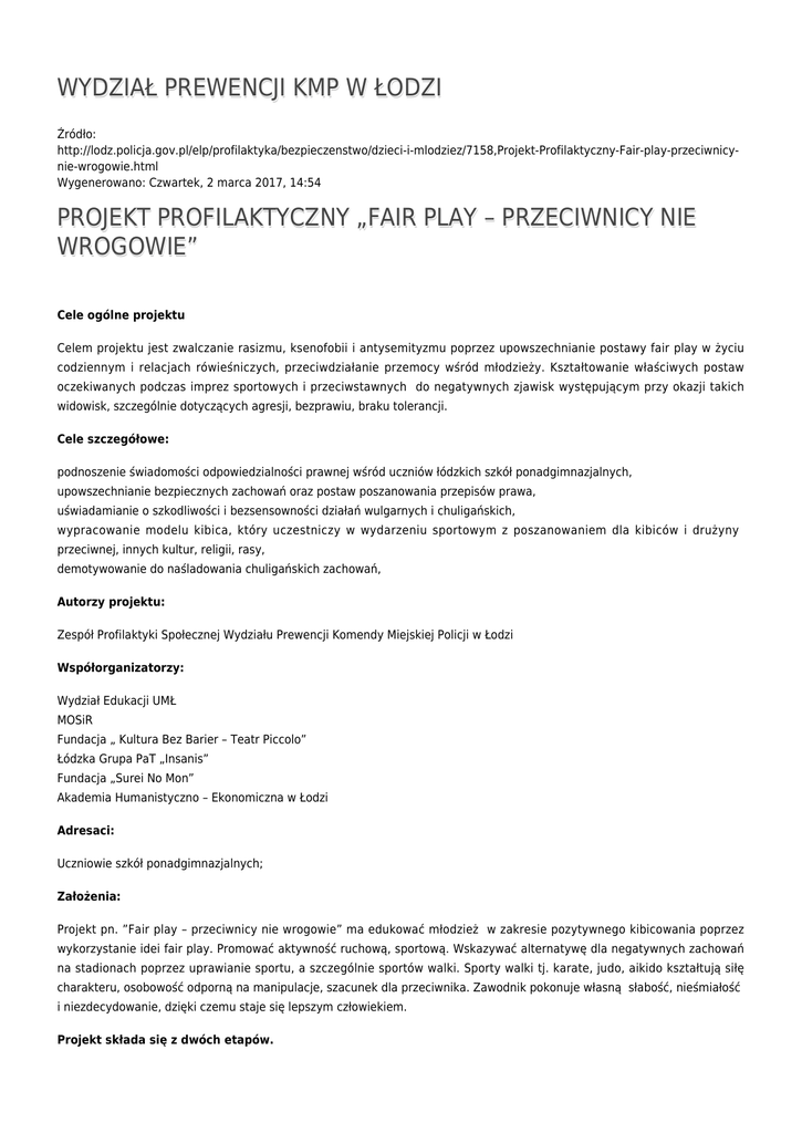 WYDZIAŁ PREWENCJI KMP W ŁODZI Źródło: http://lodz.policja.gov.pl/elp/profilaktyka/bezpieczenstwo/dzieci-i-mlodziez/7158,Projekt-Profilaktyczny-Fair-play-przeciwnicynie-wrogowie.html Wygenerowano: Czwartek, 2 marca 2017, 14:54 PROJEKT PROFILAKTYCZNY „FAIR PLAY – PRZECIWNICY NIE WROGOWIE” Cele ogólne projektu Celem projektu jest zwalczanie rasizmu, ksenofobii i antysemityzmu poprzez upowszechnianie postawy fair play w życiu codziennym i relacjach rówieśniczych, przeciwdziałanie przemocy wśród młodzieży. Kształtowanie właściwych postaw oczekiwanych podczas imprez sportowych i przeciwstawnych do negatywnych zjawisk występującym przy okazji takich widowisk, szczególnie dotyczących agresji, bezprawiu, braku tolerancji. Cele szczegółowe: podnoszenie świadomości odpowiedzialności prawnej wśród uczniów łódzkich szkół ponadgimnazjalnych, upowszechnianie bezpiecznych zachowań oraz postaw poszanowania przepisów prawa, uświadamianie o szkodliwości i bezsensowności działań wulgarnych i chuligańskich, wypracowanie modelu kibica, który uczestniczy w wydarzeniu sportowym z poszanowaniem dla kibiców i drużyny przeciwnej, innych kultur, religii, rasy, demotywowanie do naśladowania chuligańskich zachowań, Autorzy projektu: Zespół Profilaktyki Społecznej Wydziału Prewencji Komendy Miejskiej Policji w Łodzi Współorganizatorzy: Wydział Edukacji UMŁ MOSiR Fundacja „ Kultura Bez Barier – Teatr Piccolo” Łódzka Grupa PaT „Insanis” Fundacja „Surei No Mon” Akademia Humanistyczno – Ekonomiczna w Łodzi Adresaci: Uczniowie szkół ponadgimnazjalnych; Założenia: Projekt pn. ”Fair play – przeciwnicy nie wrogowie” ma edukować młodzież w zakresie pozytywnego kibicowania poprzez wykorzystanie idei fair play. Promować aktywność ruchową, sportową. Wskazywać alternatywę dla negatywnych zachowań na stadionach poprzez uprawianie sportu, a szczególnie sportów walki. Sporty walki tj. karate, judo, aikido kształtują siłę charakteru, osobowość odporną na manipulacje, szacunek dla przeciwnika. Zawodnik pokonuje własną słabość, nieśmiałość i niezdecydowanie, dzięki czemu staje się lepszym człowiekiem. Projekt składa się z dwóch etapów. Etap I – opracowanie przez uczniów skeczu, dialogu, scenki lub etiudy podkreślającej pozytywną wartość kulturalnego i odpowiedzialnego kibicowania z jednoczesnym pokazaniem w krzywym zwierciadle przykładów negatywnych zachowań pseudokibiców. Nadesłane prace będą oceniane przez jury składające się z przedstawicieli współorganizatorów. Podczas gali finałowej zwycięski scenariusz zaprezentowany zostanie przez młodych aktorów z Łódzkiej Grupy PaT. Prace należy przesłać na adres: [email protected] w terminie do 30 listopada 2016r. Muszą być opatrzone informacjami: autorzy ( max 3 osoby), nazwa szkoły, nazwisko opiekuna wychowawcy ze szkoły, dane do kontaktu, nr telefonu. Etap II – podczas uroczystego finału projektu 6 osobowe drużyny (3 dziewczyny, 3 chłopców)- reprezentacje szkół wezmą udział w spartakiadzie. Kształtując postawę kulturalnego kibicowania, w trakcie wydarzenia rozstrzygnięty zostanie konkurs na najlepiej kibicującą reprezentację szkoły składającą się z maksymalnie 30 osób. Konkurencje sportowe nawiązujące do sportów walki zostaną uzgodnione z Prezesem Fundacji „Surei No Mon” Andrzejem Matlińskim. Wydarzeniu towarzyszyć będą pokazy i warsztaty przybliżające tradycję Wschodnich Sztuk Walki i Kulturę Japonii m.in. warsztaty origami, kaligrafii, języka japońskiego, pokaz sambo Arashi, Aikido – Ki Aikido, ju jitsu itp. Harmonogram działań: Termin realizacji: 30 listopada 2016r – ostateczny termin nadsyłania prac. 9 grudnia 2016r. – ocena prac, wybór laureatów, 3 lutego 2017r. – uroczysta gala finałowa w Hali Sportowej MOSIR przy ul. Małachowskiego 5/7/9 Ocena: 0/5 (0) Tweetnij