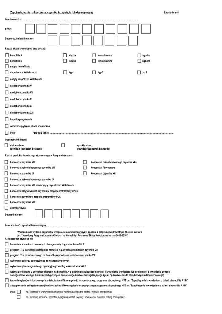 Zapotrzebowanie na koncentrat czynnika krzepnięcia lub desmopresynę Załącznik nr 6 Imię i nazwisko……………………………………………………………………………………………………………………………………….…… PESEL Data urodzenia (dd-mm-rrrr) Rodzaj skazy krwotocznej oraz postać: hemofilia A ciężka umiarkowana łagodna hemofilia B ciężka umiarkowana łagodna typ 1 typ 2 typ 3 nabyta hemofilia A choroba von Willebranda nabyty zespół von Willebranda niedobór czynnika V niedobór czynnika VII niedobór czynnika X niedobór czynnika XI niedobór czynnika XIII hypofibrynogenemia wrodzona płytkowa skaza krwotoczna inne* *podać jakie ................................................................................................................................................................... Obecność inhibitora: niskie miano (poniżej 5 jednostek Bethesda) wysokie miano (powyżej 5 jednostek Bethesda) Rodzaj produktu leczniczego stosowanego w Programie (nazwa) koncentrat czynnika VIII koncentrat rekombinowanego czynnika VIIa koncentrat rekombinowanego czynnika VIII koncentrat fibrynogenu koncentrat czynnika IX koncentrat czynnika XIII koncentrat rekombinowanego czynnika IX koncentrat czynnika VIII zawierający czynnik von Willebranda koncentrat aktywowanych czynników zespołu protrombiny aPCC koncentrat czynników zespołu protrombiny PCC koncentrat czynnika VII desmopresyna Data (dd-mm-rrrr) Zalecana iIość czynnika/desmopresyny …………………………………………………………………………………………………………………….. Wskazania do wydania czynników krzepnięcia oraz desmopresyny, zgodnie z programem zdrowotnym Ministra Zdrowia pn. "Narodowy Program Leczenia Chorych na Hemofilię i Pokrewne Skazy Krwotoczne na lata 2012-2018": 1. Koncentrat czynnika VIII leczenie w warunkach domowych chorego na ciężką postać hemofilii A program ITI u dorosłego chorego na hemofilię A powikłaną inhibitorem czynnika VIII program ITI u dziecka chorego na hemofilię A powikłaną inhibitorem czynnika VIII wykonanie zabiegu operacyjnego ze wskazań życiowych wykonanie planowego zabiegu operacyjnego według wskazań lekarskich wtórna profilaktyka u dorosłego chorego na hemofilię A o ciężkim przebiegu (co najmniej 1 krwawienie w miesiącu lub co najmniej 3 krwawienia do tego samego stawu w ciągu 3 miesięcy lub przebycie samoistnego krwawienia zagrażającego życiu, np.krwawienie do ośrodkowego układu nerwowego) leczenie wylewów śródstawowych u dzieci zakwalifikowanych do terapeutycznego programu zdrowotnego NFZ pn. "Zapobieganie krwawieniom u dzieci z hemofilią A i B" zabezpieczenie zabiegów/operacji u dzieci zakwalifikowanych do terapeutycznego programu zdrowotnego NFZ pn."Zapobieganie krwawieniom u dzieci z hemofilią A i B" inne: np.: leczenie w warunkach domowych, hemofilia A łagodna postać (wylewy, krwawienia) np.: leczenie szpitalne, hemofilia A łagodna postać (wylewy, krwawienia, niewielki zabieg chirurgiczny) 2. Koncentrat rekombinowanego czynnika VIII do leczenia krwawień u dzieci, które nie otrzymywały wcześniej preparatów krwiopochodnych, zakwalifikowanych do modułu pierwotnej profilaktyki krwawień czynnikami rekombinowanycmi w ramach programu NFZ pn. "Zapobieganie krwawieniom u dzieci z hemofilią A i B" oraz włączanie nowych dzieci do leczenia, na tych samych zasadach, niezależnie od cieżkości hemofilii zabezpieczenie wylewów śródstawowych zabezpieczenie zabiegów chirurgicznych program ITI u dziecka, które wytworzyło inhibitor przed włączeniem do programu "Zapobieganie krwawieniom u dzieci z hemofilią A i B", a stosowało w terapii "na żądanie" koncentraty rekombinowanych czynników krzepnięcia 3. Koncentrat czynnika IX leczenie domowe chorego na ciężką hemofilię B program ITI u dorosłego chorego na hemofilię B powikłaną inhibitorem czynnika IX program ITI u dziecka chorego na hemofilię B powikłaną inhibitorem czynnika IX wykonanie zabiegu operacyjnego ze wskazań życiowych wykonanie planowego zabiegu operacyjnego według wskazań lekarskich wtórna profilaktyka u dorosłego chorego na hemofilię B o ciężkim przebiegu (co najmniej 1 krwawienie w miesiącu lub co najmniej 3 krwawienia do tego samego stawu w ciągu 3 miesięcy lub przebycie samoistnego krwawienia zagrażającego życiu, np.krwawienie do ośrodkowego układu nerwowego) leczenie wylewów śródstawowych u dzieci zakwalifikowanych do terapeutycznego programu zdrowotnego NFZ pn. "Zapobieganie krwawieniom u dzieci z hemofilią A i B" zabezpieczenie zabiegów/operacji u dzieci zakwalifikowanych do terapeutycznego programu zdrowotnego NFZ pn. "Zapobieganie krwawieniom u dzieci z hemofilią A i B" inne: np.: leczenie w warunkach domowych hemofilia B łagodna postać (wylewy, krwawienia) np.: leczenie szpitalne, hemofilia B łagodna postać (wylewy, krwawienia, niewielki zabieg chirurgiczny) 4. Koncentrat rekombinowanego czynnika IX do leczenia krwawień u dzieci, które nie otrzymywały wcześniej preparatów krwiopochodnych, zakwalifikowanych do modułu pierwotnej profilaktyki krwawień czynnikami rekombinowanycmi w ramach programu NFZ pn. "Zapobieganie krwawieniom u dzieci z hemofilią A i B" oraz włączanie nowych dzieci do leczenia, na tych samych zasadach, niezależnie od cieżkości hemofilii zabezpieczenie wylewów środstawowych zabezpieczenie zabiegów chirurgicznych program ITI u dziecka, które wytworzyło inhibitor przed włączeniem do programu "Zapobieganie krwawieniom u dzieci z hemofilią A i B", a stosowało w terapii "na żądanie" koncentraty rekombinowanych czynników krzepnięcia 5. Koncentrat czynnika VIII zawierający czynnik von Willebranda, zarejestrowany ze wskazaniem do leczenia choroby von Willebranda leczenie w warunkach domowych chorego na chorobę von Willebranda o najcięższym przebiegu klinicznym pilny zabieg u pacjenta z ciężką pos