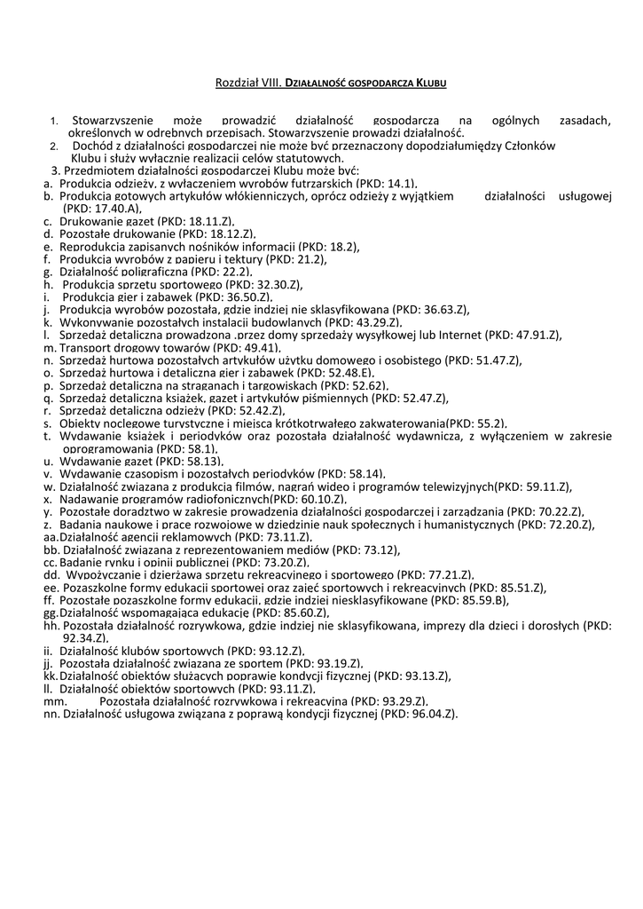 Rozdział VIII. DZIAŁALNOŚĆ GOSPODARCZA KLUBU 1. Stowarzyszenie może prowadzić działalność gospodarczą na ogólnych zasadach, określonych w odrębnych przepisach. Stowarzyszenie prowadzi działalność. 2. Dochód z działalności gospodarczej nie może być przeznaczony dopodziałumiędzy Członków Klubu i służy wyłącznie realizacji celów statutowych. 3. Przedmiotem działalności gospodarczej Klubu może być: a. Produkcja odzieży, z wyłączeniem wyrobów futrzarskich (PKD: 14.1), b. Produkcja gotowych artykułów włókienniczych, oprócz odzieży z wyjątkiem działalności usługowej (PKD: 17.40.A), c. Drukowanie gazet (PKD: 18.11.Z), d. Pozostałe drukowanie (PKD: 18.12.Z), e. Reprodukcja zapisanych nośników informacji (PKD: 18.2), f. Produkcja wyrobów z papieru i tektury (PKD: 21.2), g. Działalność poligraficzna (PKD: 22.2), h. Produkcja sprzętu sportowego (PKD: 32.30.Z), i. Produkcja gier i zabawek (PKD: 36.50.Z), j. Produkcja wyrobów pozostała, gdzie indziej nie sklasyfikowana (PKD: 36.63.Z), k. Wykonywanie pozostałych instalacji budowlanych (PKD: 43.29.Z), l. Sprzedaż detaliczna prowadzona .przez domy sprzedaży wysyłkowej lub Internet (PKD: 47.91.Z), m. Transport drogowy towarów (PKD: 49.41), n. Sprzedaż hurtowa pozostałych artykułów użytku domowego i osobistego (PKD: 51.47.Z), o. Sprzedaż hurtowa i detaliczna gier i zabawek (PKD: 52.48.E), p. Sprzedaż detaliczna na straganach i targowiskach (PKD: 52.62), q. Sprzedaż detaliczna książek, gazet i artykułów piśmiennych (PKD: 52.47.Z), r. Sprzedaż detaliczna odzieży (PKD: 52.42.Z), s. Obiekty noclegowe turystyczne i miejsca krótkotrwałego zakwaterowania(PKD: 55.2), t. Wydawanie książek i periodyków oraz pozostała działalność wydawnicza, z wyłączeniem w zakresie oprogramowania (PKD: 58.1), u. Wydawanie gazet (PKD: 58.13), v. Wydawanie czasopism i pozostałych periodyków (PKD: 58.14), w. Działalność związana z produkcją filmów, nagrań wideo i programów telewizyjnych(PKD: 59.11.Z), x. Nadawanie programów radiofonicznych(PKD: 60.10.Z), y. Pozostałe doradztwo w zakresie prowadzenia działalności gospodarczej i zarządzania (PKD: 70.22.Z), z. Badania naukowe i prace rozwojowe w dziedzinie nauk społecznych i humanistycznych (PKD: 72.20.Z), aa.Działalność agencji reklamowych (PKD: 73.11.Z), bb. Działalność związana z reprezentowaniem mediów (PKD: 73.12), cc. Badanie rynku i opinii publicznej (PKD: 73.20.Z), dd. Wypożyczanie i dzierżawa sprzętu rekreacyjnego i sportowego (PKD: 77.21.Z), ee. Pozaszkolne formy edukacji sportowej oraz zajęć sportowych i rekreacyjnych (PKD: 85.51.Z), ff. Pozostałe pozaszkolne formy edukacji, gdzie indziej niesklasyfikowane (PKD: 85.59.B), gg. Działalność wspomagająca edukację (PKD: 85.60.Z), hh. Pozostała działalność rozrywkowa, gdzie indziej nie sklasyfikowana, imprezy dla dzieci i dorosłych (PKD: 92.34.Z), ii. Działalność klubów sportowych (PKD: 93.12.Z), jj. Pozostała działalność związana ze sportem (PKD: 93.19.Z), kk. Działalność obiektów służących poprawie kondycji fizycznej (PKD: 93.13.Z), ll. Działalność obiektów sportowych (PKD: 93.11.Z), mm. Pozostała działalność rozrywkowa i rekreacyjna (PKD: 93.29.Z), nn. Działalność usługowa związana z poprawą kondycji fizycznej (PKD: 96.04.Z).