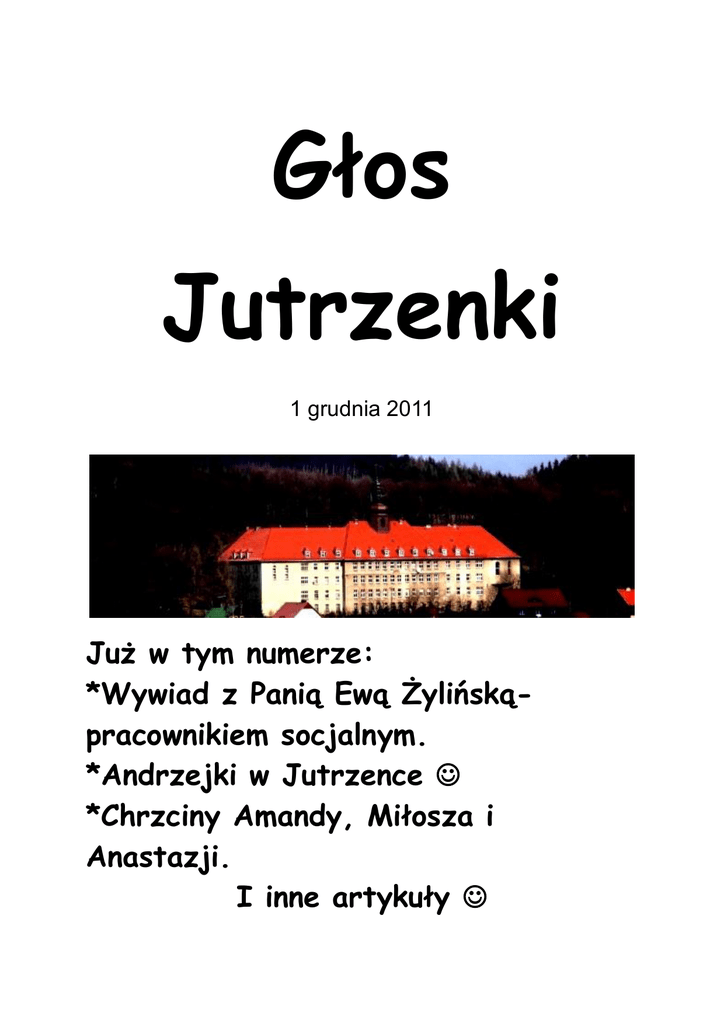 Głos Jutrzenki 1 grudnia 2011 Już w tym numerze: *Wywiad z Panią Ewą Żylińskąpracownikiem socjalnym. *Andrzejki w Jutrzence *Chrzciny Amandy, Miłosza i Anastazji. I inne artykuły Andrzejki 2011 ! Dnia 25.11.2011 r. odbyły się w naszym domu Andrzejki połączone z urodzinami wszystkich, którzy obchodzili je w listopadzie. Ewelina Kotowska, Gabriela Kowalczyk, Szymon Tabaczuk i Rafał Zabrzeński z grupy autonomicznej szczególnie świętowali, ponieważ stali się pełnoletni. Urodziny obchodziła także Anna Marańska, która świętowała swoje 17 urodziny :). Imprezę andrzejkową przygotował samorząd pod opieką Pani Kamili Ma kowskiej i Pani Karoliny Kwiatkowskiej. Każda z grup przygotowała sałatki, piekła ciasta, robiła kanapki itp. W każdym bądź razie było dużo jedzenia. Samorząd zatroszczył się także o wróżby andrzejkowe, bo co to za andrzejki bez wróżenia sobie co nas spotka w przyszłości itp. Każdy podchodził do danego stanowiska i wróżył sobie . Dowiedzieliśmy się bardzo dużo ciekawych rzeczy ;). Odbył się także konkurs przygotowany przez Elwirę Dębską (wychowanka gr.I),który polegał na tym, aby rozpozna wychowawców na ich fotografiach z dzieciństwa. Trudno było rozpozna , ale Elwira po podliczeniu poprawnych odpowiedzi u każdego kto brał udział, wyłoniła zwycięzcę konkursu, którym została Patrycja Dawczak. Cała impreza trwała do ok. godz. 23:00. Wszyscy zmęczeni, objedzeni, wytańczeni poszli spa =). Dziękujemy samorządowi za wspaniałą imprezę ! ;D A oto zdjęcia z imprezy : Wywiad z pracownikiem socjalnym , Panią Ewą Żylińską. 1.Patrycja: Czy praca jako pracownik socjalny to jest to o czym Pani marzyła? Pani Ewa: Tak. Najpierw skończyłam liceum ekonomiczne, ale od początku nie widziałam się w cyferkach . Pomoc i praca dla innych spełnia moje marzenia 2.P: Jakie według Pani są zalety i wady tejże pracy ? PE: Zaletą na pewno jest to, że można dużo zrobić dla innych. Natomiast wady, no cóż nie wszyscy doceniają to co się dla nich robi . 3.P: Narzeka Pani na swoją pracę ? PE: Nie, bycie pracownikiem socjalnym w innych instytucjach niż dom dziecka nie sprawiało mi tyle satysfakcji co praca tutaj. Teraz już na pewno na nic nie narzekam . 4.P: W swojej pracy ma Pani pewnie dużo dokumentów do wypełnienia, napisania, wysłania? Jak sobie Pani z tym radzi? Proszę zdradzić nam swoją tajemnicę. PE: Dokumentów jest dużo, ale jak w życiu robi się to co się lubi to nie stanowi to większego problemu. 5.P: Przeważnie gdy S. Dyrektor jest na urlopie, obowiązki dyrektora przydziela Pani. Sprawia to Pani satysfakcję, że to akurat Pani ? PE: Oczywiście jest to dla mnie miłe, że S.Dyrektor ma do mnie zaufanie i powierza mi swoją bardzo odpowiedzialną funkcję. 6.P: Ile lat Pani pracuje w „Jutrzence” ? PE: Od września 2009, więc 2 lata i 3 miesiące. 7.P: Jakie są Pani zainteresowania ? PE: Bardzo lubię czytać i dużo wolnego czasu na to poświęcam ;). Chrzciny 03.11.2011 r. w naszym domu odbyła się wielka uroczystość, a mianowicie chrzciny Anastazji, Miłosza i Amandy. Rodzicami chrzestnymi zostali: *Karolina Troicka i Piotr Iwachów dla Anastazji. *Anna Marańska dla Amandy *Patrycja Dawczak dla Miłosza. O godz 18:00 odbyła się msza św. pod przewodnictwem ojca Łukasza Wójcika i Henryka Zienkiewicza z naszej parafii. W mszy św. uczestniczyli także postulanci. Na mszy św. nie brakowało energii oraz radości. Wraz z S. Agnieszką, która grała na gitarze oraz P.Agnieszką, która śpiewała, a my razem z nią:). Po Eucharystii wszyscy w odświętnych strojach udaliśmy się na poczęstunek do naszej domowej stołówki. Było dużo dobrego jedzenia, nikt nie wyszedł głodny :) Coraz bliżej święta !! Święta Bożego Narodzenia to czas, w którym każdy z nas powinien znaleźć się razem z rodziną i bliskimi. Niektórzy z nas już niedługo wyjadą do swoich rodzin, aby spędzić święta w swoim rodzinnym domu, a też niektórzy z nas zostaną. Już niedługo rozpocznie się ubieranie choinki, strojenie domu, robienie ozdób świątecznych itp. To co każdy z nas lubi robić najbardziej, wtedy udziela się nam nastrój świąteczny . Wtedy nikt z nas nie powinien się na siebie gniewać oraz kłócić. Święta z rodziną to najpiękniejszy prezent jaki możemy dostać . Z okazji Świąt Bożego Narodzenia życzę wszystkim, aby te święta były wyjątkowe i szczególne. Abyście docenili to co macie. Aby radość, miłość i spokój gościł w waszych sercach i nigdy nie opuszczał. By pod choinką znalazło się dużo prezentów. Aby spełniły się wasze życzenia te małe i te duże. Wszystkiego najlepszego ! Gazetę napisała i przygotowała Patrycja Dawczak