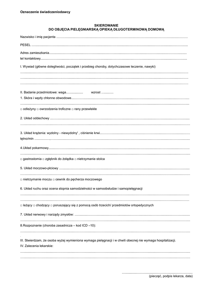 Oznaczenie świadczeniodawcy SKIEROWANIE DO OBJĘCIA PIELĘGNIARSKĄ OPIEKĄ DŁUGOTERMINOWĄ DOMOWĄ Nazwisko i imię pacjenta ................................................................................................................................................... PESEL ............................................................................................................................................................................... Adres zamieszkania.......................................................................................................................................................... tel kontaktowy.................................................................................................................................................................... I. Wywiad (główne dolegliwości, początek i przebieg choroby, dotychczasowe leczenie, nawyki) ............................................................................................................................................................................................ ............................................................................................................................................................................................ ............................................................................................................................................................................................ II. Badanie przedmiotowe: waga................... wzrost ….......... 1. Skóra i węzły chłonne obwodowe.................................................................................................................................... ............................................................................................................................................................................................. □ odleżyny □ owrzodzenia troficzne □ rany przewlekłe 2. Układ oddechowy ............................................................................................................................................................ .............................................................................................................................................................................................. 3. Układ krążenia: wydolny - niewydolny' , ciśnienie krwi..................................................................................................... tętno/min .................,............................................................................................................................................................ 4.Układ pokarmowy.............................................................................................................................................................. .............................................................................................................................................................................................. □ gastrostomia □ zgłębnik do żołądka □ nietrzymanie stolca 5. Układ moczowo-płciowy .................................................................................................................................................. .............................................................................................................................................................................................. □ nietrzymanie moczu □ cewnik do pęcherza moczowego 6. Układ ruchu oraz ocena stopnia samodzielności w samoobsłudze i samopielęgnacji ............................................................................................................................................................................................. ............................................................................................................................................................................................. □ leżący □ chodzący □ poruszający się z pomocą osób trzecich/ przedmiotów ortopedycznych 7. Układ nerwowy i narządy zmysłów: ................................................................................................................................. .............................................................................................................................................................................................. 8.Rozpoznanie (choroba zasadnicza – kod ICD –10): .............................................................................................................................................................................................. . III. Stwierdzam, że osoba wyżej wymieniona wymaga pielęgnacji i w chwili obecnej nie wymaga hospitalizacji. IV. Zalecenia lekarskie: .............................................................................................................................................................................................. .............................................................................................................................................................................................. ............................................................................... (pieczęć, podpis lekarza, data) KARTA OCENY ŚWIADCZENIOBIORCY KIEROWANEGO DO OBJĘCIA /OBJĘTEGO1) PIELĘGNIARSKĄ OPIEKĄ DŁUGOTERMINOWĄ DOMOWĄ 1. Ocena świadczeniodawcy wg skali Barthel2) Imię i nazwisko świadczeniobiorcy …................................................................................. Adres zamieszkania ….......................................................................................................... Numer PESEL, a w przypadku brak numeru PESEL, numer dokumentu potwierdzającego tożsamość …...........................................................................................................................................