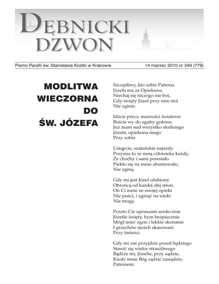 Pismo Parafii św. Stanisława Kostki w Krakowie Modlitwa wieczorna do św. Józefa 14 marzec 2010 nr 349 (779) Szczęśliwy, kto sobie Patrona Józefa ma za Opiekuna. Niechaj się niczego nie boi, Gdy święty Józef przy nim stoi Nie zginie. Idźcie precz, marności światowe Boście wy do zguby gotowe. Już mam nad wszystko słodszego Józefa, opiekuna mego Przy sobie. Ustąpcie, szatańskie najazdy. Przyzna to ze mną człowieka każdy, Że choćby i sami powstało Piekło się na mnie zbuntowało, Nie zginę. Gdy mi jest Józef ulubiony Obrońcą od każdej złej stron. On Ci mnie ze swojej opieki Nie puści, i zginąć na wieki Nie mogę. Przeto Cie upraszam serdecznie Józefie święty, bym bezpiecznie Mógł mieć zgon i lekkie skonanie I grzechów moich skasowani Przy śmierci. Gdy mi zaś przyjdzie przed Sędziego Stawić się wielce straszliwego Bądźże mi, Józefie, przy sądzie, Kiedy mnie Bóg sądzić zasiądzie, Patronem. Słowo Dla Życia Zbliżali się do Jezusa wszyscy celnicy i grzesznicy, aby Go słuchać. Na to szemrali faryzeusze i uczeni w Piśmie. Ten przyjmuje grzeszników i jada z nimi. Opowiedział im wtedy następującą przypowieść: Powiedział też: Pewien człowiek miał dwóch synów. Młodszy z nich rzekł do ojca: Ojcze, daj mi część majątku, która na mnie przypada. Podzielił więc majątek między nich. Niedługo potem młodszy syn, zabrawszy wszystko, odjechał w dalekie strony i tam roztrwonił swój majątek, żyjąc rozrzutnie. A gdy wszystko wydał, nastał ciężki głód w owej krainie i on sam zaczął cierpieć niedostatek. Poszedł i przystał do jednego z obywateli owej krainy, a ten posłał go na swoje pola żeby pasł świnie. Pragnął on napełnić swój żołądek strąkami, którymi żywiły się świnie, lecz nikt mu ich nie dawał. Wtedy zastanowił się i rzekł: Iluż to najemników mojego ojca ma pod dostatkiem chleba, a ja tu z głodu ginę. Zabiorę się i pójdę do mego ojca, i powiem mu: Ojcze, zgrzeszyłem przeciw Bogu i względem ciebie; już nie jestem godzien nazywać się twoim synem: uczyń mię choćby jednym z najemników. Wybrał się więc i poszedł do swojego ojca. A gdy był jeszcze daleko, ujrzał go jego ojciec i wzruszył się głęboko; wybiegł naprzeciw niego, rzucił mu się na szyję i ucałował go. A syn rzekł do niego: Ojcze, zgrzeszyłem przeciw Bogu i względem ciebie, już nie jestem godzien nazywać się twoim synem. Lecz ojciec rzekł do swoich sług: Przynieście szybko najlepszą szatę i ubierzcie go; dajcie mu też pierścień na rękę i sandały na nogi. Przyprowadźcie utuczone cielę i zabijcie: będziemy ucztować i bawić się, ponieważ ten mój syn był umarły, a znów ożył; zaginął, a odnalazł się. I zaczęli się bawić. Tymczasem starszy jego syn przebywał na polu. Gdy wracał i był blisko domu, usłyszał muzykę i tańce. Przywołał jednego ze sług i pytał go, co to ma znaczyć. Ten mu rzekł: Twój brat powrócił, a ojciec twój kazał zabić utuczone cielę, ponieważ odzyskał go zdrowego. Na to rozgniewał się i nie chciał wejść; wtedy ojciec jego wyszedł i tłumaczył mu. Lecz on odpowiedział ojcu: Oto tyle lat ci służę i nigdy nie przekroczyłem twojego rozkazu; ale mnie nie dałeś nigdy koźlęcia, żebym się zabawił z przyjaciółmi. Skoro jednak wrócił ten syn twój, który roztrwonił twój majątek z nierządnicami, kazałeś zabić dla niego utuczone cielę. Lecz on mu odpowiedział: Moje dziecko, ty zawsze jesteś przy mnie i wszystko moje do ciebie należy. A trzeba się weselić i cieszyć z tego, że ten brat twój był umarły, a znów ożył, zaginął a odnalazł się. Jezus opowiada o człowieku, który się zagubił, zaplątał się w swej ciekawości świata i wolności, w pragnieniu decydowania o sobie, w poszukiwaniu szczęścia. Człowiek ten jednak zapomniał o miłości. Próbował znaleźć życiowe spełnienie w oderwaniu od swojego ojca. Uciekł, oddalił się od centrum swojego życia – domu ojca, ojcowizny. Szukał przygód i samego siebie, znalazł się nagle w ślepej uliczce. Doświadczył nędzy, otarł się o śmierć, przeżył wstrząsające chwile, zaczął zastanawiać się nad swoim życiem, analizował wszystko co dotąd go spotkało, dostrzega logiczne konsekwencje swoich decyzji – i co najważniejsze – odnajduje powody takiej sytuacji w sobie. Uznał, że zawinił, zgrzeszył przeciw Bogu i chciał pokazać swojemu ojcu, ze poradzi sobie bez pomocy innych, nawet tych, którzy nigdy nie przestali go kochać. Odszedł od bliskich, w świat daleki, obcy, może fascynujący. Odszedł także od siebie, żyjąc złudzeniami, długo oszukiwał siebie i zdradzał wartości wśród których wzrastał w młodości. W końcu zdobył się na odważny krok, przyznał się do urażonej, zranionej miłości własnej, wytrzymał ból prawdy o sobie samym. To dało początek powrotowi do domu, do ojczyzny. Kiedy zbliżał się do domu, pojawiają się wspomnienia chwil szczęścia, łzy radości, nieco lęku i wielka pokora. Ojciec z daleka widzi ukochaną postać, miłość i współczucie powodują, że ojciec wybiega naprzeciw syna i ubiega jego szczere wyznanie winy. Syn odnajduje się w ramionach kochającego ojca. Teraz rozumiał, że co uczynił, ale nie zdawał sobie sprawy jak wielka jest miłość ojca. Nie wiedział, że tej miłości tak bardzo potrzebuje, aby znaleźć w życiu spełnienie. Odnajdując Ojca odnalazł siebie. Nie potrzebujemy doprowadzać do życiowej sytuacji bycia na rozdrożu, czy wręcz ocierania się o śmierć, aby dostrzegać wartości i być człowiekiem zdolnym do nawrócenia. Dla chrześcijan nawrócenie to nie wyjątkowa chwila ale to ciągły proces. To nasze ciągłe wracanie do domu Ojca. Owocem tego powrotu jest pogłębiona wiara, wiara – jako ufność, którą dziecko okazuje swojemu ojcu. Ufność dziecka sprawia, że wie ono, że ojciec nie pozwoli mu zginąć