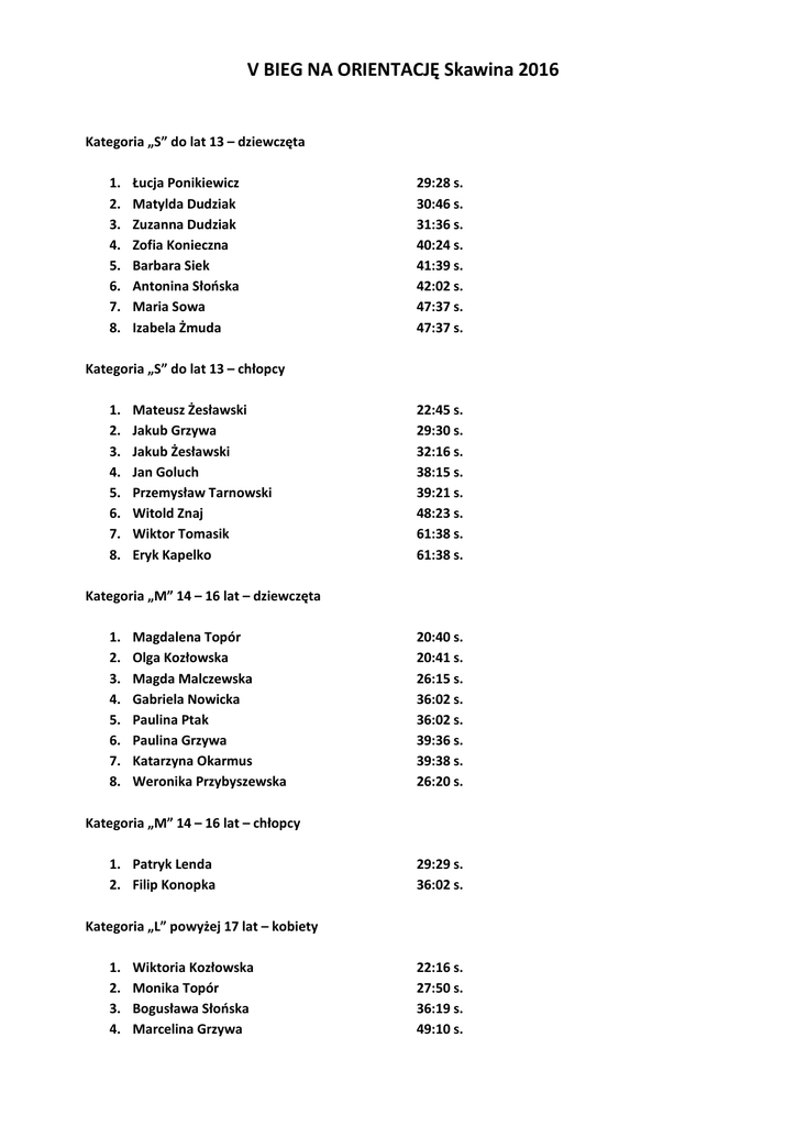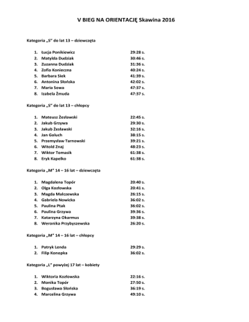V BIEG NA ORIENTACJĘ Skawina 2016 Kategoria „S” do lat 13 – dziewczęta 1. 2. 3. 4. 5. 6. 7. 8. Łucja Ponikiewicz Matylda Dudziak Zuzanna Dudziak Zofia Konieczna Barbara Siek Antonina Słońska Maria Sowa Izabela Żmuda 29:28 s. 30:46 s. 31:36 s. 40:24 s. 41:39 s. 42:02 s. 47:37 s. 47:37 s. Kategoria „S” do lat 13 – chłopcy 1. 2. 3. 4. 5. 6. 7. 8. Mateusz Żesławski Jakub Grzywa Jakub Żesławski Jan Goluch Przemysław Tarnowski Witold Znaj Wiktor Tomasik Eryk Kapelko 22:45 s. 29:30 s. 32:16 s. 38:15 s. 39:21 s. 48:23 s. 61:38 s. 61:38 s. Kategoria „M” 14 – 16 lat – dziewczęta 1. 2. 3. 4. 5. 6. 7. 8. Magdalena Topór Olga Kozłowska Magda Malczewska Gabriela Nowicka Paulina Ptak Paulina Grzywa Katarzyna Okarmus Weronika Przybyszewska 20:40 s. 20:41 s. 26:15 s. 36:02 s. 36:02 s. 39:36 s. 39:38 s. 26:20 s. Kategoria „M” 14 – 16 lat – chłopcy 1. Patryk Lenda 2. Filip Konopka 29:29 s. 36:02 s. Kategoria „L” powyżej 17 lat – kobiety 1. 2. 3. 4. Wiktoria Kozłowska Monika Topór Bogusława Słońska Marcelina Grzywa 22:16 s. 27:50 s. 36:19 s. 49:10 s. Kategoria „L” powyżej 17 lat – mężczyźni 1. 2. 3. 4. 5. 6. 7. Michał Topór Radosław Tarnowski Marek Topór Michał Dudziak Bartosz Konopka Wojciech Żesławski Grzegorz Widz 17:01 s. 21:40 s. 21:58 s. 26:49 s. 26:52 s. 29:29 s. brak jednego PK Kategoria „V” powyżej 50 lat 1. Robert Konieczny 2. Teresa Szymańska 3. Jerzy Szymański 26:45 s. 70:09 s. 70:10 s. Kategoria „R” rodzinna 1. 2. 3. 4. 5. 6. 7. 8. 9. 10. 11. 12. 13. 14. 15. 16. 17. Łukasz i Wiktoria Kurlit Jacek i Michał Goluch Karol i Edyta Goluch Bogusław i Wiktor Balza Iga i Martyna Balza Aleksander i Bartłomiej Styrylski Kamil i Mirosław Ożóg Bibiana i Oliwia Ślizowscy Błażej i Artur Znaj Marta, Szymon i Maja Konopka Krzysztof, Ignacy i Stanisław Czech Paweł, Michał i Aleksandra Moszkowicz Michał i Antonina Dudziak Katarzyna i Jakub Mucha Bartosz i Magdalena Mucha Monika i Anna Moszkowicz Radosław, Michał i Julia Cygan-Malicki 20:22 s. 21:07 s. 21:18 s. 21:54 s. 21:54 s. 23:04 s. 24:53 s. 25:59 s. 26.06 s. 26:30 s. 27:03 s. 29:16 s. 31:30 s. 32:28 s. 34:34 s. 40:44 s. 66:46 s.