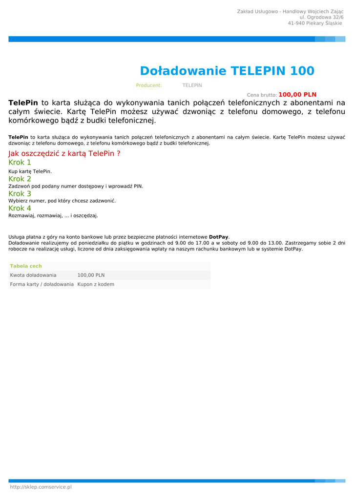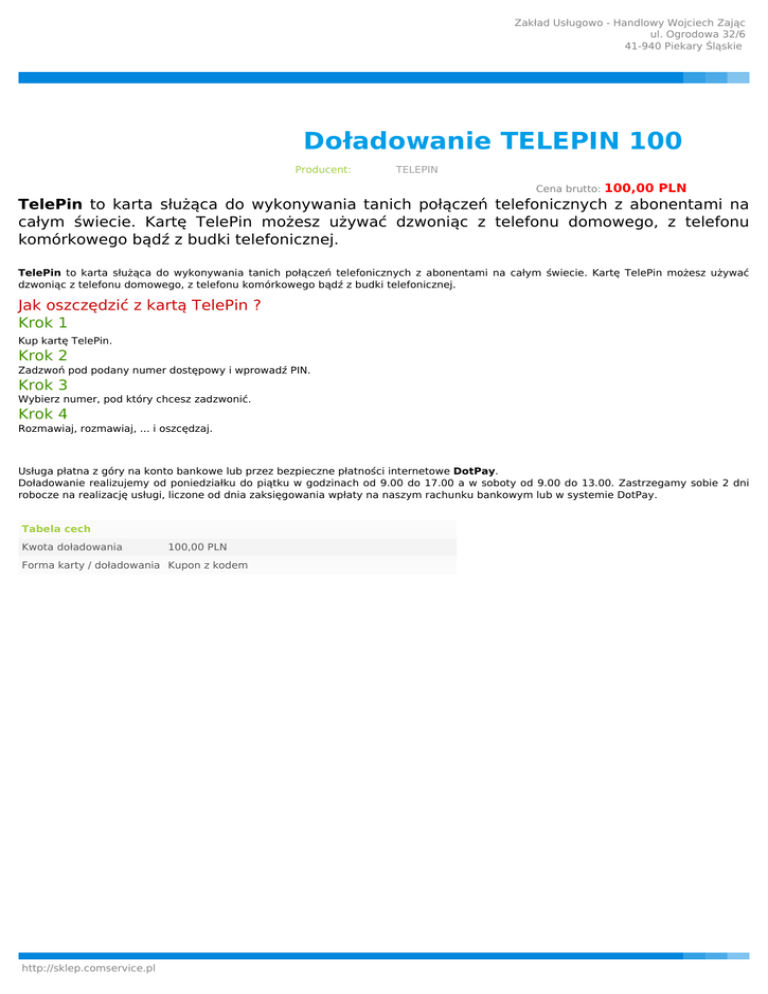 Zakład Usługowo - Handlowy Wojciech Zając ul. Ogrodowa 32/6 41-940 Piekary Śląskie Doładowanie TELEPIN 100 Producent: TELEPIN Cena brutto: 100,00 PLN TelePin to karta służąca do wykonywania tanich połączeń telefonicznych z abonentami na całym świecie. Kartę TelePin możesz używać dzwoniąc z telefonu domowego, z telefonu komórkowego bądź z budki telefonicznej. TelePin to karta służąca do wykonywania tanich połączeń telefonicznych z abonentami na całym świecie. Kartę TelePin możesz używać dzwoniąc z telefonu domowego, z telefonu komórkowego bądź z budki telefonicznej. Jak oszczędzić z kartą TelePin ? Krok 1 Kup kartę TelePin. Krok 2 Zadzwoń pod podany numer dostępowy i wprowadź PIN. Krok 3 Wybierz numer, pod który chcesz zadzwonić. Krok 4 Rozmawiaj, rozmawiaj, ... i oszcędzaj. Usługa płatna z góry na konto bankowe lub przez bezpieczne płatności internetowe DotPay. Doładowanie realizujemy od poniedziałku do piątku w godzinach od 9.00 do 17.00 a w soboty od 9.00 do 13.00. Zastrzegamy sobie 2 dni robocze na realizację usługi, liczone od dnia zaksięgowania wpłaty na naszym rachunku bankowym lub w systemie DotPay. Tabela cech Kwota doładowania 100,00 PLN Forma karty / doładowania Kupon z kodem http://sklep.comservice.pl