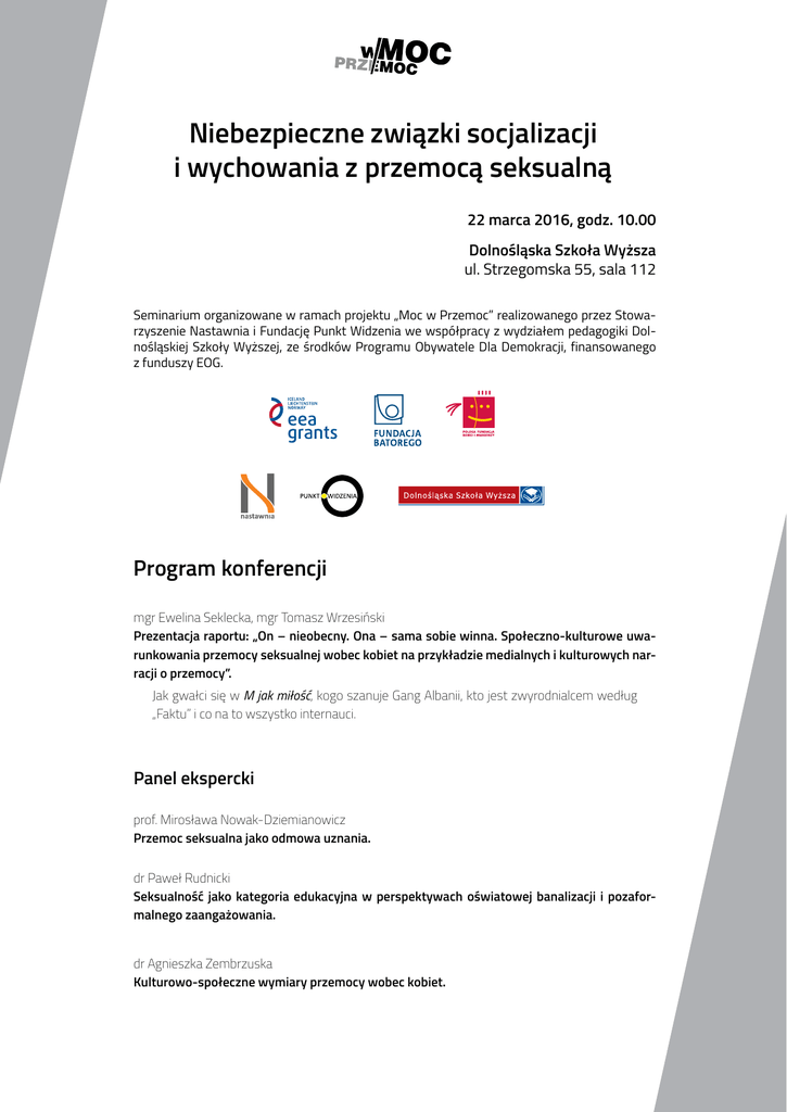 Niebezpieczne związki socjalizacji i wychowania z przemocą seksualną 22 marca 2016, godz. 10.00 Dolnośląska Szkoła Wyższa ul. Strzegomska 55, sala 112 Seminarium organizowane w ramach projektu „Moc w Przemoc” realizowanego przez Stowarzyszenie Nastawnia i Fundację Punkt Widzenia we współpracy z wydziałem pedagogiki Dolnośląskiej Szkoły Wyższej, ze środków Programu Obywatele Dla Demokracji, finansowanego z funduszy EOG. Program konferencji mgr Ewelina Seklecka, mgr Tomasz Wrzesiński Prezentacja raportu: „On – nieobecny. Ona – sama sobie winna. Społeczno-kulturowe uwarunkowania przemocy seksualnej wobec kobiet na przykładzie medialnych i kulturowych narracji o przemocy”. Jak gwałci się w M jak miłość, kogo szanuje Gang Albanii, kto jest zwyrodnialcem według „Faktu” i co na to wszystko internauci. Panel ekspercki prof. Mirosława Nowak-Dziemianowicz Przemoc seksualna jako odmowa uznania. dr Paweł Rudnicki Seksualność jako kategoria edukacyjna w perspektywach oświatowej banalizacji i pozaformalnego zaangażowania. dr Agnieszka Zembrzuska Kulturowo-społeczne wymiary przemocy wobec kobiet. Dyskusja – możliwe strategie edukacyjne Karolina Wanat i Daria Czech – studentki pedagogiki UW 50 twarzy Greya i edukacja seksualna oczami studentek i studentów. mgr Kamila Ziobrowska Przemoc seksualna - działania prewencyjne, działania resocjalizacyjne. mgr Ewelina Seklecka „Społeczeństwo chciało przeszkodzić w wykryciu prawd nie do zniesienia.” – refleksje i wnioski ze szkoleń nt. przemocy seksualnej wobec kobiet dla mężczyzn, policjantek i policjantów. Zapraszamy!