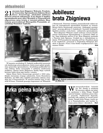 aktualnoci 21 stycznia brat Zbigniew Wo³czyk, Prze³o¿ony Generalny Zgromadzenia Zakonu Braci Serca Jezusowego, obchodzi³ jubileusz 25-lecia wiêceñ zakonnych. Z tej okazji w kaplicy zgromadzenia przy ulicy Wysokiej w Puszczykowie odprawiono mszê wiêt¹ w intencji jubilata. Mszy wiêtej przewodniczy³ Metropolita Poznañski, arcybiskup Stanis³aw G¹decki. W kazaniu arcybiskup S. G¹decki podkrela³ znaczenie roli duchowego przewodnictwa, któr¹ musi pe³niæ prze³o¿ony generalny zgromadzenia. Arcybiskup podkrela³ te¿ rolê rodziny, która zaszczepi³a w jubilacie umi³owanie modlitwy. Oprócz brata Zbigniewa s³u¿bê Bogu wybrali bowiem tak¿e dwaj jego bracia i siostra. Zakon Braci Serca Jezusowego powsta³ w 1918 roku. Dziêki staraniom swojego za³o¿yciela, brata Stanis³awa Kubiaka, od 1923 roku siedziba generalna zakonu znajduje siê w Puszczykowie. W naszym miecie ¿yje 14 sporód 54 braci. Pozostali pracuj¹ rozproszeni we W³oszech Arka pe³na kolêd 3 Jubileusz brata Zbigniewa i Niemczach. Pozornie niedu¿y, puszczykowski zakon nale¿y do najwiêkszych zgromadzeñ brackich na wiecie. Bracia Serca Jezusowego nazywani ,,biskupimi asystentami, pracuj¹ g³ównie w katedrach i kuriach biskupich. Zgodnie zreszt¹ z wol¹ brata - za³o¿yciela zgromadzenia. Brat Zbigniew Wo³czyk zosta³ wybrany nowym Prze³o¿onym Generalnym Zgromadzenia w kwietniu 2005 roku. Jego kadencja potrwa 6 lat. Brat Zbigniew pochodzi z Turowic ko³o Opoczna. Urodzi³ siê w wielodzietnej rodzinie. W Puszczykowie mieszka od 9 lat. Przedtem przez 6 lat studiowa³ i pracowa³ w Papieskim Kolegium Polskim w Rzymie. Przez 3 lata blisko wspó³pracowa³ z Prymasem Polski. Red Brat Z. Wo³czyk podziêkowa³ wszystkim uczestnicz¹cym we Mszy w. W puszczykowskim kociele pw. w. Józefa w niedzielê 22 stycznia odby³o siê kolejne spotkanie z Ark¹ Noego. Zespó³ piewa³ kolêdy i ulubione przez dzieci piosenki. Publicznoæ dopisa³a, przysz³y ca³e rodziny ze swymi pociechami. Zespó³ Arka Noego, czêsty goæ w Puszczykówku, jest bardzo lubiany przez dzieci i doros³ych. Red