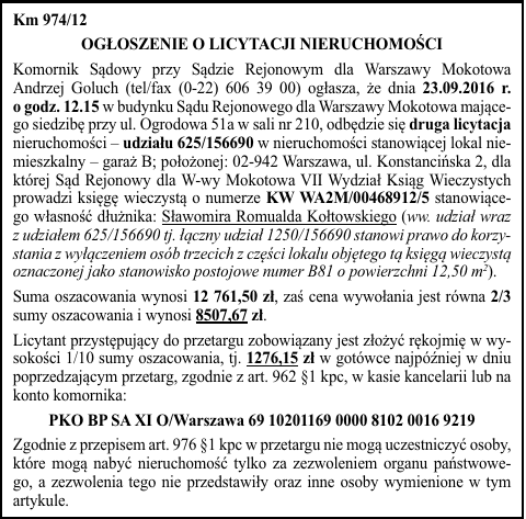 Km 974/12 OGŁOSZENIE O LICYTACJI NIERUCHOMOŚCI Komornik Sądowy przy Sądzie Rejonowym dla Warszawy Mokotowa Andrzej Goluch (tel/fax (0-22) 606 39 00) ogłasza, że dnia 23.09.2016 r. o godz. 12.15 w budynku Sądu Rejonowego dla Warszawy Mokotowa mającego siedzibę przy ul. Ogrodowa 51a w sali nr 210, odbędzie się druga licytacja nieruchomości – udziału 625/156690 w nieruchomości stanowiącej lokal niemieszkalny – garaż B; położonej: 02-942 Warszawa, ul. Konstancińska 2, dla której Sąd Rejonowy dla W-wy Mokotowa VII Wydział Ksiąg Wieczystych prowadzi księgę wieczystą o numerze KW WA2M/00468912/5 stanowiącego własność dłużnika: Sławomira Romualda Kołtowskiego (ww. udział wraz z udziałem 625/156690 tj. łączny udział 1250/156690 stanowi prawo do korzystania z wyłączeniem osób trzecich z części lokalu objętego tą księgą wieczystą oznaczonej jako stanowisko postojowe numer B81 o powierzchni 12,50 m2). Suma oszacowania wynosi 12 761,50 zł, zaś cena wywołania jest równa 2/3 sumy oszacowania i wynosi 8507,67 zł. Licytant przystępujący do przetargu zobowiązany jest złożyć rękojmię w wysokości 1/10 sumy oszacowania, tj. 1276,15 zł w gotówce najpóźniej w dniu poprzedzającym przetarg, zgodnie z art. 962 §1 kpc, w kasie kancelarii lub na konto komornika: PKO BP SA XI O/Warszawa 69 10201169 0000 8102 0016 9219 Zgodnie z przepisem art. 976 §1 kpc w przetargu nie mogą uczestniczyć osoby, które mogą nabyć nieruchomość tylko za zezwoleniem organu państwowego, a zezwolenia tego nie przedstawiły oraz inne osoby wymienione w tym artykule.