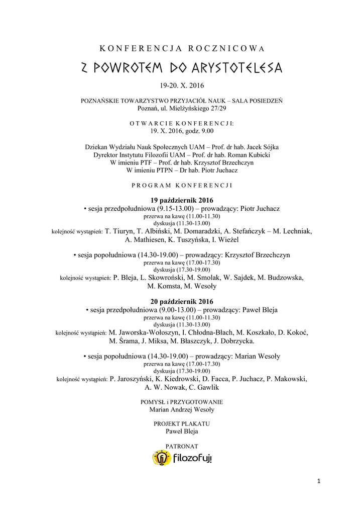 KONFERENCJA ROCZNICOWA 19-20. X. 2016 POZNAŃSKIE TOWARZYSTWO PRZYJACIÓŁ NAUK – SALA POSIEDZEŃ Poznań, ul. Mielżyńskiego 27/29 O T W A R C I E K O N F E R E N C J I: 19. X. 2016, godz. 9.00 Dziekan Wydziału Nauk Społecznych UAM – Prof. dr hab. Jacek Sójka Dyrektor Instytutu Filozofii UAM – Prof. dr hab. Roman Kubicki W imieniu PTF – Prof. dr hab. Krzysztof Brzechczyn W imieniu PTPN – Dr hab. Piotr Juchacz PROGRAM KONFERENCJI 19 październik 2016 • sesja przedpołudniowa (9.15-13.00) – prowadzący: Piotr Juchacz przerwa na kawę (11.00-11.30) dyskusja (11.30-13.00) kolejność wystąpień: T. Tiuryn, T. Albiński, M. Domaradzki, A. Stefańczyk – M. Lechniak, A. Mathiesen, K. Tuszyńska, I. Wieżel • sesja popołudniowa (14.30-19.00) – prowadzący: Krzysztof Brzechczyn przerwa na kawę (17.00-17.30) dyskusja (17.30-19.00) kolejność wystąpień: P. Bleja, L. Skowroński, M. Smolak, W. Sajdek, M. Budzowska, M. Komsta, M. Wesoły 20 październik 2016 • sesja przedpołudniowa (9.00-13.00) – prowadzący: Paweł Bleja przerwa na kawę (11.00-11.30) dyskusja (11.30-13.00) kolejność wystąpień: M. Jaworska-Wołoszyn, I. Chłodna-Błach, M. Koszkało, D. Kokoć, M. Śrama, J. Miksa, M. Błaszczyk, J. Dobrzycka. • sesja popołudniowa (14.30-19.00) – prowadzący: Marian Wesoły przerwa na kawę (17.00-17.30) dyskusja (17.30-19.00) kolejność wystąpień: P. Jaroszyński, K. Kiedrowski, D. Facca, P. Juchacz, P. Makowski, A. W. Nowak, C. Gawlik POMYSŁ i PRZYGOTOWANIE Marian Andrzej Wesoły PROJEKT PLAKATU Paweł Bleja PATRONAT 1 KOLEJNOŚĆ I TYTUŁY WYSTĄPIEŃ 19 październik 2016 SESJA PRZEDPOŁUDNIOWA (9.15-13.00) 1) Dr Tomasz Tiuryn Język i znaczenie w filozofii Arystotelesa. Rozważania na marginesie Peri hermeneias 2) Dr Tomasz Albiński O problemie kwadratu logicznego dla sylogistyki modalnej Arystotelesa 3) Dr hab. Mikołaj Domaradzki Problem wieloznaczności w dialektyce Arystotelesa. Filologiczno-filozoficzna rekonstrukcja Top. 1.15. 4) Dr Andrzej Stefańczyk, Dr hab. Marek Lechniak Entymemat w teorii retoryki Arystotelesa 5) Mgr Aleksandra Mathiesen Logos – ethos – pathos. Środki przekonywania w retoryce Arystotelesa 6) Prof. zw. dr hab. Krystyna Tuszyńska Arystotelesowska definicja tragedii (Poet.1449 b 24-28) a definicja sofisty Gorgiasza (DK 82B23) w kontekście relacji dramaturg – widz. 7) Dr Iwona Wieżel Arystoteles jako prekursor badań narratologicznych (Poet. 1450b) SESJA POPOŁUDNIOWA (14.30-19.00) 1) Dr Paweł Bleja «O dobru orzeka się wielorako» – Z powrotem do agathologii Arystotelesa 2) Dr Leszek Skowroński O braku moralności w etyce Arystotelesa 3) Dr Maciej Smolak Problematyka odpowiedzialności w etyce Arystotelesa 4) Dr hab. Wiesława Sajdek „Istota państwowa”, „istota społeczna”, czy „zwierzę stadowe”? Definicja człowieka w kontekście Polityki Arystotelesa. 5) Dr Małgorzata Budzowska Emocje w procesie decyzyjnym według Arystotelesa 6) Dr hab. Monika A. Komsta Jedność księgi XII Metafizyki Arystotelesa w świetle analiz Temistiusza. Bóg jako intelekt. 7) Prof. dr hab. Marian A. Wesoły Co było podstawą dla filozofii Arystotelesa? 2 20 październik 2016 SESJA PRZEDPOŁUDNIOWA (9.00-13.00) 1) Dr Magdalena Jaworska-Wołoszyn Arystotelesa zaginiony Sympozjon, czyli o winopiciu. Treść ocalałych świadectw i fragmentów. 2) Dr Imelda Chłodna-Błach Rola wielkoduszności u Arystotelesa i św. Tomasza z Akwinu 3) Dr Martyna Koszkało Różnica między racjonalnymi a irracjonalnymi potencjami (Arystoteles Metafizyka 1046b) oczami Jana Dunsa Szkota 4) Dr Damian Kokoć Awerroes i esencjalna reinterpretacja metafizyki Arystotelesa 5) Lic. Marcin Śrama Recepcja logiki arystotelesowskiej w Dialektyce Johannesa Caesariusa 6) Dr Joanna Miksa Arystoteles i Kant o roli wychowania w życiu moralnym podmiotu 7) Mgr Marek Błaszczyk Arystotelesa koncepcja przyjaźni a współczesne filozoficzne teorie miłości 8) Mgr Joanna Dobrzycka Cnoty według Arystotelesa w ujęciu Alasdaira Macintyre'a SESJA POPOŁUDNIOWA (14.30-19.00) 1) Prof. dr hab. Piotr Jaroszyński Arystoteles wobec trzech koncepcji retoryki 2) Dr Krzysztof Kiedrowski Metafizyczne podstawy psychologii poznania Arystotelesa 3) Prof. dr hab. Danilo Facca Aristoteles i mind-body problem 4) Dr hab. Piotr W. Juchacz Inspiracje Arystotelesowe: zbiorowa mądrość obywateli jako źródło legitymizacji władzy politycznej 5) Dr Piotr Makowski Wątki arystotelesowskie w prakseologii Tadeusza Kotarbińskiego 6) Dr Andrzej W. Nowak Czasoprzestrzenne uwarunkowanie – phronesis wg. Arystotelesa a zwrot ontologiczny we współczesnych studiach nad nauką i techniką 7) Cyprian Gawlik Pojęcie prawdy u Arystotelesa w świetle fenomenologicznej interpretacji Martina Heideggera 3 ABSTRAKTY W UJĘCIU ALFABETYCZNYM Dr Tomasz Albiński Instytut Filozofii UAM [email protected] O PROBLEMIE KWADRATU LOGICZNEGO DLA SYLOGISTYKI MODALNEJ ARYSTOTELESA Nasz wniosek jest zatem taki: tak jak ogół towarzyszy szczegółowi, tak możliwe towarzyszy koniecznemu, chociaż nie w każdym znaczeniu słowa. Może istotnie konieczność i jej nieobecność są pierwszymi zasadami wszystkiego, co istnieje i nie istnieje, a wszystko inne trzeba uznać jako ich następstwa. Arystoteles, De Int.13, 23a Wynalazek kwadratu logicznego przypisywany jest Apulejuszowi z Madaury (II w n.e.), który w dziele Peri Hermeneias zawarł opis tego narzędzia. Tym niemniej historycy logiki zgodnie wskazują na miejsca w pismach Arystotelesa, w oparciu o które dają się skonstuować odpowiednie diagramy (np. De Int. 6-7, 17a-18a, De Int. 12-13, 21b-23a, An. Pr. II 15, 63b). Ustęp De Int. 17a-18a pozwala na skonstruowanie kwadratu logicznego dla kategorycznych zdań asertorycznych, podobnie jak wskazany fragment z Analityk. Z kolei fragment De Int. 12-13, 21b-23a umożliwia zbudowanie tzw. modalnego kwadratu opozycji. Oba kwadraty są różnymi narzędziami: pierwszy ukazuje związki logiczne po