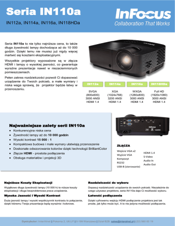Seria IN110a IN112a, IN114a, IN116a, IN118HDa Seria IN110a to nie tylko najniższa cena, to także długa żywotność lampy dochodząca aż do 10 000 godzin. Dzięki temu nie musisz już nigdy więcej martwić się kosztami eksploatacyjnymi. Wszystkie projektory wyposażone są w złącza HDMI i lampy o wysokiej jasności, co gwarantuje wyraźne prezentacje nawet w niezaciemnionych pomieszczeniach. Pełen zakres rozdzielczości pozwoli Ci dopasować urządzenie do Twoich potrzeb, a małe wymiary i niska waga sprawią, że projektor będzie łatwy w przenoszeniu. IN112a IN114a IN116a IN118HDa SVGA (800x600) 3000 ANSI HDMI 1.4 XGA (1024x768) 3200 ANSI HDMI 1.4 WXGA (1280x800) 3000 ANSI HDMI 1.4 Full HD (1920x1080) 3000 ANSI HDMI 1.4 Najważniejsze zalety serii IN110a Konkurencyjna niska cena Żywotność lampy aż do 10 000 godzin Wysoki kontrast 15 000 : 1 Kompaktowa budowa i małe wymary ułatwiają przenoszenie Doskonałe odwzorowanie kolorów dzięki technologii BrilliantColor Złącze HDMI - prostota podłączenia Obsługa materiałów i projekcji 3D ZŁĄCZA Wejście VGA x2 Wyjście VGA Kompozyt RS232 USB-B (sterowanie) HDMI 1.4 S-Video Audio In Audio Out Najniższe Koszty Eksploatacji Rozdzielczość do wyboru Wyjątkowo długa żywotność lampy (10 000 h) to niższe koszty eksploatacji i długa bezproblemowa praca urządzenia. Dopasuj rozdzielczość urządzenia do swoich potrzeb. Niezależnie do czego używasz projektora, seria IN110a daje Ci możliwość wyboru. Wysoka Jasność i Wysoki Kontrast Łatwość podłączenia Duża jasność lampy i wysoki współczynnik kontrastu to połączenie, dzięki któremu Twoje prezentacje będą wyraźnie i kolorowe. Dzięki cyfrowemu wejścju HDMI podłączenie projektora jest tak proste, jak tylko może być. A to nie jedyna możliwość podłączenia. Dystrybutor: InterAlnet | Pokorna 2, U6,U7 | 0-199 Warszawa | Dział B2B: [email protected] | (22) 560 00 19