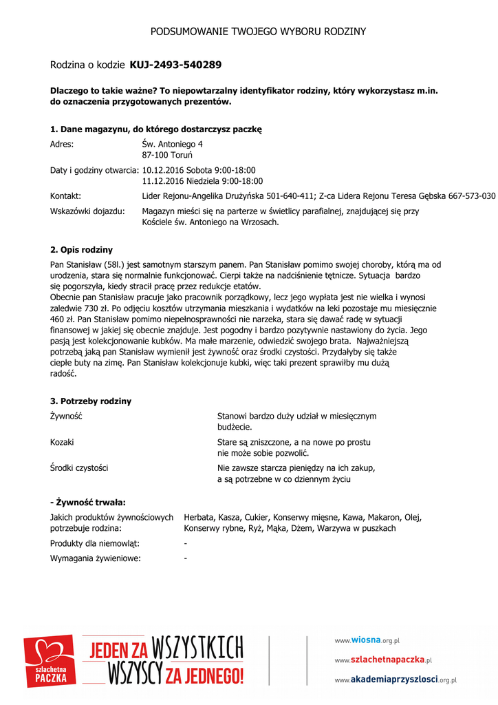 PODSUMOWANIE TWOJEGO WYBORU RODZINY Rodzina o kodzie KUJ-2493-540289 Dlaczego to takie ważne? To niepowtarzalny identyfikator rodziny, który wykorzystasz m.in. do oznaczenia przygotowanych prezentów. 1. Dane magazynu, do którego dostarczysz paczkę Adres: Św. Antoniego 4 87-100 Toruń Daty i godziny otwarcia: 10.12.2016 Sobota 9:00-18:00 11.12.2016 Niedziela 9:00-18:00 Kontakt: Lider Rejonu-Angelika Drużyńska 501-640-411; Z-ca Lidera Rejonu Teresa Gębska 667-573-030 Wskazówki dojazdu: Magazyn mieści się na parterze w świetlicy parafialnej, znajdującej się przy Kościele św. Antoniego na Wrzosach. 2. Opis rodziny Pan Stanisław (58l.) jest samotnym starszym panem. Pan Stanisław pomimo swojej choroby, którą ma od urodzenia, stara się normalnie funkcjonować. Cierpi także na nadciśnienie tętnicze. Sytuacja bardzo się pogorszyła, kiedy stracił pracę przez redukcje etatów. Obecnie pan Stanisław pracuje jako pracownik porządkowy, lecz jego wypłata jest nie wielka i wynosi zaledwie 730 zł. Po odjęciu kosztów utrzymania mieszkania i wydatków na leki pozostaje mu miesięcznie 460 zł. Pan Stanisław pomimo niepełnosprawności nie narzeka, stara się dawać radę w sytuacji finansowej w jakiej się obecnie znajduje. Jest pogodny i bardzo pozytywnie nastawiony do życia. Jego pasją jest kolekcjonowanie kubków. Ma małe marzenie, odwiedzić swojego brata. Najważniejszą potrzebą jaką pan Stanisław wymienił jest żywność oraz środki czystości. Przydałyby się także ciepłe buty na zimę. Pan Stanisław kolekcjonuje kubki, więc taki prezent sprawiłby mu dużą radość. 3. Potrzeby rodziny Żywność Stanowi bardzo duży udział w miesięcznym budżecie. Kozaki Stare są zniszczone, a na nowe po prostu nie może sobie pozwolić. Środki czystości Nie zawsze starcza pieniędzy na ich zakup, a są potrzebne w co dziennym życiu - Żywność trwała: Jakich produktów żywnościowych potrzebuje rodzina: Herbata, Kasza, Cukier, Konserwy mięsne, Kawa, Makaron, Olej, Konserwy rybne, Ryż, Mąka, Dżem, Warzywa w puszkach Produkty dla niemowląt: - Wymagania żywieniowe: - PODSUMOWANIE TWOJEGO WYBORU RODZINY Rodzina o kodzie KUJ-2493-540289 Inne produkty żywnościowe: słodycze, mleko - Środki czystości Jakich środków czystości potrzebuje rodzina: Proszek do prania, Płyn do mycia naczyń, Mydło/żel myjący, Pasta do zębów, Płyny czyszczące, Szampon, Szczoteczka do zębów Artykuły dziecięce: - Inne: produkty do golenia, golarki - Obuwie Stanisław Rodzaj obuwia: zimowe Kategoria: kozaki Rozmiar: 44 Uwagi: ciemne - Wyposażenie mieszkania Jakiego wyposażenia mieszkania potrzebuje rodzina: Ręczniki, Pościel - Specjalne upominki Pan Stanisław kolekcjonuje kubki, więc myślę, że jakiś ładny specyficzny kubek sprawiłby mu radość. 4. Osoby opiekujące sie rodziną - Wolontariusz opiekun rodziny E-mail: [email protected] - Lider Rejonu Imię i nazwisko: Angelika Drużyńska 5. Mamy dla Ciebie kilka wskazówek, ważnych w przygotowaniu Paczki. * Paczki możesz dostarczyć wyłącznie do tego magazynu, z którego wybrana została rodzina. Wyjątkiem PODSUMOWANIE TWOJEGO WYBORU RODZINY Rodzina o kodzie KUJ-2493-540289 jest sytuacja, kiedy wybierzesz rodzinę z innego województwa, wtedy możesz dostarczyć paczkę do Magazynu Zastępczego znajdującego się w Twoim województwie (dane adresowe zamieszczone są na stronie wyboru rodziny). * Pamiętaj, że po wybraniu przez Ciebie rodziny nikt inny nie będzie już dla niej przygotowywał paczki. * Nie musisz zakupić wszystkich rzeczy z listy. Pamiętaj jednak, że wybierając rodzinę decydujesz się w pierwszej kolejności zaspokoić 3 najważniejsze potrzeby, które rodzina wymieniła w opisie. Zwróć jednak uwagę, że wszystkie wymienione rzeczy są dla rodziny bardzo ważne. * Rzeczy, które podarujesz rodzinie powinny być dla niej prezentem. Nie muszą być one nowe, a jeśli są używane – niech będą zadbane. Paczka przygotowywana jest z myślą o drugim człowieku – jest jak prezent. Przygotuj paczkę tak, by podniosła poczucie własnej wartości u obdarowanych przez Ciebie osób. * Paczki powinny być podzielone na kilka, poręcznych, niezbyt ciężkich pudeł, prosimy nie dostarczać do magazynu produktów zapakowanych w reklamówki czy worki foliowe. * Każde pudło powinno być opisane kodem rodziny oraz opatrzone numerem, pudła należy numerować według klucza: np. 1 z 5, 2 z 5 itd. * W Paczce powinny znaleźć się suche i trwałe artykuły spożywcze. Prosimy, aby nie pakować do pudeł produktów, które łatwo ulegają uszkodzeniu, wylaniu, rozgnieceniu. * Aby prezent nabrał świątecznego charakteru można owinąć pudła świątecznym papierem! Warto też dodać kilka słów od siebie dla rodziny – chociażby na świątecznej kartce, czy w liście. 6. Aby cała Polska mogła na żywo śledzić wyniki SZLACHETNEJ PACZKI… … w trakcie finału w magazynach będziemy wybierali informacje o wartości Paczki i liczbie osób zaangażowanych w jej przygotowanie. Jednak nie uda nam się to bez Twojego wsparcia. Możesz sprawić, że przekazywane w świat wyniki będą prawdziwe i ucieszą całą Polskę. Prosimy – w czasie wizyty w magazynie wypełnij kartę i wrzuć do pudełka. Badanie jest anonimowe, a jego wynik analizowany będzie jedynie w zbiorczym zestawieniu. Razem zmieniamy świat na lepsze!