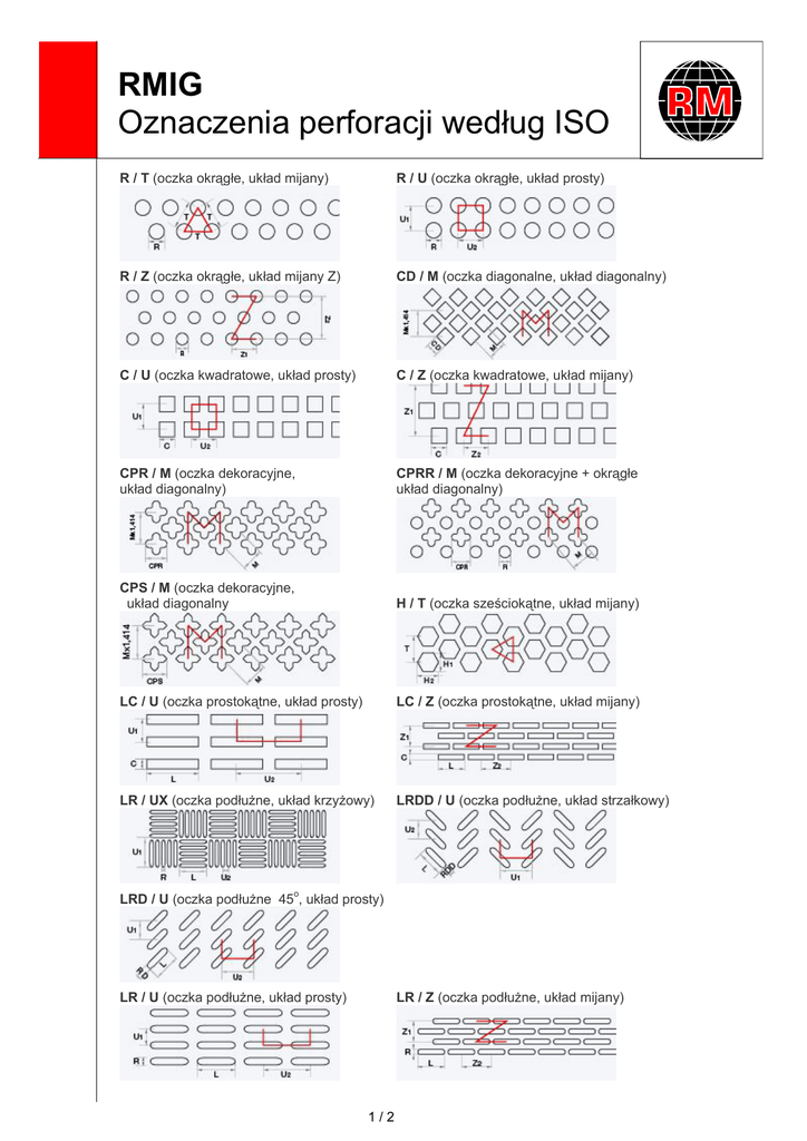 RMIG Oznaczenia perforacji według ISO R / T (oczka okrągłe, układ mijany) R / U (oczka okrągłe, układ prosty) R / Z (oczka okrągłe, układ mijany Z) CD / M (oczka diagonalne, układ diagonalny) C / U (oczka kwadratowe, układ prosty) C / Z (oczka kwadratowe, układ mijany) CPR / M (oczka dekoracyjne, układ diagonalny) CPRR / M (oczka dekoracyjne + okrągłe układ diagonalny) CPS / M (oczka dekoracyjne, układ diagonalny H / T (oczka sześciokątne, układ mijany) LC / U (oczka prostokątne, układ prosty) LC / Z (oczka prostokątne, układ mijany) LR / UX (oczka podłużne, układ krzyżowy) LRDD / U (oczka podłużne, układ strzałkowy) LRD / U (oczka podłużne 45o, układ prosty) LR / U (oczka podłużne, układ prosty) LR / Z (oczka podłużne, układ mijany) 1/2 RMIG Oznaczenia perforacji według ISO LREMF / T (sito do sortowników płaskie, układ mijany) LREMR / T (sito do sortowników zaokrąglone, układ mijany) LTNP / Z (sito noskowe, układ mijany) LT / Z (siatka cięto-ciągniona, układ mijany) POLR (sito daszkowe - zamknięte) PCLR (sito daszkowe - otwarte) R) / Z (Perfocon okrągły, układ mijany) R] / Z (Perfocon płaski, układ mijany) CIR / T (perforacja kołnierzowa układ mijany) RC / T (oczka z wgłębieniem stożkowym, układ mijany) RI / M (perforacja karbowana, układ diagonalny) RI / T (perforacja karbowana, układ mijany) RI / U (perforacja karbowana, układ prosty) RI / Z (perforacja karbowana, układ mijany Z) R / M (oczka okrągłe, układ diagonalny) RR / T (oczka stożkowe, układ mijany) RR / U (oczka stożkowe, układ prosty) TTR / U (oczka trójkątne, układ prosty) 2/2