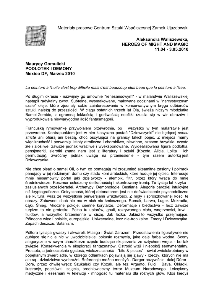 Materiały prasowe Centrum Sztuki Współczesnej Zamek Ujazdowski Aleksandra Waliszewska, HEROES OF MIGHT AND MAGIC 11.04 - 3.05.2010 Maurycy Gomulicki PODLOTEK I DEMONY Mexico DF, Marzec 2010 La peinture à l'huile c'est trop difficile mais c'est beaucoup plus beau que la peinture à l'eau. Po długim okresie - nazwijmy go umownie "renesansowym" - w malarstwie Waliszewskiej nastąpił radykalny zwrot. Subtelne, wysmakowane, malowane godzinami w "narcystycznym szale" oleje, które zjednały sobie zainteresowanie w konserwatywnym kręgu odbiorców sztuki, należą do przeszłości. W ciągu ostatnich trzech lat Ola, świeża niczym młodziutka Bambi-Zombie, z ogromną lekkością i gorliwością neofitki rzuciła się w wir obrazów i wyprodukowała niewiarygodną ilość fantasmagorii. Francuską rymowankę przywołałem przewrotnie, bo i wszystko w tym malarstwie jest przewrotne. Kontrapunktem jest w nim klasyczna postać "Dziewczynki" nie będącej sensu stricte ani ofiarą ani bestią, choć oscylująca na granicy takich pojęć. Z miejsca mamy więc kruchość i perwersję. Istoty atroficzne i chorobliwe, niewinne, czasem brzydkie, często złe i złośliwe, zawsze jednak wrażliwe i wyeksponowane. Wyidealizowana figura podlotka, pensjonarki, sierotki znana nam jest z literatury i sztuki (Kozeta, Alicja, Lolita i ich permutacje), zwróćmy jednak uwagę na przeniesienie - tym razem autorką jest Dziewczynka. Nie chcę pisać o samej Oli, o tym co pomagają mi zrozumieć aksamitne zasłony i półmrok panujący w jej rodzinnym domu czy stado koni arabskich, które hoduje jej ojciec. Interesuje mnie niesamowity portal jaki dziś tworzy - alembik, filtr, przez który wraca do mnie średniowiecze. Koszmar osłodzony delikatnością i skontrowany ironią. To tysiąc lat krzyku i zasiusianych prześcieradeł. Archetypy. Demonologie. Bestiaria. Alegorie bardziej intuicyjne niż kryptograficzne. Oniryczność, której detonatorem jest nie doświadczenie psychodeliczne ale kultura, wraz ze wszystkimi perwersjami wrażliwości. Z mgły i sproszkowanej kości te obrazy. Zabawne, choć nie ma w nich nic śmiesznego. Rumak, Larwa, Luger. Mokradła, Łąki, Śnieg. Mroczne pokoje, ciemne korytarze. Deformacje i biedactwa - lecz zawsze turpizm to nie groteska. Pełno tu upiorów, ghuli, rozrywanego ciała, wnętrzności, krwi i fluidów, a wszystko brzemienne w ciszę. Jak łezka. Jakież to wszystko przejmujące. Północne więc i polskie, europejskie. Uniwersalne, lecz nie-tropikalne. Zmory i Dziewczątka. Zapach deszczu. Satanizm. Półtora tysiąca gwaszy i akwareli. Miazga i Świat Zarazem. Przedstawienia figuratywne nie gubiące się nic a nic w uwodzicielskiej pokusie rozmycia, jaką daje farba wodna. Sceny alegoryczne w swym charakterze często budzące skojarzenia ze sztychem wręcz - bo tak zwięzłe. Konsekwencja w eksploracji fantazmatów. Ostrość wizji i niepokój sentymentalny. Prostota, a jednocześnie gęstość, wieloznaczność - "bits & pieces" - świat zwielokrotniony w popękanym zwierciadle, w którego odłamkach pojawiają się zjawy - rzeczy, których nie ma ale są - dziedzictwo wyobraźni. Referencje można mnożyć - Darger oczywiście, dalej Dürer i Doré, przez chwilę wręcz Szukalski czy Kozak, ale też Argento, Fulci i Bava. Okładki, ilustracje, pocztówki, zdjęcia, średniowieczny terror Muzeum Narodowego. Leksykony medyczne i esesmani w telewizji - mnogość tu materiału dla różnych głów. Ktoś kiedyś będzie to wszystko analizował, porządkował, dokona próby scalenia. Fotografie, ryciny, falshbacki z kina, sieci, życia - kultura tak dostępna w pulsie współczesności. Banalizm i brutalizm. Inkwizycja i Shibari, literatura niesamowita i komiks undergroundowy - cieszy mnie ta rozpiętość. To, że Ola nie jest przywiązana do sztuki współczesnej, ale do szeroko pojętej Kultury wyjątkowo sobie cenię - i to sprawia, że jej świat jest tak fascynujący i syntoniczny. A że przy okazji kocha małe brzydkie pieski i demony - tym ciekawiej. Kultura uwielbia koszmar i dziwaczność - obłaskawia je, ujawnia, żywi się nimi. Nowa Ola jest uniwersalna, a jednocześnie socjo-technologicznie współczesna: będąc malarką, jest też bytem internetowym - funkcjonuje tam, gdzie dziwność jest naturalnym przedmiotem uwagi. Kultura przechodzi w tej chwili fascynującą fazę dostępności, więc i ewaluacji potencjałów. Redefinujuje się naturalnie i nieustannie. To, co robi Ola, jest bardzo żywe właśnie w tej chwili. To eksperyment w mocnej fazie. Mała uśmiechnięta dziewczynka jest sama w laboratorium. Przygląda się, przywołuje i formułuje świat. Wdzięczy jej jestem za te wszystkie katarktyczne koszmary, którymi tak hojnie nas obdarza. Zamiast analizować dalej Waliszewską, proponuję przyjrzeć się otchłaniom kultury, które wyją z jej obrazków.