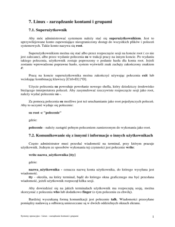 7. Linux - zarządzanie kontami i grupami 7.1. Superużytkownik Aby móc administrować systemem należy stać się superużytkownikiem. Jest to uprzywilejowane konto zapewniające nieograniczony dostęp do wszystkich plików i poleceń systemowych. Takie konto nazywa się root. Superużytkownikiem można się stać albo przez rozpoczęcie sesji na koncie root ( co nie jest zalecane), albo przez wydanie polecenia su w trakcji pracy na innym koncie. Po wydaniu takiego polecenia, użytkownik zostaje poproszony o podanie hasła dla konta root. Jeżeli zostanie wprowadzone poprawne hasło, system wyświetli znak zachęty zakończony znakiem #: Pracę na koncie superużytkownika można zakończyć używając polecenia exit lub wciskając kombinację klawiszy [Ctrl+D] [^D]. Użycie polecenia su powoduje powołanie nowego shella, który dziedziczy środowisko bieżącego interpretatora poleceń. Aby zasymulować rzeczywiste rozpoczęcie sesji jako root, należy wydać polecenie su -. Za pomocą polecenia su możliwe jest też uruchamianie jako root pojedynczych poleceń. Aby to uczynić wydaje się polecenie: su root -c "polecenie" gdzie: polecenie - należy zastąpić pełnym poleceniem zamierzonym do wykonania jako root. 7.2. Komunikowanie się z innymi i informacje o innych użytkownikach Często administrator musi przesłać wiadomość na terminal, przy którym pracuje użytkownik. Jednym ze sposobów wykonania tej czynności jest polecenie write: write nazwa_użytkownika [tty] gdzie: nazwa_użytkownika - oznacza nazwę konta użytkownika, do którego wysyłana jest wiadomość. tty - określa, na który terminal, bądź do którego okna graficznego ma być przesłana wiadomość, jeżeli użytkownik rozpoczął kilka sesji. Aby dowiedzieć się na jakich terminalach użytkownik ma rozpoczętą sesję, można skorzystać z polecenia who lub dodatkowo finger (o tym poleceniu za chwilę). Bardziej wyszukaną formą komunikacji jest polecenie talk. Wiadomości przesyłane pomiędzy nadawcą a odbiorcą umieszczane są w dwóch oddzielnych oknach ekranu. Systemy operacyjne - Linux - zarządzanie kontami i grupami 1 Gdy administrator ma coś do przekazania wszystkim użytkownikom systemu, może posłużyć się poleceniem wall. wall oznacza „pisz do wszystkich” (write all) i umożliwia jednoczesne przesłanie wiadomości do wszystkich pracujących użytkowników. Polecenie to wygląda następująco: wall Po czym następują linie komunikatu zakończone naciśnięciem [Ctrl+D] na początku nowej linii... ^D Podobnie jak w przypadku poleceń talk czy write, z wall mogą korzystać wszyscy użytkownicy, ale w celu ominięcia zabezpieczeń terminali nakładanych przez mesg n należy uruchamiać je jako superużytkownik. Polecenie mesg służy do włączania lub wyłączania przyjmowania wiadomości do użytkownika od innych użytkowników (oprócz superużytkownika). Administrator systemu wysyłając komunikat do użytkownika nie może być pewien, czy ten go otrzymał. Często bowiem zdarza się, że użytkownicy rozpoczynają sesję i odchodzą od swojego stanowiska pracy. Aby mieć pewność, że komunikat dotrze do odbiorcy, administrator może wykorzystać moment logowania się do systemu. W trakcie rozpoczynania sesji na ekranie wyświetlana jest cała zawartość pliku /etc/motd (Message Of The Day). Wielu informacji o użytkownikach dostarcza polecenie w: w 11:41am up 3:02, 4 users, load average: 0.00, 0.00, 0.00 USER TTY FROM LOGIN@ IDLE JCPU PCPU WHAT root vc/1 -8:39am 1:32 1.16s 1.07s -bash pardyka vc/2 -8:39am 3:01m 0.20s 0.10s -bash s01 vc/3 -9:26am 2:12m 3.73s 0.02s /bin/sh Pierwsza linia wyświetlana przez to polecenie zawiera ogólne informacje o systemie – godzinę, jak długo serwer pracuje (up 3:02), liczbę zalogowanych użytkowników (4 users) oraz obciążenie serwera w ciągu ostatniej minuty, 12 minut i 7 minut (load average: 0.00, 0.00, 0.00). Następne linie zawierają tabelaryczne zestawienie danych dotyczących zalogowanych użytkowników. W pierwszej kolumnie znajduje się identyfikator użytkownika. Druga kolumna zawiera nazwę terminala, z którego zalogowany jest dany użytkownik. Trzecią kolumnę stanowi nazwa hosta, z którego użytkownik się zalogował. Dalsze kolumny to kolejno: informacja, o której godzinie nastąpiło logowanie, jak długo użytkownik jest bezczynny, ile czasu procesora zajmuje obsługa danego terminala, ile czasu procesora zajmuje obsługa zadania wyświetlanego w ostatniej kolumnie oraz aktualnie wykonywane zadanie przez użytkownika. Jeśli chcielibyśmy uzykać tylko pierwszą linię informacji z polecenia w należy wpisać polecenie uptime. Komendą podobną do w jest finger. Komenda ta wyświetla dane w nieco innym formacie i dołącza dodatkowo pełną nazwę użytkownika, np: Systemy operacyjne - Linux - zarządzanie kontami i grupami 2 finger Login Name Tty Idle Login Time Office Office Phone pardyka Pardyka vc/2 31 Feb 22 08:39 root root *vc/1 30 Feb 22 08:39 s01 student vc/3 15 Feb 22 12:10 rok1 brak s01 student pts/0 14 Feb 22 12:11 rok1 brak Dodatkowo finger wyświetla informacje o tym, czy istnieje możliwość komunikacji z innym użytkownikiem (np. porozmawiać za pośrednictwem polecenia write bądź talk). Jeśli nie ma takiej możliwości, wówczas w kolumnie Tty pojawia się gwiazdka obok nazwy terminala (jak w przypadku użytkownika root). Polecenie finger pozwala nam otrzymać więcej informacji o konkretnym użytkowniku: finger [użytkownik] Przykład: finger root Login: root Name: root Directory: /root Shell: /bin/bash On since Fri Feb 22 08:39 (CET) on vc/1 2 minutes 10 seconds idle (messages off) No mail. No Plan. Z informacji tych można odczytać nie tylko pełną nazwę użytkownika, lecz również jego katalog domowy, powłokę, czy jest zalogowany, od kiedy, kiedy ostatnio był zalogowany, czy posiada pocztę, kiedy ją ostatnio czytał oraz dodatkowe informacje. Linux pozwala nam sprawdzić, kto i kiedy 