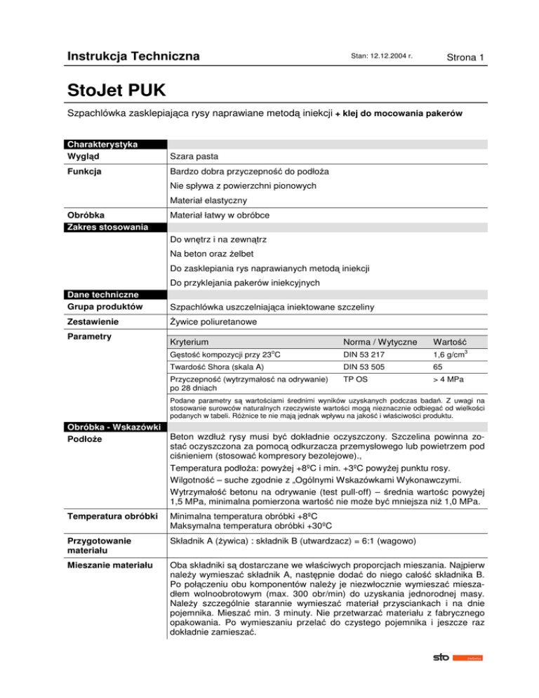 Instrukcja Techniczna Stan: 12.12.2004 r. Strona 1 StoJet PUK Szpachlówka zasklepiaj ca rysy naprawiane metod iniekcji + klej do mocowania pakerów Charakterystyka Wygl d Szara pasta Funkcja Bardzo dobra przyczepno do podło a Nie spływa z powierzchni pionowych Materiał elastyczny Obróbka Zakres stosowania Materiał łatwy w obróbce Do wn trz i na zewn trz Na beton oraz elbet Do zasklepiania rys naprawianych metod iniekcji Do przyklejania pakerów iniekcyjnych Dane techniczne Grupa produktów Zestawienie Parametry Szpachlówka uszczelniaj ca iniektowane szczeliny ywice poliuretanowe Kryterium G sto Twardo o kompozycji przy 23 C Shora (skala A) Przyczepno (wytrzymałos na odrywanie) po 28 dniach Norma / Wytyczne Warto DIN 53 217 1,6 g/cm DIN 53 505 65 TP OS > 4 MPa 3 Podane parametry s warto ciami rednimi wyników uzyskanych podczas bada . Z uwagi na stosowanie surowców naturalnych rzeczywiste warto ci mog nieznacznie odbiega od wielko ci podanych w tabeli. Ró nice te nie maj jednak wpływu na jako i wła ciwo ci produktu. Obróbka - Wskazówki Podło e Beton wzdłu rysy musi by dokładnie oczyszczony. Szczelina powinna zosta oczyszczona za pomoc odkurzacza przemysłowego lub powietrzem pod ci nieniem (stosowa kompresory bezolejowe)., Temperatura podło a: powy ej +8ºC i min. +3ºC powy ej punktu rosy. Wilgotno – suche zgodnie z „Ogólnymi Wskazówkami Wykonawczymi. Wytrzymało betonu na odrywanie (test pull-off) – rednia warto c powy ej 1,5 MPa, minimalna pomierzona warto nie mo e by mniejsza ni 1,0 MPa. Temperatura obróbki Minimalna temperatura obróbki +8ºC Maksymalna temperatura obróbki +30ºC Przygotowanie materiału Składnik A ( ywica) : składnik B (utwardzacz) = 6:1 (wagowo) Mieszanie materiału Oba składniki s dostarczane we wła ciwych proporcjach mieszania. Najpierw nale y wymiesza składnik A, nast pnie doda do niego cało składnika B. Po poł czeniu obu komponentów nale y je niezwłocznie wymiesza mieszadłem wolnoobrotowym (max. 300 obr/min) do uzyskania jednorodnej masy. Nale y szczególnie starannie wymiesza materiał przysciankach i na dnie pojemnika. Miesza min. 3 minuty. Nie przetwarza materiału z fabrycznego opakowania. Po wymieszaniu przela do czystego pojemnika i jeszcze raz dokładnie zamiesza . Instrukcja Techniczna Stan: 12.12.2004 r. Strona 2 StoJet PUK Szpachlówka zasklepiaj ca rysy naprawiane metod iniekcji + klej do mocowania pakerów Czas obróbki przy 10°C - 20 minut przy 23°C - 15 minut przy 30°C – 8 minut Obróbka Zastosowanie jako kleju do pakerów: Zamocowa wst pnie pakery iniekcyjne za pomoc gwo dzi stalowych, osadzonych lekko w naprawianej szczelinie i otworze iniekcyjnym pakera. Na powierzchni do której b dzie zamocowany paker (lub na jego podstaw ) nanie StoJet PUK. Paker przycisn w taki sposób, aby wycisn nadmiar kleju. Nast pnie, przez zwi zaniem kleju, wyci gn gwó d z otworu Zastosowanie do zasklepiania iniektowanych szczelin Szpachlówk nale y nanie na całej długo ci szczeliny na szeroko ok. 5-6 cm warstw o grubo ci ok. 3 mm. Kolejne zamocowane pakery (bez zamocowanych wentyli) stanowi odpowietrzenie szczeliny podczas iniekcji. Po okre lonym czasie: przy 8 °C 16 h; Przy 15 °C 8 h; Przy 23 °C 5 h szpachlówk zasklepiaj c szczelin wraz z pakerami mo na usun . Zaleca si o podgrza materiał do ok. 70 C i zdj go metalow szpachelk . Czyszczenie narz dzi Formy dostawy Opakowanie Bezpo redni po u yciu StoDivers EV 100 Składnik A: 0,855 kg; puszka, nr artykułu Z164-001 Składnik B: 0,145 kg; puszka, nr artykułu Z165-001 Składowanie Warunki składowania Chroni przed wilgoci i mrozem oraz bezpo rednim nasłonecznieniem. Czas składowania Najlepsza jako w oryginalnym opakowaniu do ... (patrz opakowanie) Sto-ispo Sp. z o.o. ul. Zabraniecka 15 03-872 Warszawa tel. (0 22) 511 61 00 fax (0 22) 511 61 01 e-mail: [email protected] http://www.sto.pl Serwis StoCretec Bydgoszcz / Gdynia Katowice / Kraków Pozna / Szczecin Warszawa / Łód Warszawa / Lublin Wrocław 0605-165-136 0605-165-142 0605-165-137 0605-165-134 0605-165-139 0605-165-138