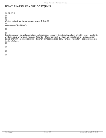 Gigs.pl - Koncerty :: Festiwale :: Imprezy NOWY SINGIEL MIA JUŻ DOSTĘPNY! 01.02.2012 W sieci pojawił się już najnowszy utwór M.I.A. zatytułoway "Bad Girls". Jest to pierwszy singiel promujący nadchodzący, czwarty już studyjny album artystki, który zostanie wydany przez wytwórnię Mercury Records. Utwór powstał w Miami we współpracy z producentem Danja znanym z wcześniejszych dokonań z Madonną oraz Nelly Furtado. Już w ten piątek ukaże się także teledysk. http://gigs.pl Kreator PDF Utworzono 2 March, 2017, 15:03