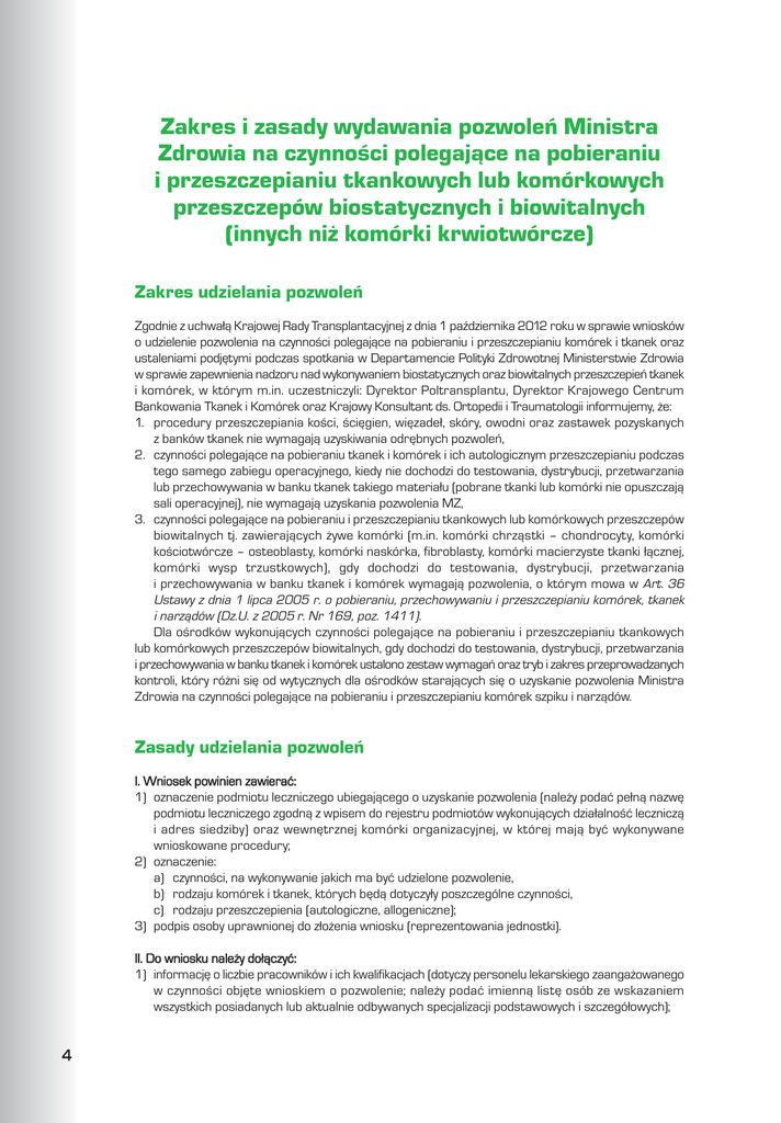 Zakres i zasady wydawania pozwoleñ Ministra Zdrowia na czynnoci polegaj¹ce na pobieraniu i przeszczepianiu tkankowych lub komórkowych przeszczepów biostatycznych i biowitalnych (innych ni¿ komórki krwiotwórcze) Zakres udzielania pozwoleñ Zgodnie z uchwa³¹ Krajowej Rady Transplantacyjnej z dnia 1 padziernika 2012 roku w sprawie wniosków o udzielenie pozwolenia na czynnoci polegaj¹ce na pobieraniu i przeszczepianiu komórek i tkanek oraz ustaleniami podjêtymi podczas spotkania w Departamencie Polityki Zdrowotnej Ministerstwie Zdrowia w sprawie zapewnienia nadzoru nad wykonywaniem biostatycznych oraz biowitalnych przeszczepieñ tkanek i komórek, w którym m.in. uczestniczyli: Dyrektor Poltransplantu, Dyrektor Krajowego Centrum Bankowania Tkanek i Komórek oraz Krajowy Konsultant ds. Ortopedii i Traumatologii informujemy, ¿e: 1. procedury przeszczepiania koci, ciêgien, wiêzade³, skóry, owodni oraz zastawek pozyskanych z banków tkanek nie wymagaj¹ uzyskiwania odrêbnych pozwoleñ, 2. czynnoci polegaj¹ce na pobieraniu tkanek i komórek i ich autologicznym przeszczepianiu podczas tego samego zabiegu operacyjnego, kiedy nie dochodzi do testowania, dystrybucji, przetwarzania lub przechowywania w banku tkanek takiego materia³u (pobrane tkanki lub komórki nie opuszczaj¹ sali operacyjnej), nie wymagaj¹ uzyskania pozwolenia MZ, 3. czynnoci polegaj¹ce na pobieraniu i przeszczepianiu tkankowych lub komórkowych przeszczepów biowitalnych tj. zawieraj¹cych ¿ywe komórki (m.in. komórki chrz¹stki chondrocyty, komórki kociotwórcze osteoblasty, komórki naskórka, fibroblasty, komórki macierzyste tkanki ³¹cznej, komórki wysp trzustkowych), gdy dochodzi do testowania, dystrybucji, przetwarzania i przechowywania w banku tkanek i komórek wymagaj¹ pozwolenia, o którym mowa w Art. 36 Ustawy z dnia 1 lipca 2005 r. o pobieraniu, przechowywaniu i przeszczepianiu komórek, tkanek i narz¹dów (Dz.U. z 2005 r. Nr 169, poz. 1411). Dla orodków wykonuj¹cych czynnoci polegaj¹ce na pobieraniu i przeszczepianiu tkankowych lub komórkowych przeszczepów biowitalnych, gdy dochodzi do testowania, dystrybucji, przetwarzania i przechowywania w banku tkanek i komórek ustalono zestaw wymagañ oraz tryb i zakres przeprowadzanych kontroli, który ró¿ni siê od wytycznych dla orodków staraj¹cych siê o uzyskanie pozwolenia Ministra Zdrowia na czynnoci polegaj¹ce na pobieraniu i przeszczepianiu komórek szpiku i narz¹dów. Zasady udzielania pozwoleñ I. Wniosek powinien zawieraæ: 1) oznaczenie podmiotu leczniczego ubiegaj¹cego o uzyskanie pozwolenia (nale¿y podaæ pe³n¹ nazwê podmiotu leczniczego zgodn¹ z wpisem do rejestru podmiotów wykonuj¹cych dzia³alnoæ lecznicz¹ i adres siedziby) oraz wewnêtrznej komórki organizacyjnej, w której maj¹ byæ wykonywane wnioskowane procedury; 2) oznaczenie: a) czynnoci, na wykonywanie jakich ma byæ udzielone pozwolenie, b) rodzaju komórek i tkanek, których bêd¹ dotyczy³y poszczególne czynnoci, c) rodzaju przeszczepienia (autologiczne, allogeniczne); 3) podpis osoby uprawnionej do z³o¿enia wniosku (reprezentowania jednostki). II. Do wniosku nale¿y do³¹czyæ: 1) informacjê o liczbie pracowników i ich kwalifikacjach (dotyczy personelu lekarskiego zaanga¿owanego w czynnoci objête wnioskiem o pozwolenie; nale¿y podaæ imienn¹ listê osób ze wskazaniem wszystkich posiadanych lub aktualnie odbywanych specjalizacji podstawowych i szczegó³owych); 4 2) listê pracowników, posiadane specjalizacjê oraz ich zakresy czynnoci (nale¿y wskazaæ sporód czynnoci: pobieranie, przeszczepianie, opieka); 3) wykaz pomieszczeñ i urz¹dzeñ (sprzêtu) s³u¿¹cych w orodku do: a) przechowywania komórek i tkanek: od pobrania do czasu ich transportu do banku tkanek i komórek, od ich odbioru z banku tkanek i komórek do czasu zastosowania u ludzi, b) wykonywania wnioskowanych procedur, c) sprawowania opieki pooperacyjnej; 4) strukturê organizacyjn¹ orodka; 5) spisane procedury kwalifikacji dawcy, pobrania, przechowywania, transportu, przyjêcia z banku i przeszczepiania biowitalnych komórek i tkanek; 6) imiê i nazwisko osoby, która bêdzie odpowiedzialna za: a) przestrzeganie ustawy z dnia 1 lipca 2005 r. o pobieraniu, przechowywaniu i przeszczepianiu komórek, tkanek i narz¹dów (Dz. U. Nr 169, poz. 1411, z pón. zm.); b) dokonywanie zg³oszeñ potencjalnych biorców komórek i tkanek na Krajow¹ Listê Osób Oczekuj¹cych na Przeszczepienie oraz wykonanych przeszczepieñ komórek i tkanek do Krajowego Rejestru Przeszczepieñ a tak¿e aktualizacjê danych w prowadzonym przez Poltransplant systemie rejestrów transplantacyjnych (www.rejestry.net); c) niezw³oczne informowanie Poltransplantu o powsta³ych zmianach w podmiocie leczniczym w zakresie informacji podanych we wniosku o udzielenie pozwolenia; d) rejestrowanie istotnych zdarzeñ i reakcji niepo¿¹danych zwi¹zanych z pobraniem, testowaniem, przetwarzaniem, sterylizacj¹, przechowywaniem, dystrybucj¹ i przeszczepianiem komórek i tkanek oraz stosowaniem wyrobów medycznych i materia³ów maj¹cych bezporednio kontakt z komórkami i tkankami, informowanie Krajowego Centrum Bankowania Tkanek i Komórek o takich zdarzeniach i reakcjach oraz czynnociach podjêtych dla ich wyjanienia i zapobiegania; 7) Owiadczenie o zawarciu umowy z bankiem tkanek, z którego pochodz¹ przyjmowane do przeszczepienia tkanki i komórki z informacj¹ o dacie i zakresie umowy; 8) Owiadczenie o zawarciu umowy z medycznym laboratorium diagnostycznym (o ile laboratorium nie wystêpuje w strukturze aplikuj¹cego podmiotu), z informacj¹ o dacie i zakresie umowy; 9) Informacje potwierdzaj¹ce, ¿e podmiot leczniczy posiada: a) salê operacyjn¹ lub zabiegow¹ b) mo¿liwoæ intensywnej opieki pooperacyjnej w warunkach oddzia³u intensywnej terapii c) wyroby medyczne i produkty lecznicze umo¿liwiaj¹ce prowadzenie diagnostyki i leczenia po wykonaniu przeszczepienia komórek lub tkanek biowitalnych. III