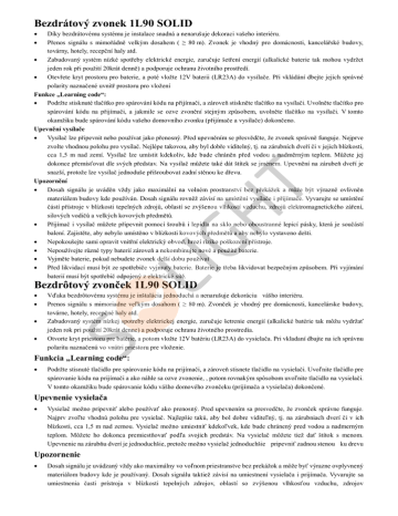 Bezdrátový zvonek 1L90 SOLID Díky bezdrátovému systému je instalace snadná a nenarušuje dekoraci vašeho interiéru. Přenos signálu s mimořádně velkým dosahem ( ≥ 80 m). Zvonek je vhodný pro domácnosti, kancelářské budovy, továrny, hotely, recepční haly atd. • Zabudovaný systém nízké spotřeby elektrické energie, zaručuje šetření energií (alkalické baterie tak mohou vydržet jeden rok při použití 20krát denně) a podporuje ochranu životního prostředí. • Otevřete kryt prostoru pro baterie, a poté vložte 12V baterii (LR23A) do vysílače. Při vkládání dbejte jejich správné polarity naznačené uvnitř prostoru pro vložení Funkce „Learning code“: • Podržte stisknuté tlačítko pro spárování kódu na přijímači, a zároveň stiskněte tlačítko na vysílači. Uvolněte tlačítko pro spárování kódu na přijímači, a jakmile se ozve zvonění stejným způsobem, uvolněte tlačítko na vysílači. V tomto okamžiku bude spárování kódu vašeho domovního zvonku (přijímače a vysílače) dokončeno. Upevnění vysílače • Vysílač lze připevnit nebo používat jako přenosný. Před upevněním se přesvědčte, že zvonek správně funguje. Nejprve zvolte vhodnou polohu pro vysílač. Nejlépe takovou, aby byl dobře viditelný, tj. na zárubních dveří či v jejich blízkosti, cca 1,5 m nad zemí. Vysílač lze umístit kdekoliv, kde bude chráněn před vodou a nadměrným teplem. Můžete jej dokonce přemísťovat dle svých představ. Na vysílač můžete také dát štítek se jménem. Upevnění na zárubeň dveří je snazší, protože lze vysílač jednoduše přišroubovat zadní stěnou ke dřevu. Upozornění • Dosah signálu je uváděn vždy jako maximální na volném prostranství bez překážek a může být výrazně ovlivněn materiálem budovy kde používán. Dosah signálu rovněž závisí na umístění vysílače i přijímače. Vyvarujte se umístění částí přístroje v blízkosti tepelných zdrojů, oblastí se zvýšenou vlhkostí vzduchu, zdrojů elektromagnetického záření, silových vodičů a velkých kovových předmětů. • Přijímač i vysílač můžete připevnit pomocí šroubů i lepidla na sklo nebo oboustranné lepicí pásky, která je součástí balení. Zajistěte, aby nebylo umístěno v blízkosti kovových předmětů a aby nebylo vystaveno dešti. • Nepokoušejte sami opravit vnitřní elektrický obvod, hrozí riziko poškození přístroje. • Nepoužívejte různé typy baterií zároveň a nekombinujte nové a použité baterie. • Vyjměte baterie, pokud nebudete zvonek delší dobu používat • Před likvidací musí být ze spotřebiče vyjmuty baterie. Baterie je třeba likvidovat bezpečným způsobem. Při vyjímání baterií musí být spotřebič odpojený z elektrické sítě. • • Bezdrôtový zvonček 1L90 SOLID • • • • Vďaka bezdrôtovému systému je inštalácia jednoduchá a nenarušuje dekoráciu vášho interiéru. Prenos signálu s mimoriadne veľkým dosahom ( ≥ 80 m). Zvonček je vhodný pre domácnosti, kancelárske budovy, továrne, hotely, recepčné haly atd. Zabudovaný systém nízkej spotreby elektrickej energie, zaručuje šetrenie energií (alkalické batérie tak môžu vydržať jeden rok pri použití 20krát denne) a podporuje ochranu životného prostredia. Otvorte kryt priestoru pre batérie, a potom vložte 12V batériu (LR23A) do vysielača. Pri vkladaní dbajte na ich správnu polaritu naznačenú vo vnútri priestoru pre vloženie. Funkcia „Learning code“: • Podržte stisnuté tlačidlo pre spárovanie kódu na prijímači, a zároveň stisnete tlačidlo na vysielači. Uvoľnite tlačidlo pre spárovanie kódu na prijímači a ako náhle sa ozve zvonenie, , potom rovnakým spôsobom uvoľnite tlačidlo na vysielači. V tomto okamžiku bude spárovanie kódu vášho domového zvončeku (prijímača a vysielača) dokončené. Upevnenie vysielača • Vysielač možno pripevniť alebo používať ako prenosný. Pred upevnením sa presvedčte, že zvonček správne funguje. Najprv zvoľte vhodnú polohu pre vysielač. Najlepšie takú, aby bol dobre viditeľný, tj. na zárubniach dverí či v ich blízkosti, cca 1,5 m nad zemou. Vysielač možno umiestniť kdekoľvek, kde bude chránený pred vodou a nadmerným teplom. Môžete ho dokonca premiestňovať podľa svojich predstáv. Na vysielač môžete tiež dať štítok s menom. Upevnenie na zárubňu dverí je jednoduchšie, pretože možno vysielač jednoduchšie pripevniť zadnou stenou ku drevu Upozornenie • Dosah signálu je uvádzaný vždy ako maximálny vo voľnom priestranstve bez prekážok a môže byť výrazne ovplyvnený materiálom budovy kde je používaný. Dosah signálu taktiež závisí na umiestnení vysielača i prijímača. Vyvarujte sa umiestnenia časti prístroja v blízkosti tepelných zdrojov, oblastí so zvýšenou vlhkosťou vzduchu, zdrojov • • • • • elektromagnetického žiarenia, silových vodičov a veľkých kovových predmetov. Prijímač i vysielač môžete pripevniť pomocou šraubou i lepidla na sklo alebo obojstrannej lepiacej pásky, ktorá je súčasťou balenia. Zaistite, aby nebolo umiestnené v blízkosti kovových predmetov a aby nebolo vystavené dažďu. Nepokúšajte sa sami opraviť vnútorný elektrický obvod, hrozí riziko poškodenia prístroja. Nepoužívajte rôzne typy batérii zároveň a nekombinujte nové a použité batérie. Vyberte batérie, ak nebudete zvonček dlhšiu dobu používať Pred likvidáciou musia byť zo spotrebiča vybraté batérie. Batérie treba likvidovať bezpečným spôsobom. Pri vyberaní batérii musí byť spotrebič odpojený z elektrickej siete. Dzwonek bezprzewodowy 1L90 SOLID Dzięki bezprzewodowemu systemowi instalacja jest prosta i nie narusza dekoracji waszego wnętrza. Transmisja sygnału odbywa się na duŜą odległ