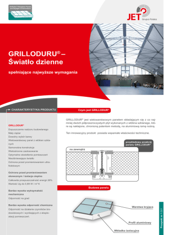 Grillodur® Fibreglass Panels and Daylight Constructions GrillodurU® – Światło dzienne spełniające najwyższe wymagania CHARAKTERYSTYKA PRODUKTU Grillodur® Dopuszczenie nadzoru budowlanego Mały ciężar Czym jest GRILLODUR® GRILLODUR® jest wielowarstwowym panelem składającym się z co najmniej dwóch półprzezroczystych płyt wykonanych z włókna szklanego, które są naklejone, chronioną patentem metodą, na aluminiową ramę nośną. Ten innowacyjny produkt posiada wspaniałe właściwości techniczne. Dowolny wybór barwy Wielowarstwowy panel z włókien szkla- przykładowy przekrój panelu GRILLODUR® nych Samonośna konstrukcja Wielostronne zastosowanie na zewnątrz Optymalne oświetlenie pomieszczeń Nieolśniewające światło Ochrona przed promieniowaniem ultrafioletowym Ochrona przed promieniowaniem słonecznym / izolacja cieplna Całkowita przepuszczalność energii 28% Wartość Ug do 0,89 W / m² K Bardzo wysoka wytrzymałość Budowa panelu mechaniczna Bardzo wysoka odporność chemiczna Odporność na działanie czynników śro- Warstwa kryjąca dowiskowych i wynikających z eksploatacji pomieszczeń. Profil aluminiowy Wkładka izolacyjna Prospekt nr 1.3.1 Odporność na grad Ochrona przed promieniowaniem słonecznym GRILLODUR® Kopuła W połączeniu z wkładką izolacyjną umieszczoną pomiędzy płytami z włókna szklanego GRILLODUR® przepuszcza max. 28% energii całkowitej i zapewnia stabilny klimat w pomieszczeniach. GRILLODUR® stanowi świetną ochronę przed promieniowaniem słonecznym. Przedstawienie transmisji energii przez GRILLODUR® Izolacja cieplna GRILLODUR® umożliwia realizację ekologicznego i ekonomicznego budownictwa oraz spełnia najbardziej rygorystyczne wymagania rozporządzenia w sprawie oszczędności energii. GRILLODUR® pomaga redukować koszty. Zalety GRILLODUR® • Izolacja cieplna: wartość Ug do 0,89 W / m2 K • Ochrona przed promieniowaniem słonecznym: przepuszczalność energii do 28% • Odporność na uderzenia piłką według DIN18032 część 3 • Duża trwałość • Optymalne oświetlenie pomieszczeń światłem dziennym • Możliwość tworzenia dowolnych form • Odporność na grad • Izolacja akustyczna do 32 dB według DIN EN 20 1403 i DIN EN ISO 717-1 Odporność na uderzenia piłką Dzięki wielowarstwowej konstrukcji GRILLODUR® jest odporny na uderzenia piłką według normy DIN 18032 część 3. Jest to najwyższa klasyfikacja w kategorii przydatności do stosowania w obiektach, w których rozgrywane są zawody piłkarskie. Trwałość Trwałość GRILLODUR® przekracza 30 lat. GRILLODUR® zastosowano już w wielu tysiącach obiektów. Nasze systemy już od dawna posiadają wszystkie niezbędne dopuszczenia. 100 % promieniowanie słoneczne Element Grillodur® W związku z coraz droższymi paliwami i malejącą ilością surowców, oszczędzanie energii przybiera coraz bardziej na znaczeniu. Dzięki specjalnej budowie panelu możliwe jest uzyskiwanie wartości Ug rzędu 0,89 W / m² K. 28 % przepuszczanej energii Optymalne oświetlenie pomieszczeń GRILLODUR® zapewnia równomierne, nieoślepiające oświetlenie hal sportowych i stanowisk pracy. GRILLODUR® gwarantuje osiąganie optymalnych wartości świetlnych. Podnosi to jakość pracy, poprawia samopoczucie pracowników i umożliwia przyjemną grę w tenisa lub badmintona. Docenił to Międzynarodowy Komitet Olimpijski i wyposażył olimpijskie obiekty sportowe w GRILLODUR®. Możliwość tworzenia dowolnych form Możliwości tworzenia z GRILLODUR® dowolnych form nie znają granic. Różnorodność kolorów i form geometrycznych umożliwia realizację niepowtarzalnych projektów. Barwienie płyt z włókna szklanego rozpoczyna się już we wstępnej fazie produkcji. Ta skomplikowana technologia zapewnia trwałość barwy. Odporność na grad Panele GRILLODUR® mogą przyjmować energię uderzeniową przekraczającą 100 Jouli w skali Shattera i w ciągu ostatnich 75 Lat wykazały się odpornością na wszystkie ataki gradu. Izolacja akustyczna W połączeniu z wkładką izolacyjną i wzmocnioną szybą z włókien szklanych GRILLODUR® osiąga poziom izolacji akustycznej sięgający Rw 32 dB według EN 120 140-3 i EN 1717-1. Duża wytrzymałość Grillodur® posiada bardzo dużą wytrzymałość w wyniku zastosowania samonośnej ramy aluminiowej. W zależności od konstrukcji wytrzymałość GRILLODUR® dochodzi nawet do 2,5 kN / m². Wysoka odporność na działanie czynników środowiskowych zapewnia dużą trwałość produktu. Po konstrukcjach GRILLODUR® można chodzić wg. BGI 526. arbe immer weiß auf rotem Grund Ochrona przeciwpożarowa Powłoki GRILLODUR® są niepalne i nie ulegają stopieniu. Stanowią one bardzo dobrą ochronę przeciwpożarową budynków. Poprzez dodanie składników zapobiegających paleniu GRILLODUR® jest odporny na działanie płomieni i źródeł ciepła oraz do zastosowania na „zagrożonych dachach“. Klasyfikacja • normalna palność według DIN 4102 • klasa pożarowa E według DIN EN 13501-1 • sprawdzenie urządzenia według EN 12101-2 z • oznakowanie CE • O dporność na płomienie i źródła ciepła według DIN 4102-7 Przekrój klapy Grillodur® Hala lodowiskowa Düsseldorf Grillodur® nadaje się do montażu na dachach i fasadach. Odległość wewnętrznych profili nośnych wynosi 200 mm lub 391 mm. Poszczególne elementy są łączone profilami połączeniowymi. Elementy są samonośne i mają aluminiową ramę W zależności od potrzeb ramy są zbudowane z rur prostokątnych lub z otwartych profili. W zależności od profili połączeniowych powstają na połączeniach elementów 50 mm lub 60 mm powierzchnie licowe. Obiekt olimpijski Bochum przekrój przez Grillodur® łukowy Przejście dachu wykonanego z GRILLODUR® w fasadę Doświadczenie i Innowacja Nasze ponad 40-letnie doświadczenie i ścisłe kontakty z naszymi klientami umożliwiły nam sprostać wymaganiom rynku i ulokować GRILL