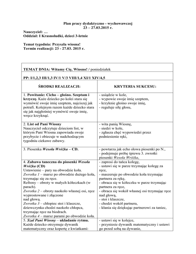 Plan pracy dydaktyczno - wychowawczej 23 – 27.03.2015 r. Nauczyciel: … Oddział: I Krasnoludki, dzieci 3-letnie Temat tygodnia: Przyszła wiosna! Termin realizacji: 23 - 27.03. 2015 r. TEMAT DNIA: Witamy Cię, Wiosno! / poniedziałek PP: I/1,2,3 III/1,3 IV/1 V/3 VIII/1,4 XI/1 XIV/4,5 ŚRODKI REALIZACJI: KRYTERIA SUKCESU: 1. Powitanie: Cicho – głośno. Szeptam i krzyczę. Każe dziecko po kolei stara się wymówić swoje imię szeptem, najciszej jak potrafi. Kolejnym razem każde dziecko stara się jak najgłośniej wymówić swoje imię, wręcz krzyknąć. - usiądzie w kole, - wypowie swoje imię szeptem, - krzyknie głośno swoje imię, - reguluje siłę głosu, 2. List od Pani Wiosny Nauczyciel odczytuje dzieciom list, w którym Pani Wiosna zapowiada swoje przybycie i obiecuje w nadchodzącym tygodniu ciekawe zabawy. - wita panią Wiosnę, - siedzi w kole, - zgłasza chęć wypowiedzi przez podniesienie ręki, 3. Piosenka Wesoła Wróżka – CD. - powtarza jak echo słowa piosenki po N., - podejmuje próbę śpiewu 3. zwrotki piosenki Wesoła Wróżka, 4. Zabawa taneczna do piosenki Wesoła - zaprosi do tańca kolegę, - ustawi się w parze trzymając kolegę za Wróżka (CD) Ustawienie – pary na obwodzie koła. ręce, Zwrotka 1 – marsz po obwodzie dużego koła, - maszeruje po obwodzie koła trzymając trzymając się za ręce. partnera za rękę, Refreny – obroty w małych kółeczkach (w - obraca się w kółeczku w parze trzymając parach). partnera za ręce, Zwrotka 2 – obroty naokoło własnej osi, ręce - obraca się wokół własnej osi trzymając ręce wyprostowane i złączone nad głową, nad głową. - stoi i klaszcze, Zwrotka 3 – chłopiec stoi i klaszcze, - chodzi wokół partnera, dziewczynka chodzi naokoło chłopca, - kłania się dziękując partnerowi za taniec, trzymając ręce na biodrach. Zwrotka 4 – marsz parami po obwodzie koła. 5. Szal Pani Wiosny – układanie rytmu. - ustawi się w kolejce, Każde dziecko otrzymuje dywanik - przyniesie dywanik matematyczny i ustawi matematyczny oraz kopertę z kwiatkami: go przed sobą na dywanie, różowymi i niebieskimi. Dzieci układają szal według wzoru. Na koniec łączą dywaniki tworząc wiosenny szal Pani Wiosny. 6. Wiosenny spacer „Obserwatorzy pogody” – spacer po okolicy, obserwacja pogody, poszukiwanie „zwiastunów wiosny” - wyjmie z koperty zawartość, - ułoży kwiaty w proponowanej kolejności zachowując podany rytm, - przeniesie z ostrożnością swój dywanik dosuwając go do dywanika kolegi, - opisze wygląd szalu Pani Wiosny, - wybiera kolegę do pary, - ustawia się „para za parą”, - opisuje zwiastuny wiosny, - nazywa i wskazuje elementy przyrody charakterystyczne dla pory roku, - opisuje pogodę oraz nazywa zjawiska atmosferyczne, TEMAT DNIA: Witaj Bocianie! /wtorek PP: I/1,2,3 II/5 III/1,3 IV/1,3V/3 VII/2 IX/1 XIV/2,4,5 ŚRODKI REALIZACJI: 1. Zabawa integracyjna (CD – piosenka Bociek) Słuchając piosenki wszyscy poruszają się po obwodzie koła, naśladując szybujące bociany. Gdy nauczyciel zatrzyma muzykę, dz. wypowiadają powitanie: trzy razy powtarzają sylabę „kle”. Przy powtórzeniu zmiana kierunku ruchu. 2.Opowiadanie o Rodzinie Bocianów. Pan bocian spotkał się z panią bocianową i zamieszkali w gnieździe na starej wierzbie. Pani bocianowa zniosła trzy jajka. Gdy wykluły się młode bociany, rodzice karmili je, aby szybko urosły. Jesienią cała rodzina odleciała do Afryki – tam, gdzie nie ma zimy. 3. Zabawa: Co było najpierw, a co potem? Historyjka obrazkowa. Nauczyciel układa pomieszane obrazki (powiększone) zgodnie z kolejnością zdarzeń. Dzieci opowiadają z pomocą nauczyciela historyjkę. Zwracają uwagę na to, co wydarzyło się najpierw, a co potem. Układają pod obrazkami kartoniki z odpowiednią liczbą kropek (pod pierwszym – kartonik z jedną kropką, pod drugim – z dwoma kropkami itd.); posługują się liczebnikami porządkowymi. KRYTERIA SUKCESU: - porusza się rytmicznie po obwodzie koła, - reaguje na stop w muzyce przez zatrzymanie, - trzy razy wypowie słowo „kle”, - po przerwie zmienia kierunek poruszania się, - odpowie na pytania dotyczące krótkiego opowiadania, - zgłosi chęć wypowiedzi przez podniesienie ręki, - podejmie próbę ułożenia obrazków w kolejności chronologicznej, - uzasadni swój wybór odpowiadając na pytania, - chęć wypowiedzi zgłosi przez podniesienie ręki, - ułoży kartoniki z odpowiednią liczbą kropek pod ilustracjami zgodnie z ich kolejnością, - przeliczy obrazki wskazując je palcem, - poda wynik dodawania, 4. Oglądanie fotografii bocianów w albumach przyrodniczych. Omówienie wyglądu bociana - opisze obrazki przedstawiające bociany, - opowie czy podobają mu się takie duże ptaki, - opowie czy widział bociana w rzeczywistości, 5. Zabawa „Porwane piórko” - wybierze piórko używając zwrotu Każda osoba dostaje mały kawałek białego grzecznościowego, papieru symbolizujący bocianie pióro (lub - dmucha w piórko, białe piórko). W trakcie muzyki dzieci tańczą - improwizuje ruchem opowieść nauczyciela, z „piórkiem” i dmuchają na niego, Element dramy/opowieści ruchowej: dzieci przedstawiają scenkę: w czasie lotu bocian gubi pióro, które na wietrze zaczyna wirować. 6. Zabawa plastyczna: Bociek na wiosennej łące. Wykonanie bociana z jednorazowych talerzyków i elementów orgiami. Tworzenie kompozycji. - ułoży kompozycję tworząc bociana, - przyklei elementy w odpowiedni sposób, - domaluje brakujące elementy według własnego pomysłu, - dokończy obrazek w wybrany sposób, - opowie co znajduje się na obrazku, - wyrzuca ścinki do kosza, - zasuwa krzesełko po odejściu od stołu, - myje ręce po skończonej zabawie, TEMAT DNIA: Wiosenne kwiaty. / środa PP: I/1,2,3 III/1,3 IV/1,3 V/3,4 VIII/2,3 ŚRODKI REALIZACJI: KRYTERIA SUKCESU: - ustawi się w kole, - poda kwiatek koledze, Dzieci stoją na obwodzie koła i przekazują -