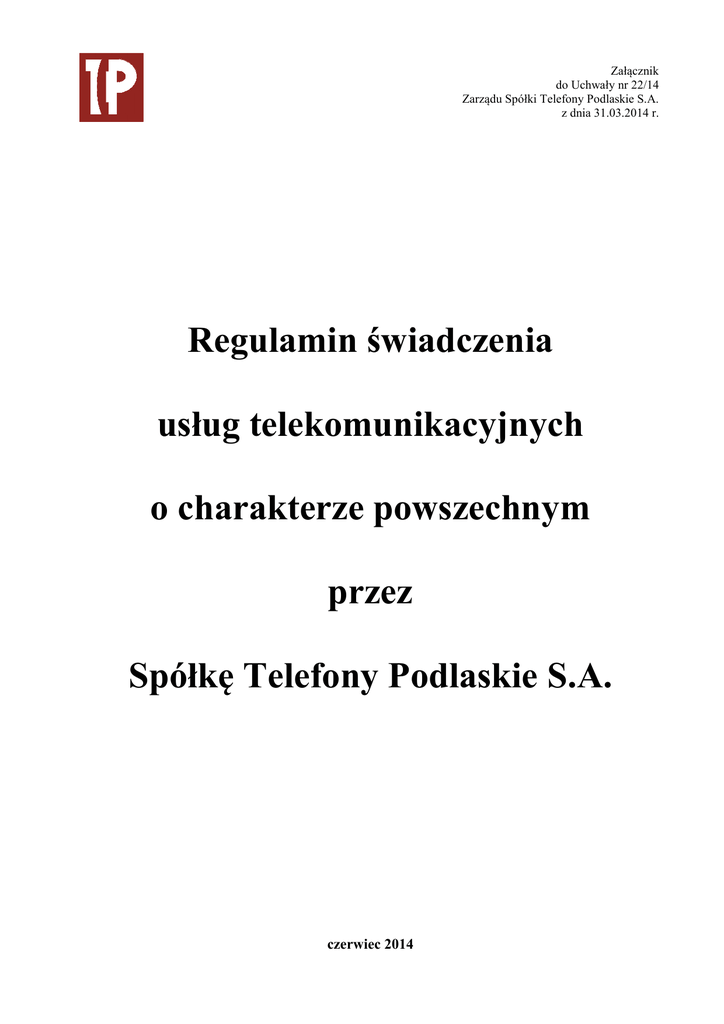 Załącznik do Uchwały nr 22/14 Zarządu Spółki Telefony Podlaskie S.A. z dnia 31.03.2014 r. Regulamin świadczenia usług telekomunikacyjnych o charakterze powszechnym przez Spółkę Telefony Podlaskie S.A. czerwiec 2014 Regulamin świadczenia usług telekomunikacyjnych o charakterze powszechnym przez Spółkę Telefony Podlaskie S.A. w Sokołowie Podlaskim, ul. Wolności 44, wydany na podstawie art. 59 ust. 1 ustawy z dnia 16 lipca 2004 roku Prawo telekomunikacyjne (Dz. U. Nr 171, poz. 1800 z późniejszymi zmianami). ROZDZIAŁ 1. Postanowienia ogólne §1 Usługi telekomunikacyjne o charakterze powszechnym świadczone są przez Spółkę Telefony Podlaskie S.A. w zakresie i na warunkach określonych w niniejszym Regulaminie. §2 Użyte w Regulaminie określenia oznaczają: 1. Abonament telefoniczny – opłata za możliwość korzystania z dostępu do sieci telekomunikacyjnej i świadczonych w niej usług. 2. Abonent – osoba fizyczna, osoba prawna lub jednostka organizacyjna nie posiadająca osobowości prawnej, utworzona zgodnie z przepisami prawa, z którą Spółka Telefony Podlaskie S.A. zawarła umowę o świadczenie usług telekomunikacyjnych. 3. Biuro Obsługi Klienta - wewnętrzna komórka organizacyjna Spółki Telefony Podlaskie S.A. zwana w niniejszym Regulaminie BOK. 4. Cennik - Cenniki usług PSTN świadczonych przez Spółkę Telefony Podlaskie S.A. 5. Konsument – osoba fizyczna wnioskująca o świadczenie publicznie dostępnych usług telekomunikacyjnych lub korzystająca z takich usług dla celów niezwiązanych bezpośrednio z jej działalnością gospodarczą lub wykonywanym zawodem. 6. Kaucja – kwota stanowiąca zabezpieczenie należności za usługi telekomunikacyjne wykonane przez Spółkę Telefony Podlaskie S.A. na rzecz Abonenta. 7. Lokal – miejsce, w którym świadczona jest usługa, wskazane przez Abonenta na wniosku. 8. Okres rozliczeniowy – przedział czasowy, będący podstawą rozliczenia Abonenta wobec Spółki Telefony Podlaskie S.A., za który wystawiona jest faktura VAT za zrealizowane usługi telekomunikacyjne. 9. Regulamin – Regulamin świadczenia usług telekomunikacyjnych o charakterze powszechnym przez Spółkę Telefony Podlaskie S.A. 10. Tytuł prawny - prawo własności, użytkowanie wieczyste, własnościowe spółdzielcze prawo do lokalu mieszkalnego, spółdzielcze prawo do lokalu użytkowego, spółdzielcze lokatorskie prawo do lokalu, prawo do domu jednorodzinnego w spółdzielni mieszkaniowej, użytkowanie, służebność mieszkania, dożywocie, dzierżawa, najem, użyczenie. 11. Umowa - Umowa o świadczenie usług telekomunikacyjnych zawarta pomiędzy Spółką Telefony Podlaskie S.A. a Abonentem. 12. Urządzenie końcowe – urządzenie telekomunikacyjne przeznaczone do podłączenia bezpośrednio lub pośrednio do zakończenia sieci. 13. Użytkownik końcowy – podmiot korzystający z publicznie dostępnej usługi telekomunikacyjnej. 14. Usługa powszechna – zestaw usług telekomunikacyjnych dostępny dla ogółu Użytkowników końcowych w stacjonarnych publicznych sieciach telefonicznych na terytorium Rzeczpospolitej Polskiej. 15. Wnioskodawca – osoba składająca wniosek o zawarcie Umowy. 16. Zakończenie sieci – fizyczny punkt, w którym Abonent otrzymuje dostęp do publicznej sieci telekomunikacyjnej. ROZDZIAŁ 2. Rodzaje i warunki świadczenia usług telekomunikacyjnych §3 Spółka Telefony Podlaskie S.A. na podstawie Regulaminu i Umowy, zawieranej po spełnieniu warunków określonych w Regulaminie: 1. przyłącza urządzenia końcowe do swojej sieci, 2. zapewnia stały dostęp do swojej sieci, 3. realizuje połączenia telefoniczne krajowe i międzynarodowe, w tym do sieci ruchomych, obejmujące 2 4. 5. 6. 7. także zapewnienie transmisji do faksu oraz transmisji danych, w tym połączenia do sieci Internet, umożliwia dostęp do informacji o numerach Abonentów oraz udostępnia spisy swoich Abonentów, świadczy udogodnienia dla osób niepełnosprawnych, dostarcza, na żądanie Abonenta, szczegółowy wykaz wykonanych mu usług telekomunikacyjnych, świadczy usługi telefoniczne za pomocą aparatów publicznych. §4 Abonenci Spółki Telefony Podlaskie S.A. otrzymują pełną informację o zasadach świadczenia usług przez Spółkę Telefony Podlaskie S.A. §5 1. Spółka Telefony Podlaskie S.A. nieodpłatnie publikuje w spisach abonentów dane zawierające imię i nazwisko lub nazwę Abonenta, adres i numer jego urządzenia końcowego. 2. Abonent może nieodpłatnie zastrzec, aby jego dane określone w ust. 1 nie były publikowane i podawane przez Spółkę Telefony Podlaskie S.A. do wiadomości innych osób. 3. Zastrzeżony numer nie jest uwidoczniony na fakturach wystawianych przez Spółkę Telefony Podlaskie S.A. §6 1. Spółka Telefony Podlaskie S.A. zapewnia poufność informacji o świadczonych na rzecz Abonenta usługach oraz ich treści. 2. Osobom trzecim udziela się informacji o przyjętych do wykonania lub wykonanych usługach w przypadkach przewidzianych prawem. §7 1. Na życzenie Abonenta Spółka Telefony Podlaskie S.A. zawiesza świadczenie usług telefonicznych na okres do 3 miesięcy, nie wcześniej niż po upływie 3 miesięcy od daty zawarcia Umowy. 2. Abonent powinien wystąpić do Spółki Telefony Podlaskie S.A. z wnioskiem o zawieszenie świadczenia usług telefonicznych z minimum 3-dniowym wyprzedzeniem (3 dni robocze). Za czasowe zawieszenie usług telefonicznych Abonent zobowiązany jest do uiszczenia jednorazowej opłaty – w dniu składania wniosku – w wysokości określonej w Cenniku. 3. Przez okres zawieszenia usług telefonicznych, Abonent jest zwolniony z obowiązku uiszczania miesięcznej opłaty abonamentowej za usługę. Ponowne rozpoczęcie świadczenia usług telefonicznych dokonywane jest bezpłatnie. ROZDZIAŁ 3. Umowa o świadczenie usług I. Postanowienia ogólne §8 1. Spółka Telefony Podlaskie S.A. świadczy usługi telekomunikacyjne na podstawie Umo
