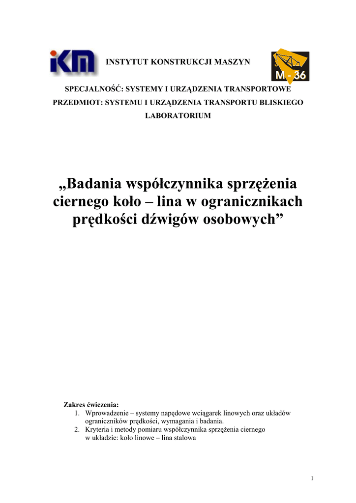 INSTYTUT KONSTRUKCJI MASZYN SPECJALNOŚĆ: SYSTEMY I URZĄDZENIA TRANSPORTOWE PRZEDMIOT: SYSTEMU I URZĄDZENIA TRANSPORTU BLISKIEGO LABORATORIUM „Badania współczynnika sprzężenia ciernego koło – lina w ogranicznikach prędkości dźwigów osobowych” Zakres ćwiczenia: 1. Wprowadzenie – systemy napędowe wciągarek linowych oraz układów ograniczników prędkości, wymagania i badania. 2. Kryteria i metody pomiaru współczynnika sprzężenia ciernego w układzie: koło linowe – lina stalowa 1 1. WPROWADZENIE - SYSTEMY I URZĄDZENIA BEZPIECZEŃSTWA W DŹWIGACH OSOBOWYCH (WG PN-EN-81.1 ORAZ PN-ENN-81.2) 1. ogranicznik prędkości. 2. chwytacze. 3. zamek bezpieczeństwa drzwi. 4. drzwi przystankowe przeciwpożarowe. 5. zderzaki kabiny i przeciwwagi Usytuowanie wymienionych urządzeń bezpieczeństwa w typowym rozwiązaniu dźwigu: 2 8 7 10 9 3 6 4 1 11 5 13 12 Przykładowy schemat budowy dźwigu pionowego z maszynownią górną: 1. 2. 3. 4. 5. 6. 7. 8. 9. 10. 11. szyb. Maszynownia. Kabina. Lina. Przeciwwaga. prowadnice kabiny. prowadnice przeciwwagi. ogranicznik prędkości. chwytacze kabiny. chwytacze przeciwwagi. zamki bezpieczeństwa drzwi. 12. zderzaki kabiny. 13. zderzaki przeciwwagi Obecnie stosowany ogranicznik prędkości K1401 firmy OTIS. 2 2. STANOWISKO BADAWCZE I UKŁAD POMIAROWY DO BADANIA WSPÓŁCZYNNIKA SPRZĘŻENIA CIERNEGO KOŁO LINOWE - LINA Do badania sprzężenia ciernego wykorzystywany jest specjalny układ pomiarowy składający się z trzech podstawowych zespołów. Pierwszy to zasilacz hydrauliczny, drugi to stanowisko z ogranicznikiem prędkości, trzeci to układ zbierający, przetwarzający i zapisujący dane pomiarowe. Specyfikacja podzespołów: 1. 2. 3. 4. 5. 6. 7. 8. 9. 10. 11. 12. 13. 14. 15. 16. 17. 18. 19. 20. rama nośna podstawa stanowiska ogranicznik prędkości koło linowe ogranicznika prędkości lina obciążka prowadnice obciążki siłownik hydrauliczny blacha łącząca końce liny ręczna dźwignia do odciążania liny wieszak do zawieszania liny prądniczka tachometryczna rama stanowiąca podstawę dla prądniczki oraz do blokowania koła linowego ogranicznika prędkości śruby służące do blokowania koła linowego ogranicznika prędkości czujnik przemieszczenia silnik o regulowanej prędkości obrotowej podstawa silnika sprężyna dociskająca silnik kółka jezdne stanowiska śruby służące do ustawienia stanowiska w poziomie Specyfikacja czujników układu pomiarowego: 1. 2. 3. 4. 5. 6. 7. 8. 9. 10. 11. 12. zasilacz hydrauliczny. Siłownik. Koło linowe ogranicznika prędkości. Lina. Obciążenie ogranicznika prędkości. Wzmacniacz. Karta pomiarowa. Komputer . Czujnik temperatury oleju w zbiorniku. Czujnik temperatury otoczenia. Czujnik przemieszczenia. Blacha łącząca dwa końce liny. 3 3. SCHEMAT TORU POMIAROWEGO DO BADANIA SPRZĘŻENIA CIERNEGO LINA - KOŁO LINOWE W UKŁADACH DŹWIGÓW 3 ELEKTRYCZNYCH – OGRANICZNIK PRĘDKOŚCI 1 9 7 6 4 12 x 11 5 10 8 4. RÓWNOWAGA ELEMENTARNEGO ŁUKU LINY Zależność Eulera-Eytelweina: gdzie: µ = współczynnik sprzężenia ciernego β = kąt opasania liny S1 ≤ e µβ S2 Ćwiczenie laboratoryjne: obciążenie: obciążnik o masie mo = 51 [kg] lina stalowa 8 [mm] krążek linowy stalowy Stanowisko badawcze > pomiar pośredni > określenie siły F: pomiar ciśnień na siłowniku wymuszającym 4 przemieszczenie liny (poślizg liny względem zablokowanego koła linowego); funkcja przejścia pomiędzy mierzonymi wartościami różnicy ciśnień na siłowniku a siłą F (po kalibracji czujników ciśnień oraz czujnika siły). Wyznaczenie współczynnika sprzężenia ciernego: µ = ln F + mo ⋅ g mo ⋅ g β 2 2 uwaga: przy sporządzaniu wykresów, należy uwzględnić zjawisko częściowej utraty sprzężenia ciernego liny z kołem linowym w początkowym etapie realizacji pomiaru, czyli że kąt β zmienia się od wartości 0 w chwili rozpoczęcia badań do wartości π w chwili odpowiadającej całkowitej utracie sprzężenia. 5. BADANIE WSPÓŁCZYNNIKA SPRZĘŻENIA CIERNEGO DLA WARUNKÓW Z SUCHĄ LINĄ przebieg badań Lina powinna być nałożona na koło linowe, obciążona swobodnie zwisającą obciążką. Lina powinna być czysta i sucha. Koło linowe musi być zablokowane poprzez wkręcenie śrub blokujących. Mocujemy pręt czujnika przemieszczenia do siłownika. Ustawiamy siłownik w górnym położeniu. Blacha łącząca końce liny powinna znajdować się około 2 cm poniżej ramienia siłownika. Uruchamiamy zasilacz jednocześnie włączając akwizycję danych. Niewiadome obliczamy z następujących zależności: Droga [mm]=droga [V] * 10 Ciśnienie [V]=ciśnienie 2 [V] - ciśnienie 1 [V] Ciśnienie [Mpa]=ciśnienie [V] * 2,5 Z zależności (2) wynika siła [N] = f(ciśnienie [V]) (3) Czas [s] - krok czasu = 0.1s (pomiar odbywa się z częstotliwością 100 [Hz]) Droga (-) [mm] potrzebna nam jest do obliczenia prędkości chwilowej. Całą kolumnę z drogą [mm] obniżamy o jeden wiersz, Vchwil [mm/s]=(droga [mm]-droga (-)[mm])/0.01 Współczynnik tarcia=(ln((F+Go)/Go))/B gdzie B - kąt opasania koła linowego przez linę = 180 stopni; Go - masa obciążki= 51 kg 6. BADANIE WSPÓŁCZYNNIKA SPRZĘŻENIA CIERNEGO DLA WARUNKÓW Z LINĄ ZABRUDZONĄ LUB ZAOLIWIONĄ Tok badań przyjęty został analogicznie do zastosowanego przy badaniu w warunkach z liną niezabrudzoną. Stąd też, niezbędnym w tym przypadku badawczym było uzyskanie określonego stopnia zanieczyszczenia liny, którego stopień odpowiadających warunkom przybliżonych do tych w jakich może pracować ogranicznik prędkości w rzeczywistych układach. Odpowiedni dla badań stopień zabrudzenia uzyskiwano poprzez naoliwienie liny (bowiem w warunkach rzeczywistej eksploatacji tego zespołu najczęściej zabrudzenie liny następuje poprzez wycieki oleju i dodatkowe zakurzenie). 5 7 UKŁAD POMIAROWY DO UZYSKANIA CHARAKTERYSTYKI REGULACYJNEJ Stanowisko umożliwia przeprowadzanie badań parametrów eksploatacy