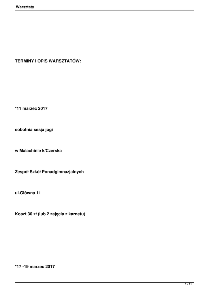 Warsztaty TERMINY I OPIS WARSZTATÓW: *11 marzec 2017 sobotnia sesja jogi w Malachinie k/Czerska Zespół Szkół Ponadgimnazjalnych ul.Główna 11 Koszt 30 zł (lub 2 zajęcia z karnetu) *17 -19 marzec 2017 1 / 11 Warsztaty weekend z jogą Cena 270 zł (1 wolne miejsce) *29 kwiecień - 3 maj 2017 majówka z jogą Cena 540 zł (wkrótce więcej informacji) . *********************************** 2 / 11 Warsztaty WARSZTATY WEEKENDOWE (informacje ogólne): 3 / 11 Warsztaty ZAJĘCIA jogi prowadzi : Halina Resler - dyplomowany nauczyciel jogi (więcej inf. w zakładce: prowadząca) MIEJSCE – gospodarstwo agroturystyczne Trzcionek w Borach Tucholskich (4 km od centrum Tucholi) Adres- Trzcionek 10, 89-500 Tuchola , tel. 52 3343709 4 / 11 Warsztaty DOJAZD – z Tucholi w kierunku Tleń, Śliwice ok. 4 km, mijamy firmę Hylmet po prawej stronie szosy i po 100m docieramy do zielonej tablicy końcowej Tucholi, tuż za nią jest dom po lewej stronie szosy ( ok. 100 m przed mostem na rzece Brda)- to tu. 5 / 11 Warsztaty ZAKWATEROWANIE w pokojach 2, 3 i 4 osobowych z łazienkami. WYŻYWIENIE wegetariańskie. ILOŚĆ miejsc ograniczona – max 16 osób, decyduje kolejność zgłoszeń. 6 / 11 Warsztaty ZABIERZ swoją matę i pasek, (jeśli nie masz- są na sali) ZGŁOSZENIA: tel. 693 555 173, e-mail: [email protected] ORIENTACYJNY PLAN ZAJĘĆ NA WEEKEND: 7 / 11 Warsztaty Piątek 19 - 20.30 joga 20.35 kolacja po kolacji gongi lub medytacja Sobota: 8.30 - herbata 8 / 11 Warsztaty 9.00 -11.30- joga 11.35 obiad 17 -18.30 joga 18.35 kolacja -po kolacji gongi lub medytacja 9 / 11 Warsztaty -Niedziela 8.30 - 9 herbata 9 -11.30 joga 11.35 obiad 15 -16.30 joga 16.35 kolacja 10 / 11 Warsztaty ******************************************************** 11 / 11