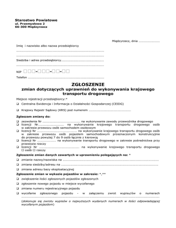 Starostwo Powiatowe ul. Przemysłowa 2 66-300 Międzyrzecz Międzyrzecz, dnia ……………………… Imię i nazwisko albo nazwa przedsiębiorcy .................................................................................... .................................................................................... Siedziba i adres przedsiębiorcy......................................... .................................................................................... NIP - - - Telefon ......................................................................... ZGŁOSZENIE zmian dotyczących uprawnień do wykonywania krajowego transportu drogowego Miejsce rejestracji przedsiębiorcy:* Centralna Ewidencja i Informacja o Działalności Gospodarczej (CEIDG) Krajowy Rejestr Sądowy (KRS) pod numerem ……………………………………………… Zgłaszam zmiany do: zezwolenia Nr ………………………………………… na wykonywanie zawodu przewoźnika drogowego licencji Nr…………………………… na wykonywanie krajowego transportu drogowego osób w zakresie przewozu osób samochodem osobowym licencji Nr …………………………………………… na wykonywanie krajowego transportu drogowego osób w zakresie przewozu osób pojazdem samochodowym przeznaczonym konstrukcyjnie do przewozu powyżej 7 do 9 osób łącznie z kierowcą licencji Nr …………………… na wykonywanie transportu drogowego w zakresie pośrednictwa przy przewozie rzeczy licencji Nr …………………………………………… na wykonywanie krajowego transportu drogowego osób rzeczy Zgłoszenie zmian danych zawartych w uprawnieniu polegających na: * zmianie nazwy/nazwiska na ............................................................................................ zmiana siedziby/adresu na ............................................................................................. zmiana adresu bazy eksploatacyjnej Zgłoszenie zmian w wykazie pojazdów w zakresie: *,** zwiększenie ilości zgłoszonych pojazdów zgłoszonych zgłoszenie nowego pojazdu w miejsce wycofanego zmiana numeru rejestracyjnego pojazdu wycofanie zgłoszonego pojazdu - w załączeniu zwrot wypisu/ów o numerach .................................................................................................................................... (dokonuje się zwrotu wypisów o najwyższych wydanych numerach w ilości odpowiadającej wycofanym pojazdom) Wydanie wypisu z uprawnienia w ilości …………… szt. w związku: *** zwiększenie ilości zgłoszonych pojazdów utrata wypisu/ów Nr ............................................................................. (podać numer/y) z powodu ...................................................................................................................... Oświadczam, iż w przypadku odzyskania utraconego wypisu zostanie on niezwłocznie zwrócony organowi licencyjnemu.** Inne zmiany dotyczące licencji: * zmiana składu osobowego (zarządu, wspólników spółki jawnej lub komandytowej) zmiana osoby zarządzającej transportem zmiana bazy eksploatacyjnej firmy *** zmiana/aktualizacja potwierdzenia odpowiedniej sytuacji finansowej .................................................................................................................................... Przedkładam następujące załączniki dotyczące zgłoszonych zmian: * „Wykaz pojazdów”, uwzględniający dokonane zmiany w zgłoszonym taborze *** dokumenty świadczące o posiadaniu sytuacji finansowej zapewniającej podjęcie i prowadzenie działalności gospodarczej w zakresie transportu drogowego oświadczenia dot. nowych członków zarządu, wspólników spółki jawnej lub komandytowej – „Oświadczenie o niekaralności” - do licencji, „Oświadczenie o spełnieniu wymogu dobrej reputacji” - do zezwolenia oświadczenie dot. osoby zarządzającej transportem - „Oświadczenie o niekaralności” - do licencji, „Oświadczenie o spełnieniu wymogu dobrej reputacji” - do zezwolenia kserokopia certyfikatu kompetencji zawodowych osoby zarządzającej transportem, „Oświadczenie osoby zarządzającej transportem” „Oświadczenie o zamiarze zatrudnienia kierowców” *** *-zakreślić właściwe kwadraty **-dotyczy sytuacji utraty wypisu ***-nie dotyczy pośrednictwa przy przewozie rzeczy .......................................... (podpis wnioskodawcy)