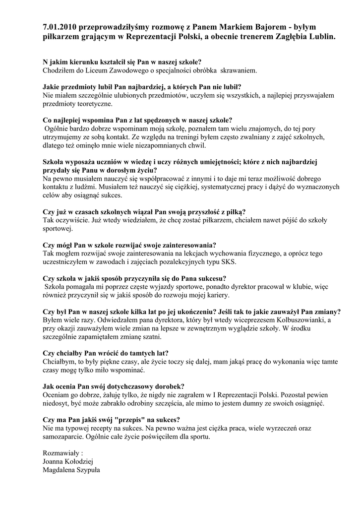 7.01.2010 przeprowadziłyśmy rozmowę z Panem Markiem Bajorem - byłym piłkarzem grającym w Reprezentacji Polski, a obecnie trenerem Zagłębia Lublin. N jakim kierunku kształcił się Pan w naszej szkole? Chodziłem do Liceum Zawodowego o specjalności obróbka skrawaniem. Jakie przedmioty lubił Pan najbardziej, a których Pan nie lubił? Nie miałem szczególnie ulubionych przedmiotów, uczyłem się wszystkich, a najlepiej przyswajałem przedmioty teoretyczne. Co najlepiej wspomina Pan z lat spędzonych w naszej szkole? Ogólnie bardzo dobrze wspominam moją szkołę, poznałem tam wielu znajomych, do tej pory utrzymujemy ze sobą kontakt. Ze względu na treningi byłem często zwalniany z zajęć szkolnych, dlatego też ominęło mnie wiele niezapomnianych chwil. Szkoła wyposaża uczniów w wiedzę i uczy różnych umiejętności; które z nich najbardziej przydały się Panu w dorosłym życiu? Na pewno musiałem nauczyć się współpracować z innymi i to daje mi teraz możliwość dobrego kontaktu z ludźmi. Musiałem też nauczyć się ciężkiej, systematycznej pracy i dążyć do wyznaczonych celów aby osiągnąć sukces. Czy już w czasach szkolnych wiązał Pan swoją przyszłość z piłką? Tak oczywiście. Już wtedy wiedziałem, że chcę zostać piłkarzem, chciałem nawet pójść do szkoły sportowej. Czy mógł Pan w szkole rozwijać swoje zainteresowania? Tak mogłem rozwijać swoje zainteresowania na lekcjach wychowania fizycznego, a oprócz tego uczestniczyłem w zawodach i zajęciach pozalekcyjnych typu SKS. Czy szkoła w jakiś sposób przyczyniła się do Pana sukcesu? Szkoła pomagała mi poprzez częste wyjazdy sportowe, ponadto dyrektor pracował w klubie, więc również przyczynił się w jakiś sposób do rozwoju mojej kariery. Czy był Pan w naszej szkole kilka lat po jej ukończeniu? Jeśli tak to jakie zauważył Pan zmiany? Byłem wiele razy. Odwiedzałem pana dyrektora, który był wtedy wiceprezesem Kolbuszowianki, a przy okazji zauważyłem wiele zmian na lepsze w zewnętrznym wyglądzie szkoły. W środku szczególnie zapamiętałem zmianę szatni. Czy chciałby Pan wrócić do tamtych lat? Chciałbym, to były piękne czasy, ale życie toczy się dalej, mam jakąś pracę do wykonania więc tamte czasy mogę tylko miło wspominać. Jak ocenia Pan swój dotychczasowy dorobek? Oceniam go dobrze, żałuję tylko, że nigdy nie zagrałem w I Reprezentacji Polski. Pozostał pewien niedosyt, być może zabrakło odrobiny szczęścia, ale mimo to jestem dumny ze swoich osiągnięć. Czy ma Pan jakiś swój "przepis" na sukces? Nie ma typowej recepty na sukces. Na pewno ważna jest ciężka praca, wiele wyrzeczeń oraz samozaparcie. Ogólnie całe życie poświęciłem dla sportu. Rozmawiały : Joanna Kołodziej Magdalena Szypuła