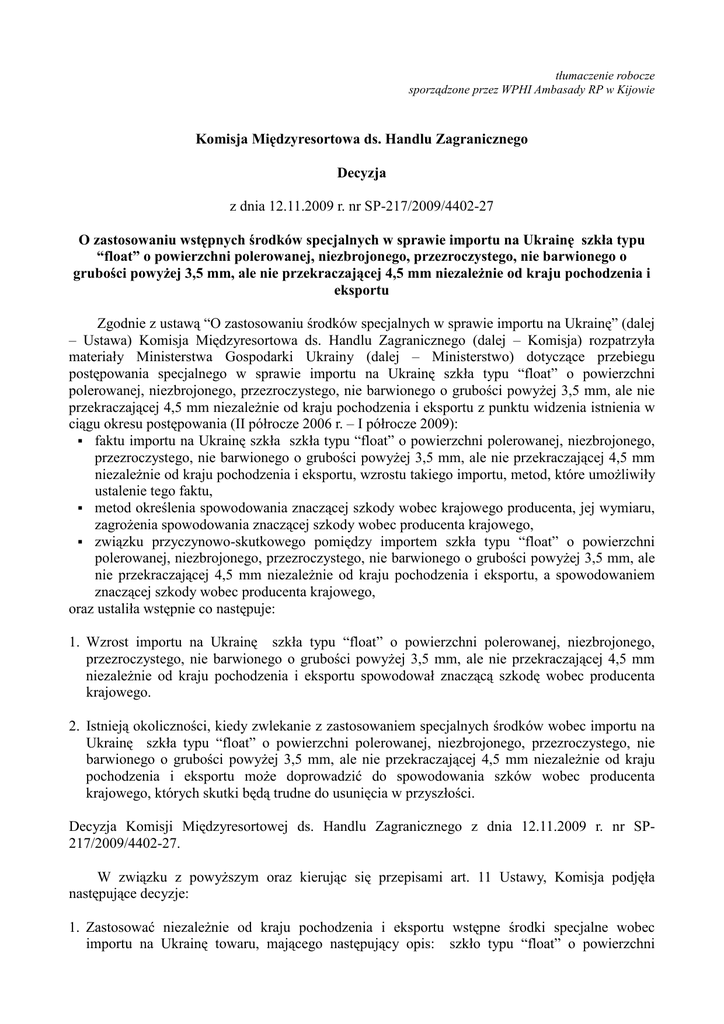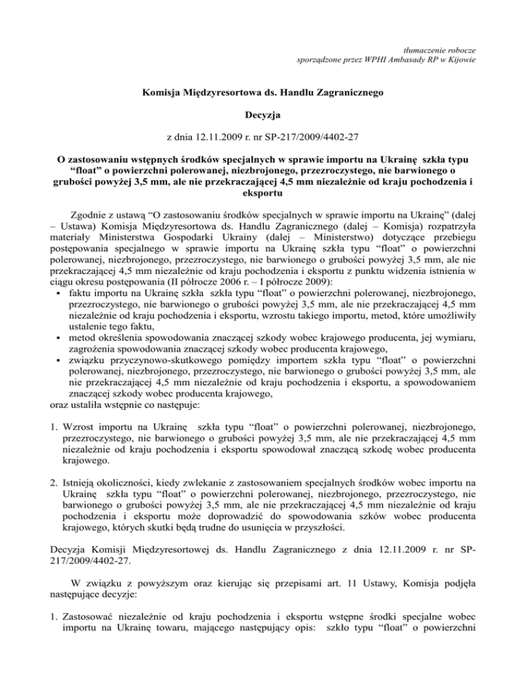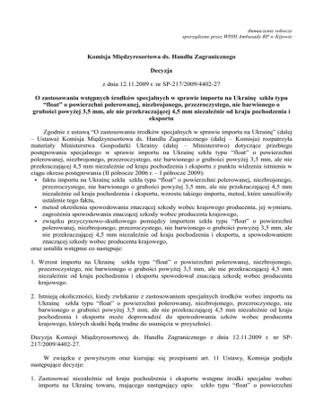 tłumaczenie robocze sporządzone przez WPHI Ambasady RP w Kijowie Komisja Międzyresortowa ds. Handlu Zagranicznego Decyzja z dnia 12.11.2009 r. nr SP-217/2009/4402-27 O zastosowaniu wstępnych środków specjalnych w sprawie importu na Ukrainę szkła typu “float” o powierzchni polerowanej, niezbrojonego, przezroczystego, nie barwionego o grubości powyŜej 3,5 mm, ale nie przekraczającej 4,5 mm niezaleŜnie od kraju pochodzenia i eksportu Zgodnie z ustawą “O zastosowaniu środków specjalnych w sprawie importu na Ukrainę” (dalej – Ustawa) Komisja Międzyresortowa ds. Handlu Zagranicznego (dalej – Komisja) rozpatrzyła materiały Ministerstwa Gospodarki Ukrainy (dalej – Ministerstwo) dotyczące przebiegu postępowania specjalnego w sprawie importu na Ukrainę szkła typu “float” o powierzchni polerowanej, niezbrojonego, przezroczystego, nie barwionego o grubości powyŜej 3,5 mm, ale nie przekraczającej 4,5 mm niezaleŜnie od kraju pochodzenia i eksportu z punktu widzenia istnienia w ciągu okresu postępowania (II półrocze 2006 r. – I półrocze 2009): faktu importu na Ukrainę szkła szkła typu “float” o powierzchni polerowanej, niezbrojonego, przezroczystego, nie barwionego o grubości powyŜej 3,5 mm, ale nie przekraczającej 4,5 mm niezaleŜnie od kraju pochodzenia i eksportu, wzrostu takiego importu, metod, które umoŜliwiły ustalenie tego faktu, metod określenia spowodowania znaczącej szkody wobec krajowego producenta, jej wymiaru, zagroŜenia spowodowania znaczącej szkody wobec producenta krajowego, związku przyczynowo-skutkowego pomiędzy importem szkła typu “float” o powierzchni polerowanej, niezbrojonego, przezroczystego, nie barwionego o grubości powyŜej 3,5 mm, ale nie przekraczającej 4,5 mm niezaleŜnie od kraju pochodzenia i eksportu, a spowodowaniem znaczącej szkody wobec producenta krajowego, oraz ustaliła wstępnie co następuje: 1. Wzrost importu na Ukrainę szkła typu “float” o powierzchni polerowanej, niezbrojonego, przezroczystego, nie barwionego o grubości powyŜej 3,5 mm, ale nie przekraczającej 4,5 mm niezaleŜnie od kraju pochodzenia i eksportu spowodował znaczącą szkodę wobec producenta krajowego. 2. Istnieją okoliczności, kiedy zwlekanie z zastosowaniem specjalnych środków wobec importu na Ukrainę szkła typu “float” o powierzchni polerowanej, niezbrojonego, przezroczystego, nie barwionego o grubości powyŜej 3,5 mm, ale nie przekraczającej 4,5 mm niezaleŜnie od kraju pochodzenia i eksportu moŜe doprowadzić do spowodowania szków wobec producenta krajowego, których skutki będą trudne do usunięcia w przyszłości. Decyzja Komisji Międzyresortowej ds. Handlu Zagranicznego z dnia 12.11.2009 r. nr SP217/2009/4402-27. W związku z powyŜszym oraz kierując się przepisami art. 11 Ustawy, Komisja podjęła następujące decyzje: 1. Zastosować niezaleŜnie od kraju pochodzenia i eksportu wstępne środki specjalne wobec importu na Ukrainę towaru, mającego następujący opis: szkło typu “float” o powierzchni polerowanej, niezbrojone, przezroczyste, nie barwione o grubości powyŜej 3,5 mm, ale nie przekraczającej 4,5 mm (dalej – Towar), klasyfikowanego zgodnie z Ukraińskim Klasyfikatorem Towarów Zagranicznej Działalności Gospodarczej pod kodem 7005 29 35 00. 2. Zadecydowała, Ŝe: 2.1 Wstępne środki specjalne zastosowywane są w drodze wprowadzenia cła specjalnego na importu na Ukrainę Towaru niezaleŜnie od kraju pochodzenia i eksportu. 2.2 Wysokość stawki cła specjalnego na import na Ukrainę Towaru wynosi 31,25%. 2.3 Wstępne środki specjalne zastosowywane są od momentu wejścia w Ŝycie niniejszej decyzji Komisji. 2.4 Okres działania wstępnych środków specjalnych stanowi 200 dni. 3. Zleciła do wykonania: 3.1 Ministerstwu: 3.1.1 Zapewnić opublikowanie komunikatu o niniejszej decyzji Komisji w gazecie “Uriadowyj Kurier” 3.1.2 Poinformować Państwową SłuŜbę Celną o niniejszej decyzji Komisji 3.1.3 W końcu okresu stosowania wstępnych środków specjalnych przekazać do Komisji sprawozdanie i wnioski dotyczące wyników ich zastosowania. 3.2 Państwowej SłuŜbie Celnej: 3.2.1 Przyjąć odpowiednie akty dla wykonania tej decyzji Komisji. 3.2.2 Podejmować niezbędne działania mające na celu zapobieganie importu na Ukrainę Towaru niezaleŜnie od kraju pochodzenia i eksportu z ominięciem zastosowania wstępnych środków specjalnych. 3.2.3 Zapewnić odprowadzenie specjalnego cła odpowiednio do opisu Towaru. 3.2.4 W ciągu stosowania wstępnych środków specjalnych co miesiąc przekazywać do Ministerstwa informacje o wielkościach faktycznego importu na Ukrainę Towaru niezaleŜnie od kraju pochodzenia i eksportu. 3.3 Ministerstwu Spraw Zagranicznych Ukrainy — notyfikować wszystkie organy kompetencyjne krajów eksportu o niniejszej decyzji Komisji. 4. Niniejsza decyzja Komisji wchodzi w Ŝycie z momentem opublikowania powiadomienia o niej w gazecie “Uriadowyj Kurier”