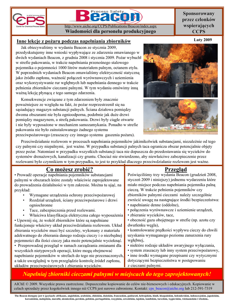 http://www.aiche.org/CCPS/Publications/Beacon/index.aspx Wiadomości dla personelu produkcyjnego Sponsorowany przez członków wspierających CCPS Luty 2009 Inne lekcje z pożaru podczas napełniania zbiorników Jak obiecywaliśmy w wydaniu Beacon ze stycznia 2009, przedyskutujemy inne wnioski wypływające ze zdarzenia omawianego w dwóch wydaniach Beacon, z grudnia 2008 i stycznia 2009. Pożar wybuchł w strefie pakowania, w trakcie napełniania przenośnego stalowego pojemnika o pojemności 1000 litrów materiałem palnym, octanem etylu. W poprzednich wydaniach Beacon omawialiśmy elektryczność statyczną jako źródło zapłonu, ważność połączeń wyrównawczych i uziemienia oraz wykorzystywanie rur wgłębnych lub napełniania dennego w trakcie pełnienia zbiorników cieczami palnymi. W tym wydaniu omówimy inną ważną lekcję płynącą z tego samego zdarzenia. Konsekwencje związane z tym zdarzeniem były znacznie poważniejsze ze względu na fakt, że pożar rozprzestrzenił się na sąsiadujący magazyn substancji palnych. Ściana działowa pomiędzy dwoma obszarami nie była ognioodporna, podobnie jak duże drzwi pomiędzy magazynem, a strefą pakowania. Drzwi były ciągle otwarte i nie były wyposażone w mechanizm samozamykania. Ponadto w strefie pakowania nie było zainstalowanego żadnego systemu przeciwpożarowego (zraszaczy czy innego systemu gaszenia pożaru). Przeciwdziałanie rozlewom w procesach napełniania pojemników jakimikolwiek substancjami, niezależnie od tego czy palnymi czy niepalnymi, jest ważne. W przypadku substancji palnych taca ogranicza obszar potencjalnie objęty przez pożar. Natomiast w przypadku wszystkich substancji taca nie dopuszcza do przedostawania się wycieków do systemów drenażowych, kanalizacji czy gruntu. Chociaż nie stwierdzono, aby niewłaściwe zabezpieczenie przez rozlewami było czynnikiem w tym przypadku, to jest to przykład dlaczego przeciwdziałanie rozlewom jest ważne. Co możesz zrobić? • Prowadź operacje napełniania pojemników substancjami palnymi w obszarach które zostały właściwie zaprojektowane do prowadzenia działalności w tym zakresie. Można tu ująć, na przykład: • Wymagane urządzenia ochrony przeciwpożarowej • Rozdział urządzeń, ściany przeciwpożarowe i drzwi ogniochronne • Tace, zabezpieczenia przed rozlewami. • Właściwa klasyfikacja elektryczna całego wyposażenia • Upewnij się, że wokół zbiorników które są napełniane funkcjonuje właściwy układ przeciwdziałania rozlewom. Układ zbierania wycieków musi być szczelny, wykonany z materiału adekwatnego do zbierania danego rodzaju cieczy i o niezbędnej pojemności dla ilości cieczy jaka może potencjalnie wycieknąć. • Przeprowadzaj przegląd w ramach zarządzania zmianami dla wszystkich nietypowych operacji, które mogą obejmować napełnianie pojemników w strefach do tego nie przeznaczonych, a także uwzględnij w tym przeglądzie kontrolę źródeł zapłonu, układów przeciwpożarowych i zbierania wycieków. Przegląd Poświęciliśmy trzy wydania Beacon (grudzień 2008, styczeń 2009 i niniejszy) jednemu wydarzeniu które miało miejsce podczas napełniania pojemnika palną cieczą. W trakcie pełnienia pojemników czy zbiorników palnymi cieczami należy szczególnie zwrócić uwagę na następujące środki bezpieczeństwa: • napełnianie denne (oddolne), • połączenia wyrównawcze i uziemienie urządzeń, • zbieranie wycieków, tace, • obecność gazu obojętnego w strefie (np. azotu czy dwutlenku węgla), • kontrolowanie prędkości wypływu cieczy do chwili uzyskania wymaganego poziomu zanurzenia rury wgłębnej, • niektóre rodzaje układów awaryjnego wyłączania, • system zraszaczy lub inny system przeciwpożarowy, • inne środki wymagane przepisami czy wytycznymi dotyczącymi bezpieczeństwa w postępowaniu z cieczami palnymi. Napełniaj zbiorniki cieczami palnymi w miejscach do tego zaprojektowanych! AIChE © 2009. Wszystkie prawa zastrzeżone. Dopuszczalne kopiowanie do celów nie-biznesowych i edukacyjnych. Kopiowanie w celach sprzedaży przez kogokolwiek innego niż CCPS jest surowo zabronione. Kontakt: [email protected] lub 212-591-7319 The Beacon dostępny jest w językach: afrikaans, angielskim, arabskim, chińskim, duńskim, francuskim, gudżarati, hebrajskim, hindi, hiszpańskim, holenderskim, indonezyjskim, japońskim, koreańskim, malajskim, marathi, niemieckim, perskim, polskim, portugalskim, rosyjskim, szwedzkim, tajskim, tamilskim, tureckim, węgierskim, wietnamskim i włoskim..