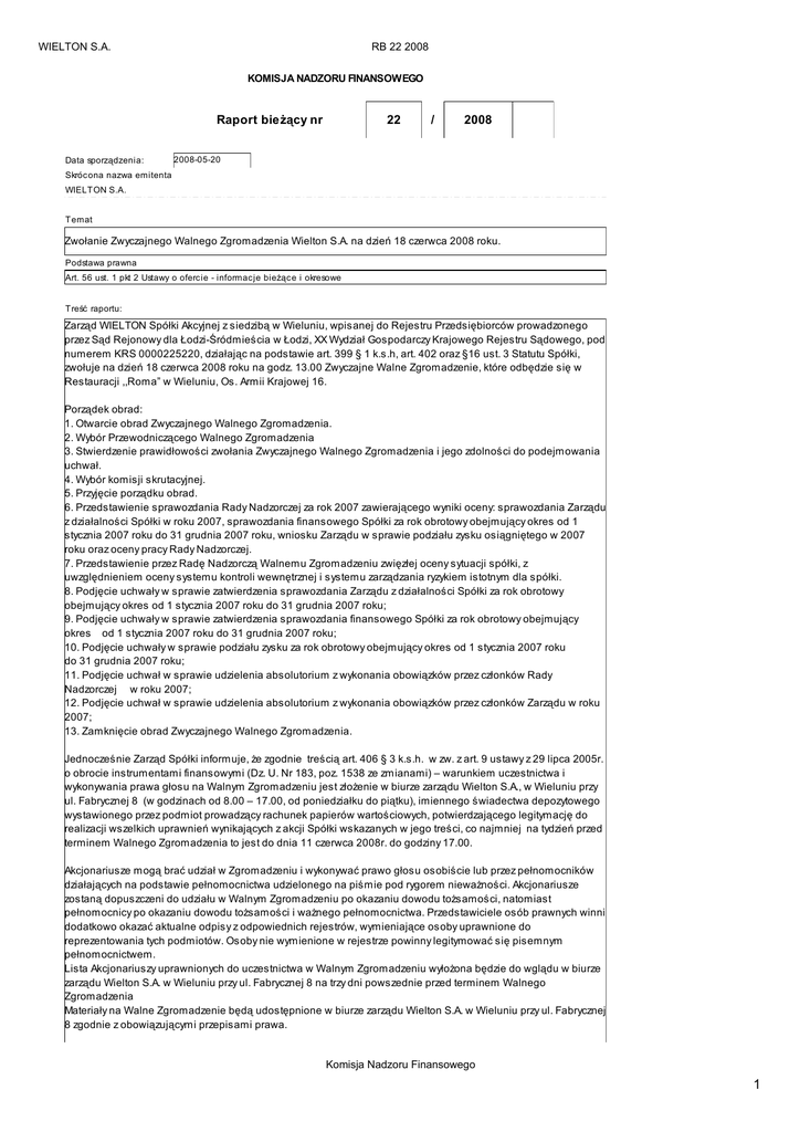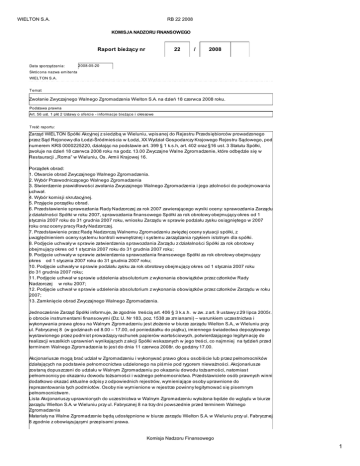 WIELTON S.A. RB 22 2008 KOMISJA NADZORU FINANSOWEGO Raport bieŜący nr Data sporządzenia: 22 / 2008 2008-05-20 Skrócona nazwa emitenta WIELTON S.A. Temat Zwołanie Zwyczajnego Walnego Zgromadzenia Wielton S.A. na dzień 18 czerwca 2008 roku. Podstawa prawna Art. 56 ust. 1 pkt 2 Ustawy o ofercie - informacje bieŜące i okresowe Treść raportu: Zarząd WIELTON Spółki Akcyjnej z siedzibą w Wieluniu, wpisanej do Rejestru Przedsiębiorców prowadzonego przez Sąd Rejonowy dla Łodzi-Śródmieścia w Łodzi, XX Wydział Gospodarczy Krajowego Rejestru Sądowego, pod numerem KRS 0000225220, działając na podstawie art. 399 § 1 k.s.h, art. 402 oraz §16 ust. 3 Statutu Spółki, zwołuje na dzień 18 czerwca 2008 roku na godz. 13.00 Zwyczajne Walne Zgromadzenie, które odbędzie się w Restauracji ,,Roma” w Wieluniu, Os. Armii Krajowej 16. Porządek obrad: 1. Otwarcie obrad Zwyczajnego Walnego Zgromadzenia. 2. Wybór Przewodniczącego Walnego Zgromadzenia 3. Stwierdzenie prawidłowości zwołania Zwyczajnego Walnego Zgromadzenia i jego zdolności do podejmowania uchwał. 4. Wybór komisji skrutacyjnej. 5. Przyjęcie porządku obrad. 6. Przedstawienie sprawozdania Rady Nadzorczej za rok 2007 zawierającego wyniki oceny: sprawozdania Zarządu z działalności Spółki w roku 2007, sprawozdania finansowego Spółki za rok obrotowy obejmujący okres od 1 stycznia 2007 roku do 31 grudnia 2007 roku, wniosku Zarządu w sprawie podziału zysku osiągniętego w 2007 roku oraz oceny pracy Rady Nadzorczej. 7. Przedstawienie przez Radę Nadzorczą Walnemu Zgromadzeniu zwięzłej oceny sytuacji spółki, z uwzględnieniem oceny systemu kontroli wewnętrznej i systemu zarządzania ryzykiem istotnym dla spółki. 8. Podjęcie uchwały w sprawie zatwierdzenia sprawozdania Zarządu z działalności Spółki za rok obrotowy obejmujący okres od 1 stycznia 2007 roku do 31 grudnia 2007 roku; 9. Podjęcie uchwały w sprawie zatwierdzenia sprawozdania finansowego Spółki za rok obrotowy obejmujący okres od 1 stycznia 2007 roku do 31 grudnia 2007 roku; 10. Podjęcie uchwały w sprawie podziału zysku za rok obrotowy obejmujący okres od 1 stycznia 2007 roku do 31 grudnia 2007 roku; 11. Podjęcie uchwał w sprawie udzielenia absolutorium z wykonania obowiązków przez członków Rady Nadzorczej w roku 2007; 12. Podjęcie uchwał w sprawie udzielenia absolutorium z wykonania obowiązków przez członków Zarządu w roku 2007; 13. Zamknięcie obrad Zwyczajnego Walnego Zgromadzenia. Jednocześnie Zarząd Spółki informuje, Ŝe zgodnie treścią art. 406 § 3 k.s.h. w zw. z art. 9 ustawy z 29 lipca 2005r. o obrocie instrumentami finansowymi (Dz. U. Nr 183, poz. 1538 ze zmianami) – warunkiem uczestnictwa i wykonywania prawa głosu na Walnym Zgromadzeniu jest złoŜenie w biurze zarządu Wielton S.A., w Wieluniu przy ul. Fabrycznej 8 (w godzinach od 8.00 – 17.00, od poniedziałku do piątku), imiennego świadectwa depozytowego wystawionego przez podmiot prowadzący rachunek papierów wartościowych, potwierdzającego legitymację do realizacji wszelkich uprawnień wynikających z akcji Spółki wskazanych w jego treści, co najmniej na tydzień przed terminem Walnego Zgromadzenia to jest do dnia 11 czerwca 2008r. do godziny 17.00. Akcjonariusze mogą brać udział w Zgromadzeniu i wykonywać prawo głosu osobiście lub przez pełnomocników działających na podstawie pełnomocnictwa udzielonego na piśmie pod rygorem niewaŜności. Akcjonariusze zostaną dopuszczeni do udziału w Walnym Zgromadzeniu po okazaniu dowodu toŜsamości, natomiast pełnomocnicy po okazaniu dowodu toŜsamości i waŜnego pełnomocnictwa. Przedstawiciele osób prawnych winni dodatkowo okazać aktualne odpisy z odpowiednich rejestrów, wymieniające osoby uprawnione do reprezentowania tych podmiotów. Osoby nie wymienione w rejestrze powinny legitymować się pisemnym pełnomocnictwem. Lista Akcjonariuszy uprawnionych do uczestnictwa w Walnym Zgromadzeniu wyłoŜona będzie do wglądu w biurze zarządu Wielton S.A. w Wieluniu przy ul. Fabrycznej 8 na trzy dni powszednie przed terminem Walnego Zgromadzenia Materiały na Walne Zgromadzenie będą udostępnione w biurze zarządu Wielton S.A. w Wieluniu przy ul. Fabrycznej 8 zgodnie z obowiązującymi przepisami prawa. Komisja Nadzoru Finansowego 1 WIELTON S.A. RB 22 2008 Dla sprawnego przebiegu obrad Walnego Zgromadzenia Zarząd Spółki Wielton S.A. prosi uczestników o przybycie na godzinę przed terminem rozpoczęcia posiedzenia w celu dokonania rejestracji i otrzymania kart do głosowania. WIELTON SPÓŁKA AKCYJNA (pełna nazwa emitenta) WIELTON S.A. Przemysł inne (pin) (skróc ona nazwa emitenta) 98-300 (sektor wg. klasyfikacji GPW w W-wie) Wieluń (kod pocztowy) (miejscowość) Baranowskiego 10A (ulica) (numer) 0 43 843 45 10 0 43 843 12 73 (telefon) (fax) [email protected] www.wielton.c om.pl (e-mail) (www) 899-24-62-770 932842826 (NIP) (REGON) PODPISY OSÓB REPREZENTUJĄCYCH SPÓŁKĘ Data Imię i Nazwisko Stanowisko/Funkc ja Podpis 2008-05-20 Włodzimierz Masłowski Prezes Zarządu Włodzimierz Masłowski 2008-05-20 Mariusz Golec Wic eprezes Zarządu Mariusz Golec 2008-05-20 Paweł Gońda Wic eprezes Zarządu Paweł Gońda Komisja Nadzoru Finansowego 2