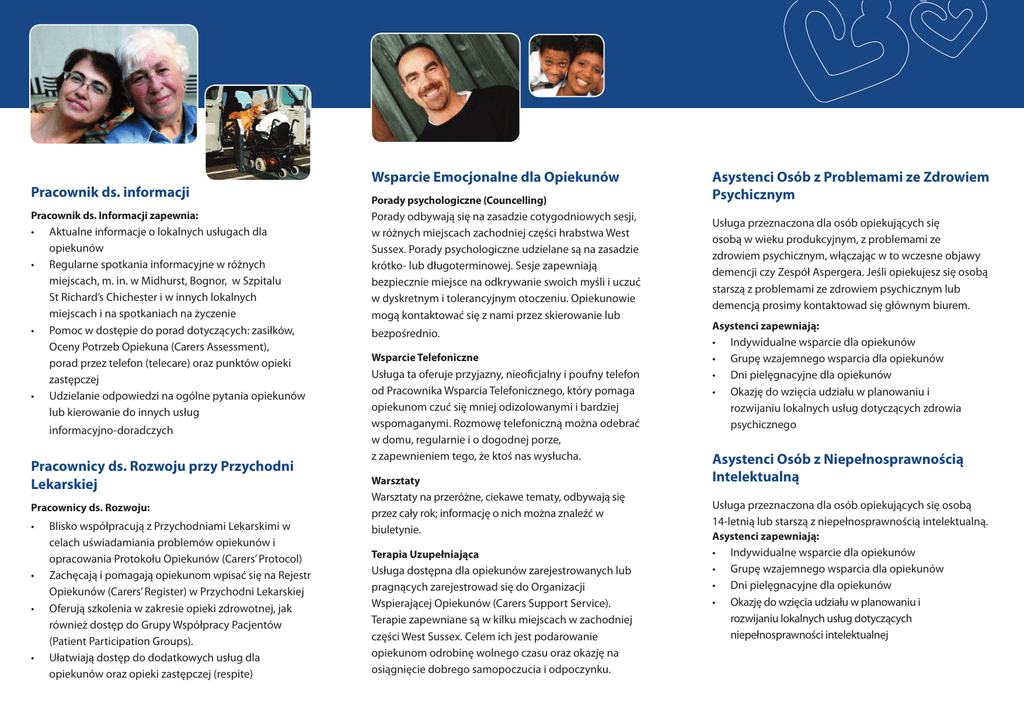 Wsparcie Emocjonalne dla Opiekunów Pracownik ds. informacji Pracownik ds. Informacji zapewnia: • • • • Aktualne informacje o lokalnych usługach dla opiekunów Regularne spotkania informacyjne w różnych miejscach, m. in. w Midhurst, Bognor, w Szpitalu St Richard’s Chichester i w innych lokalnych miejscach i na spotkaniach na życzenie Pomoc w dostępie do porad dotyczących: zasiłków, Oceny Potrzeb Opiekuna (Carers Assessment), porad przez telefon (telecare) oraz punktów opieki zastępczej Udzielanie odpowiedzi na ogólne pytania opiekunów lub kierowanie do innych usług informacyjno-doradczych Pracownicy ds. Rozwoju przy Przychodni Lekarskiej Pracownicy ds. Rozwoju: • • • • Blisko współpracują z Przychodniami Lekarskimi w celach uświadamiania problemów opiekunów i opracowania Protokołu Opiekunów (Carers’ Protocol) Zachęcają i pomagają opiekunom wpisać się na Rejestr Opiekunów (Carers’ Register) w Przychodni Lekarskiej Oferują szkolenia w zakresie opieki zdrowotnej, jak również dostęp do Grupy Współpracy Pacjentów (Patient Participation Groups). Ułatwiają dostęp do dodatkowych usług dla opiekunów oraz opieki zastępczej (respite) Porady psychologiczne (Councelling) Porady odbywają się na zasadzie cotygodniowych sesji, w różnych miejscach zachodniej części hrabstwa West Sussex. Porady psychologiczne udzielane są na zasadzie krótko- lub długoterminowej. Sesje zapewniają bezpiecznie miejsce na odkrywanie swoich myśli i uczuć w dyskretnym i tolerancyjnym otoczeniu. Opiekunowie mogą kontaktować się z nami przez skierowanie lub bezpośrednio. Wsparcie Telefoniczne Usługa ta oferuje przyjazny, nieoficjalny i poufny telefon od Pracownika Wsparcia Telefonicznego, który pomaga opiekunom czuć się mniej odizolowanymi i bardziej wspomaganymi. Rozmowę telefoniczną można odebrać w domu, regularnie i o dogodnej porze, z zapewnieniem tego, że ktoś nas wysłucha. Warsztaty Warsztaty na przeróżne, ciekawe tematy, odbywają się przez cały rok; informację o nich można znaleźć w biuletynie. Terapia Uzupełniająca Usługa dostępna dla opiekunów zarejestrowanych lub pragnących zarejestrowad się do Organizacji Wspierającej Opiekunów (Carers Support Service). Terapie zapewniane są w kilku miejscach w zachodniej części West Sussex. Celem ich jest podarowanie opiekunom odrobinę wolnego czasu oraz okazję na osiągnięcie dobrego samopoczucia i odpoczynku. Asystenci Osób z Problemami ze Zdrowiem Psychicznym Usługa przeznaczona dla osób opiekujących się osobą w wieku produkcyjnym, z problemami ze zdrowiem psychicznym, włączając w to wczesne objawy demencji czy Zespół Aspergera. Jeśli opiekujesz się osobą starszą z problemami ze zdrowiem psychicznym lub demencją prosimy kontaktowad się głównym biurem. Asystenci zapewniają: • • • • Indywidualne wsparcie dla opiekunów Grupę wzajemnego wsparcia dla opiekunów Dni pielęgnacyjne dla opiekunów Okazję do wzięcia udziału w planowaniu i rozwijaniu lokalnych usług dotyczących zdrowia psychicznego Asystenci Osób z Niepełnosprawnością Intelektualną Usługa przeznaczona dla osób opiekujących się osobą 14-letnią lub starszą z niepełnosprawnością intelektualną. Asystenci zapewniają: • • • • Indywidualne wsparcie dla opiekunów Grupę wzajemnego wsparcia dla opiekunów Dni pielęgnacyjne dla opiekunów Okazję do wzięcia udziału w planowaniu i rozwijaniu lokalnych usług dotyczących niepełnosprawności intelektualnej www.caressupportservice.org.uk Carers Support Service REGIS, CHICHESTER & RURAL Co zapewniamy: • Informacje i infolinię • Bezpłatny Podręcznik Opiekuna (Carers’ Handbook) • Dostęp do lokalnych Grup Wzajemnego Wsparcia dla Opiekunów (Carers’ Support Groups) • Bezpłatny kwartalny biuletyn • Regularne imprezy informacyjne i towarzyskie oraz szkolenia • Stronę internetową i blog przeznaczony dla opiekunów • Dostęp do Funduszu Krótkiego Odpoczynku (Short Term Breaks Fund), jak również możliwości finansowania dostępne poprzez Królewski Fundusz na Rzecz Opiekunów (The Princess Royal Trust for Carers) • Wsparcie Emocjonalne dla Opiekunów, m. in. porady psychologiczne, terapie uzupełniające i infolinię • Oddanych Asystentów (szczegóły w środku ulotki) • Pracowników ds. Rozwoju, blisko współpracujących z Przychodniami Lekarskimi w Bognor Regis, Chichester i na obszarze wiejskim. Skontaktuj się z nami w celu uzyskania dalszych informacji: Opiekujesz się kimś? Jeśli opiekujesz się partnerem, krewnym, dzieckiem, sąsiadem lub przyjacielem, który jest chory, niepełnosprawny lub niedołężny, to jesteś opiekunem. 1ST FLOOR, 1-2 ST PANCRAS, CHICHESTER, WEST SUSSEX, PO19 7SJ. Tel: 01243 537011 [email protected] www.carerssupportservice.org.uk