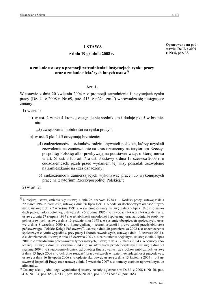 ©Kancelaria Sejmu s. 1/1 Opracowano na podstawie: Dz.U. z 2009 r. Nr 6, poz. 33. USTAWA z dnia 19 grudnia 2008 r. o zmianie ustawy o promocji zatrudnienia i instytucjach rynku pracy oraz o zmianie niektórych innych ustaw1) Art. 1. W ustawie z dnia 20 kwietnia 2004 r. o promocji zatrudnienia i instytucjach rynku pracy (Dz. U. z 2008 r. Nr 69, poz. 415, z późn. zm.2)) wprowadza się następujące zmiany: 1) w art. 1: a) w ust. 2 w pkt 4 kropkę zastępuje się średnikiem i dodaje pkt 5 w brzmieniu: „5) zwiększania mobilności na rynku pracy.”, b) w ust. 3 pkt 4 i 5 otrzymują brzmienie: „4) cudzoziemców – członków rodzin obywateli polskich, którzy uzyskali zezwolenie na zamieszkanie na czas oznaczony na terytorium Rzeczypospolitej Polskiej albo przebywają na podstawie wizy, o której mowa w art. 61 ust. 3 lub art. 71a ust. 3 ustawy z dnia 13 czerwca 2003 r. o cudzoziemcach, jeżeli przed wydaniem tej wizy posiadali zezwolenie na zamieszkanie na czas oznaczony; 5) cudzoziemców zamierzających wykonywać pracę lub wykonujących pracę na terytorium Rzeczypospolitej Polskiej.”; 2) w art. 2: 1) Niniejszą ustawą zmienia się: ustawę z dnia 26 czerwca 1974 r. – Kodeks pracy, ustawę z dnia 22 marca 1989 r. rzemiośle, ustawę z dnia 26 lipca 1991 r. o podatku dochodowym od osób fizycznych, ustawę z dnia 7 września 1991 r. o systemie oświaty, ustawę z dnia 5 lipca 1996 r. o zawodach pielęgniarki i położnej, ustawę z dnia 5 grudnia 1996 r. o zawodach lekarza i lekarza dentysty, ustawę z dnia 27 sierpnia 1997 r. o rehabilitacji zawodowej i społecznej oraz zatrudnianiu osób niepełnosprawnych, ustawę z dnia 13 października 1998 r. o systemie ubezpieczeń społecznych, ustawę z dnia 8 września 2000 r. o komercjalizacji, restrukturyzacji i prywatyzacji przedsiębiorstwa państwowego „Polskie Koleje Państwowe”, ustawę z dnia 30 października 2002 r. o ubezpieczeniu społecznym z tytułu wypadków przy pracy i chorób zawodowych, ustawę z dnia 13 czerwca 2003 r. o cudzoziemcach, ustawę z dnia 13 czerwca 2003 r. o zatrudnieniu socjalnym, ustawę z dnia 9 lipca 2003 r. o zatrudnianiu pracowników tymczasowych, ustawę z dnia 12 marca 2004 r. o pomocy społecznej, ustawę z dnia 30 kwietnia 2004 r. o świadczeniach przedemerytalnych, ustawę z dnia 27 sierpnia 2004 r. o świadczeniach opieki zdrowotnej finansowanych ze środków publicznych, ustawę z dnia 13 lipca 2006 r. o ochronie roszczeń pracowniczych w razie niewypłacalności pracodawcy, ustawę z dnia 16 listopada 2006 r. o opłacie skarbowej, ustawę z dnia 13 kwietnia 2007 r. o Państwowej Inspekcji Pracy oraz ustawę z dnia 7 września 2007 r. o pomocy osobom uprawnionym do alimentów. 2) Zmiany tekstu jednolitego wymienionej ustawy zostały ogłoszone w Dz.U. z 2008 r. Nr 70, poz. 416, Nr 134, poz. 850, Nr 171, poz. 1056, Nr 216, poz. 1367 i Nr 237, poz. 1654. 2009-03-26 ©Kancelaria Sejmu s. 2/2 a) w ust. 1: – uchyla się pkt 2a, – pkt 5 otrzymuje brzmienie: „5) bezrobotnym długotrwale – oznacza to bezrobotnego pozostającego w rejestrze powiatowego urzędu pracy łącznie przez okres ponad 12 miesięcy w okresie ostatnich 2 lat, z wyłączeniem okresów odbywania stażu i przygotowania zawodowego dorosłych;”, – po pkt 9 dodaje się pkt 9a i 9b w brzmieniu: „9a) doświadczeniu zawodowym – oznacza to doświadczenie uzyskane w trakcie zatrudnienia, wykonywania innej pracy zarobkowej lub prowadzenia działalności gospodarczej przez okres co najmniej 6 miesięcy; 9b) EURES – oznacza to europejskie służby zatrudnienia państw, o których mowa w art. 1 ust. 3 pkt 2 lit. a–c, realizujące działania obejmujące w szczególności pośrednictwo pracy wraz z doradztwem w zakresie mobilności na rynku pracy we współpracy ze związkami zawodowymi i organizacjami pracodawców;”, – uchyla się pkt 10, – pkt 11 otrzymuje brzmienie: „11) innej pracy zarobkowej – oznacza to wykonywanie pracy lub świadczenie usług na podstawie umów cywilnoprawnych, w tym umowy agencyjnej, umowy zlecenia, umowy o dzieło albo w okresie członkostwa w rolniczej spółdzielni produkcyjnej, spółdzielni kółek rolniczych lub spółdzielni usług rolniczych;”, – w pkt 12 lit. b i c otrzymują brzmienie: „b) koszt ubezpieczenia od następstw nieszczęśliwych wypadków w przypadku osób nieposiadających prawa do stypendium, c) koszty przejazdu, a w przypadku gdy szkolenie odbywa się w miejscowości innej niż miejsce zamieszkania, także koszty zakwaterowania i wyżywienia,”, – po pkt 12 dodaje się pkt 12a w brzmieniu: „12a) minimalnym wynagrodzeniu za pracę – oznacza to kwotę minimalnego wynagrodzenia za pracę pracowników przysługującą za pracę w pełnym miesięcznym wymiarze czasu pracy ogłaszaną na podstawie ustawy z dnia 10 października 2002 r. o minimalnym wynagrodzeniu za pracę (Dz. U. Nr 200, poz. 1679, z 2004 r. Nr 240, poz. 2407 oraz z 2005 r. Nr 157, poz. 1314);”, – w pkt 13: – lit. e otrzymuje brzmienie: „e) powierzenie wykonywania pracy cudzoziemcowi nieposiadającemu zezwolenia na pracę, w przypadkach gdy jest ono wymagane, lub powierzenie wykonywania pracy na innych warunkach lub na innym stanowisku niż 2009-03-26 ©Kancelaria Sejmu s. 3/3 określone w zezwoleniu na pracę, z zastrzeżeniem art. 88i;”, – uchyla się lit. f, – pkt 14 otrzymuje brzmienie: „14) nielegalnym wykonywaniu pracy przez cudzoziemca – oznacza to wykonywanie pracy przez cudzoziemca, który nie posiada ważnej wizy lub innego dokumentu uprawniającego go do pobytu na terytorium Rzeczypospolitej Polskiej, lub którego podstawa pobytu na terytorium Rzeczypospolitej Polskiej nie uprawnia do wykonywania pracy, lub który wykonuje pracę bez zezwolenia, w przypadkach gdy jest ono wymagane, lub na innych warunkach lub na innym stanowisku niż określone w zezwoleniu na pracę, z zastrzeżeniem art. 88i, lub bez zawarcia wymaganych umów o pracę albo umów cywilno