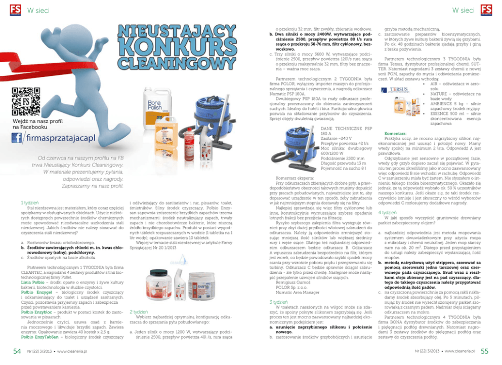 W sieci W sieci o przekroju 32 mm, filtr zwykły, zbieranie workowe. b. Dwa silniki o mocy 2400W, wytwarzające podciśnienie 2500, przepływ powietrza 80 l/s rura ssąca o przekroju 38-76 mm, filtr cyklonowy, bezworkowo. c. Trzy silniki o mocy 3600 W, wytwarzające podciśnienie 2500, przepływ powietrza 120l/s rura ssąca o przekroju maksymalnie 32 mm, filtry bez znaczenia – ważna moc ssąca. Partnerem technologicznym 2 TYGODNIA była firma POLOR, wyłączny importer maszyn do profesjonalnego sprzątania i czyszczenia, a nagrodą odkurzacz Numatic PSP 180A. Dwubiegowy PSP 180A to mały odkurzacz profesjonalny przeznaczony do zbierania zanieczyszczeń suchych. Idealny do hoteli i biur. Funkcjonalna głowica pozwala na składowanie przyborów do czyszczenia. Sprzęt objęty dwuletnią gwarancją. DANE TECHNICZNE PSP 180 A Zasilanie ~240 V Przepływ powietrza 42 l/s Moc silnika: dwubiegowy 600/1200 W Podciśnienie 2500 mm Długość przewodu 13 m Pojemność na sucho 8 l Od czerwca na naszym profilu na FB trwa Nieustający Konkurs Cleaningowy. W materiale prezentujemy pytania, odpowiedzi oraz nagrody. Zapraszamy na nasz profil. 1 tydzień Stal nierdzewna jest materiałem, który coraz częściej spotykamy w obsługiwanych obiektach. Użycie niektórych dostępnych powszechnie środków chemicznych może spowodować nieodwracalne uszkodzenia stali nierdzewnej. Jakich środków nie należy stosować do czyszczenia stali nierdzewnej? a. Roztworów kwasu ortofosforowego. b. Środków zawierających chlorki m. in. kwas chlorowodorowy (solny), podchloryny. c. Środków opartych na bazie alkoholu. Partnerem technologicznym 1 TYGODNIA była firma CLEANTEC, a nagrodami 4 zestawy produktów z linii biotechnologicznej firmy Pollet. Linia Polbio – środki oparte o enzymy i żywe kultury bakterii, biotechnologia w służbie czystości. Polbio Enzygel – biologiczny środek czyszczący i odkamieniający do toalet i urządzeń sanitarnych. Czyści, pozostawia przyjemny zapach i zabezpiecza przed powstawaniem kamienia. Polbio Enzybloc – produkt w postaci kostek do zastosowania w pisuarach. Jednocześnie czyści, usuwa osad z kamienia moczowego i likwiduje brzydki zapach. Zawiera enzymy. Opakowanie zawiera 40 kostek x 2,5 g. Polbio EnzyTabSan – biologiczny środek czyszczący 54 Nr [22] 3/2013 • www.cleaneria.pl i odświeżający do sanitariatów i rur, pisuarów, toalet, śmietników. Silny środek czyszczący, Polbio Enzysan zapewnia zniszczenie brzydkich zapachów trzema mechanizmami: środek neutralizujący zapach, trwały zapach i nie chorobotwórcze bakterie, które niszczą źródło brzydkiego zapachu. Produkt w postaci wygodnych tabletek rozpuszczanych w wodzie (1 tabletka na 1 litr wody); opakowanie zawiera 10 tabletek. Więcej w temacie stali nierdzewnej w artykule Firmy Sprzątającej Nr 20 1/2013 Komentarz eksperta: Przy odkurzaczach zbierających drobne pyły, a prawdopodobieństwo obecności takowych musimy dopuścić przy pracach pobudowlanych, najważniejsze jest to, aby dopasować urządzenie w ten sposób, żeby zabrudzenia w jak najmniejszym stopniu dostawały się na filtry. Najlepiej sprawdzają się więc filtry cyklonowe lub inne, konstrukcyjnie wymuszające szybsze opadanie lotnych frakcji bez przejścia na filtrację. Ryzyko szybszego zalepienia filtra występuje również przy zbyt dużej prędkości wlotowej zabrudzeń do odkurzacza. Należy ją odpowiednio zmniejszyć stosując mniejszą ilość silników lub większej średnicy rury i węże ssące. Dlatego też najbardziej odpowiednim odkurzaczem będzie odkurzacz B. Odkurzacz A wpuszcza zabrudzenia bezpośrednio na filtr, którym jest worek, co będzie powodowało szybki spadek mocy ssania przy wzroście poboru prądu i przegrzewaniu się turbiny. Odkurzacz C będzie sprawnie ściągał zabrudzenia - ale tylko przez chwilę. Następnie może nastąpić przepalenie uzwojeń silników ssących. Remigiusz Gumoś POLOR Sp. z o.o. Numatic Area Manager 3 tydzień 2 tydzień Wybierz najbardziej optymalną konfigurację odkurzacza do sprzątania pyłu pobudowlanego: a. Jeden silnik o mocy 1200 W, wytwarzający podciśnienie 2500, przepływ powietrza 40l /s, rura ssąca W toaletach narażonych na wilgoć może się zdarzyć, że spoiny pokryte silikonem zagrzybiają się. Jeśli proces ten jest mocno zaawansowany najbardziej ekonomicznym podejściem jest: a.usunięcie zagrzybionego silikonu i położenie nowego. b. zastosowanie środków grzybobójczych i usunięcie grzyba metodą mechaniczną, c. zastosowanie preparatów bioenzymatycznych, w których żywe kultury bakterii żywią się grzybami. Po ok. 48 godzinach bakterie zjadają grzyby i giną z braku pożywienia. Partnerem technologicznym 3 TYGODNIA była firma Tersus, dystrybutor profesjonalnej chemii SUTTER. Natomiast nagrodami 3 zestawy chemii z nowej serii POM, zapachy do mycia i odświeżania pomieszczeń. W skład zestawu wchodzą: • AIR – odświeżacz w aerozolu • NATURE – odświeżacz na bazie wody • AMBIENCE 5 kg – silnie zapachowy środek myjący • ESSENCE 500 ml – silnie skoncentrowana esencja zapachowa Komentarz: Praktyka uczy, że mocno zagrzybiony silikon najekonomiczniej jest usunąć i położyć nowy. Mamy wtedy spokój na minimum 2 lata. Odpowiedź A jest prawidłowa. Odgrzybianie jest sensowne w początkowej fazie, wtedy gdy grzyb dopiero zaczął się pojawiać. W pytaniu ten proces określiliśmy jako mocno zaawansowany więc odpowiedź B nie wchodzi w rachubę. Odpowiedź C w zamierzeniu miała być żartem. Nie słyszałem o istnieniu takiego środka bioenzynatycznego. Okazało się jednak, że tą odpowiedź wybrało ok. 50 % uczestników naszego konkursu. Jeśli okaże się, że taki środek rzeczywiście istnieje i jest skuteczny to wśród wyborców odpowiedzi C rozlosujemy dodatkowe nagrody. 4 tydzień W jaki sposób wyczyścić gruntownie drewniany parkiet zabezpieczony olejem? a. najbardziej odpowiednia jest metoda mopo