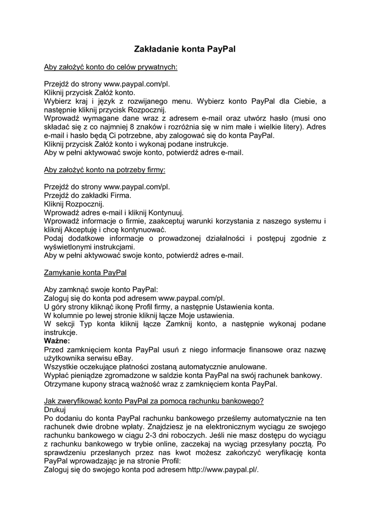 Zakładanie konta PayPal Aby założyć konto do celów prywatnych: Przejdź do strony www.paypal.com/pl. Kliknij przycisk Załóż konto. Wybierz kraj i język z rozwijanego menu. Wybierz konto PayPal dla Ciebie, a następnie kliknij przycisk Rozpocznij. Wprowadź wymagane dane wraz z adresem e-mail oraz utwórz hasło (musi ono składać się z co najmniej 8 znaków i rozróżnia się w nim małe i wielkie litery). Adres e-mail i hasło będą Ci potrzebne, aby zalogować się do konta PayPal. Kliknij przycisk Załóż konto i wykonaj podane instrukcje. Aby w pełni aktywować swoje konto, potwierdź adres e-mail. Aby założyć konto na potrzeby firmy: Przejdź do strony www.paypal.com/pl. Przejdź do zakładki Firma. Kliknij Rozpocznij. Wprowadź adres e-mail i kliknij Kontynuuj. Wprowadź informacje o firmie, zaakceptuj warunki korzystania z naszego systemu i kliknij Akceptuję i chcę kontynuować. Podaj dodatkowe informacje o prowadzonej działalności i postępuj zgodnie z wyświetlonymi instrukcjami. Aby w pełni aktywować swoje konto, potwierdź adres e-mail. Zamykanie konta PayPal Aby zamknąć swoje konto PayPal: Zaloguj się do konta pod adresem www.paypal.com/pl. U góry strony kliknąć ikonę Profil firmy, a następnie Ustawienia konta. W kolumnie po lewej stronie kliknij łącze Moje ustawienia. W sekcji Typ konta kliknij łącze Zamknij konto, a następnie wykonaj podane instrukcje. Ważne: Przed zamknięciem konta PayPal usuń z niego informacje finansowe oraz nazwę użytkownika serwisu eBay. Wszystkie oczekujące płatności zostaną automatycznie anulowane. Wypłać pieniądze zgromadzone w saldzie konta PayPal na swój rachunek bankowy. Otrzymane kupony stracą ważność wraz z zamknięciem konta PayPal. Jak zweryfikować konto PayPal za pomocą rachunku bankowego? Drukuj Po dodaniu do konta PayPal rachunku bankowego prześlemy automatycznie na ten rachunek dwie drobne wpłaty. Znajdziesz je na elektronicznym wyciągu ze swojego rachunku bankowego w ciągu 2-3 dni roboczych. Jeśli nie masz dostępu do wyciągu z rachunku bankowego w trybie online, zaczekaj na wyciąg przesyłany pocztą. Po sprawdzeniu przesłanych przez nas kwot możesz zakończyć weryfikację konta PayPal wprowadzając je na stronie Profil: Zaloguj się do swojego konta pod adresem http://www.paypal.pl/. U góry strony kliknij ikonę Profil firmy (obok Wyloguj się), a następnie Ustawienia konta. W kolumnie po lewej stronie kliknij łącze Moje pieniądze. W sekcji Rachunki bankowe kliknij łącze Niepotwierdzony. Kliknij przycisk Potwierdź. Wprowadź kwoty wpłat i wykonaj podane instrukcje. Jeśli kwoty są poprawne, Twój rachunek bankowy zostanie automatycznie potwierdzony. Proces ten: Umożliwia Ci zweryfikowanie konta PayPal, nawet jeśli nie masz karty kredytowej. Znosi Twoje limity na wysyłanie i wypłatę środków. Potwierdza, że jesteś właścicielem wykorzystanego w tym celu rachunku bankowego. Czy mogę wysyłać pieniądze przed zweryfikowaniem konta PayPal? Drukuj Po założeniu konta PayPal możesz wysyłać pieniądze do dowolnych osób dysponujących adresem e-mail. Ze względów bezpieczeństwa ustaliliśmy jednak roczny limit wysyłania, który możesz usunąć poprzez zweryfikowanie swojego konta PayPal. Weryfikacja polega na dodaniu i potwierdzeniu karty lub rachunku bankowego. Aby dokonać weryfikacji swojego konta PayPal: Przejdź do strony https://www.paypal.com/pl i zaloguj się do konta. Kliknij Więcej opcji. Kliknij link Co nowego. W sekcji Mój Profil i ustawienia kliknij Wyświetl limity na koncie. Zaznacz odpowiednie opcje (limity wysyłania i wypłat) i kliknij przycisk Usuń limity. Wykonaj podane instrukcje. Jak mogę zmienić typ konta? Aby rozszerzyć konto osobiste do konta specjalnego lub firmowego: Zaloguj się do swojego konta PayPal pod adresem http://www.paypal.pl/. W części Ulepsz konto kliknij łącze Rozszerz konto. Kliknij przycisk Rozszerz swoje konto. Wybierz opcję Konto firmowe lub Konto specjalne. Aby rozszerzyć swoje konto, kliknij przycisk Kontynuuj. Jeśli chcesz rozszerzyć swoje konto do konta firmowego, wprowadź informacje o firmie i kliknij przycisk Prześlij. Aby rozszerzyć konto specjalne do konta firmowego, wykonaj następujące czynności: Zaloguj się do swojego konta PayPal pod adresem http://www.paypal.pl. Na pasku menu u góry strony kliknij łącze Profil. W kolumnie po lewej stronie kliknij łącze Moje dane osobowe. W sekcji Informacje o firmie kliknij łącze Zaktualizuj. Kliknij przycisk Rozszerz. Wprowadź informacje o firmie, a następnie kliknij przycisk Prześlij.