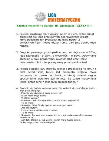 Zadania konkursowe dla klas III gimnazjum – ZESTAW 4. 1. Pewien prostokąt ma wymiary 12 cm x 7 cm. Przez punkt przecięcia się jego przekątnych poprowadzono prostą, która podzieliła ten prostokąt na dwie figury. Z powstałych figur można ułożyć romb. Jaki jest obwód tego rombu? 2. Długość pewnego prostopadłościanu zmniejszono o 20%, jego szerokość - o 25%, a wysokość – o 50%. Otrzymano sześcian o polu powierzchni równym 864 cm2. Jakie pole powierzchni miał początkowy prostopadłościan? 3. Pociąg długości 600 metrów jechał z prędkością 48 km/h i miał przed sobą tunel. Od momentu wejścia czoła parowozu do tunelu do chwili, w której ostatni wagon opuścił tunel upłynęło 2,5 minuty. Ile czasu maszynista jechał przez tunel? Jaka była długość tunelu? 4. Spotkało się dwóch matematyków. Nie widzieli się dość długo, jeden więc pyta drugiego: - Pewnie się ożeniłeś i masz dzieci, co? - A tak mam troje dzieci. - W jakim wieku? - Powiem ci tak: iloczyn wieku moich dzieci wynosi 36. - To za mało. - Słusznie. Odwróć się i policz okna w tym domu. - Już policzyłem. - I masz sumę wieku moich dzieci. - To za mało. - Słusznie. Ale weź pod uwagę to, że moje najstarsze dziecko ma zielone oczy…. - Ach tak. Dzięki ci, już wiem , ile lat mają twoje dzieci. Ile lat mają dzieci matematyka?