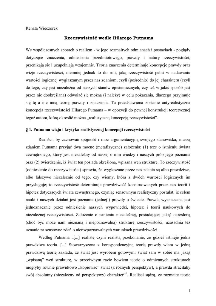 Renata Wieczorek Rzeczywistość wedle Hilarego Putnama We współczesnych sporach o realizm - w jego rozmaitych odmianach i postaciach - poglądy dotyczące znaczenia, odniesienia przedmiotowego, prawdy i natury rzeczywistości, przenikają się i uzupełniają wzajemnie. Teoria znaczenia determinuje koncepcje prawdy oraz wizje rzeczywistości, niemniej jednak to do roli, jaką rzeczywistość pełni w nadawaniu wartości logicznej wygłaszanym przez nas zdaniom, czyli (pośrednio) do jej charakteru (czyli do tego, czy jest niezależna od naszych stanów epistemicznych, czy też w jakiś sposób jest przez nie dookreślana) odwołać się można (i należy) w celu pokazania, dlaczego przyjmuje się tę a nie inną teorię prawdy i znaczenia. Tu przedstawiona zostanie antyrealistyczna koncepcja rzeczywistości Hilarego Putnama – w opozycji do pewnej konstrukcji teoretycznej tegoż autora, którą określić można „realistyczną koncepcją rzeczywistości”. § 1. Putnama wizja i krytyka realistycznej koncepcji rzeczywistości Realiści, by zachować spójność i moc argumentacyjną swojego stanowiska, muszą zdaniem Putnama przyjąć dwa mocne (metafizyczne) założenia: (1) tezę o istnieniu świata zewnętrznego, który jest niezależny od naszej o nim wiedzy i naszych prób jego poznania oraz (2) twierdzenie, iż świat ten posiada określoną, wpisaną weń strukturę. To rzeczywistość (odniesienie do rzeczywistości) sprawia, że wygłaszane przez nas zdania są albo prawdziwe, albo fałszywe niezależnie od tego, czy wiemy, która z dwóch wartości logicznych im przysługuje; to rzeczywistość determinuje prawdziwość konstruowanych przez nas teorii i hipotez dotyczących świata zewnętrznego, czyniąc sensownym realistyczny postulat, iż celem nauki i naszych działań jest poznanie (jednej!) prawdy o świecie. Prawda wyznaczana jest jednoznacznie przez odniesienie naszych wypowiedzi, hipotez i teorii naukowych do niezależnej rzeczywistości. Założenie o istnieniu niezależnej, posiadającej jakąś określoną (choć być może nam nieznaną i niepoznawalną) strukturę rzeczywistości, uzasadnia też uznanie za sensowne zdań o nierozpoznawalnych warunkach prawdziwości. Według Putnama „[...] realistę czyni realistą przekonanie, że gdzieś istnieje jedna prawdziwa teoria. [...] Stowarzyszona z korespondencyjną teorią prawdy wiara w jedną prawdziwą teorię zakłada, że świat jest wyrobem gotowym: świat sam w sobie ma jakąś „wpisaną” weń strukturę, w przeciwnym razie bowiem teorie o odmiennych strukturach mogłyby równie prawidłowo „kopiować” świat (z różnych perspektyw), a prawda straciłaby swój absolutny (niezależny od perspektywy) charakter”1. Realiści sądzą, że rozmaite teorie 1 ujmują z różnych perspektyw ten sam świat; świat rzeczy niezależnych od wyboru pojęć, z którego, jak z ciasta, wykrawać możemy rozmaitych kształtów (zależnie od układu pojęciowego) elementy. Elementy te, jak układanka, w ostatecznym rozrachunku powinny dać się złożyć w teorię doskonale pasującą do owej niezależnej rzeczywistości. Jednakże idea przedmiotów istniejących niezależnie od układu pojęciowego jest błędna. Jest tak dlatego, że nie istnieją żadne normy stosowania nawet pojęć logicznych poza wyborami pojęciowymi. „Żądać, by wszystkie ujęcia były redukowalne do jednego, to błędnie zakładać, że pytanie ‘Które przedmioty są rzeczywiste?’ ma sens niezależnie od wyboru pojęć”2. Na poparcie tego opozycyjnego względem realizmu poglądu przywołać można, za Putnamem, następujący sposób argumentacji. Argumentacja ta odwołuje się do rozumowania związanego z przeniesieniem na grunt teorii nie-matematycznych paradoksu wynikającego z twierdzenia Skolema – Löwenheima oraz do przyjętej przez Putnama tezy o zachodzeniu względności pojęciowej. Paradoks Skolema wskazuje zdaniem Putnama na fakt, iż żadna z wielu możliwych relacji odniesienia nie jest metafizycznie wyróżniona jako jedyna i właściwa, niedorzeczne staje się zatem postulowanie możliwości odkrycia „ostatecznej” teorii opisującej w sposób najlepszy z dostępnych strukturę świata3. Równie bezsensowne jest upieranie się, że istnieje całkowicie niezależny od nas „świat noumenów” posiadający określoną, zafiksowana strukturę. Putnam twierdzi, iż niemożność wyznaczenia jednego modelu właściwego rzeczywistości godzi w realistyczne założenie o niezależności prawdy od perspektywy poznawczej czy też przyjętej teorii albo ogólniej: od układu pojęciowego. Pewne zdania są prawdziwe w sensie nadanym im w ramach jednej teorii, a fałszywe na gruncie innej; nie mamy możliwości przyjrzenia się tym zdaniom z ponadteoretycznej perspektywy. Nie ma i być nie może jednego „właściwego” modelu rzeczywistości; jest wiele jednakowo „właściwych” modeli. Struktura świata, a zatem także prawda, zostają zrelatywizowane do wyboru układu pojęciowego - w różnych układach otrzymujemy różne zdania prawdziwe w różny sposób opisujące to, z czego składa się świat. Świadczy to o zachodzeniu zjawiska względności pojęciowej. _______________ 1 Hilary Putnam, „Dlaczego świat nie jest wyrobem gotowym”, w: Putnam, Wiele twarzy realizmu i inne eseje, tłum. A Grobler, Warszawa 1998, s. 234. 2 Hilary Putnam, „Wiele twarzy realizmu”, w: Putnam, Wiele twarzy realizmu i inne eseje ..., s. 346. 3 Szerzej o antyrealistycznej argumentacji Putnama posiłkującej się paradoksalnymi wynikami twierdzenia Skolema – Löwenheima pisałam w artykule „Modele i rzeczywistość. Argument Hilarego Putnama przeciwko realizmowi metafizycznemu”, Filozofia Nauki, Rok IX, Nr 3 (35), s. 101-111. 2 Wprowadzona przez Putnama teza o względności pojęciowej mówi, że w praktyce mamy do czynienia z wieloma, często niezgodnymi opisami (pozornie) tych samych faktów. Wyobraźmy sobie mian
