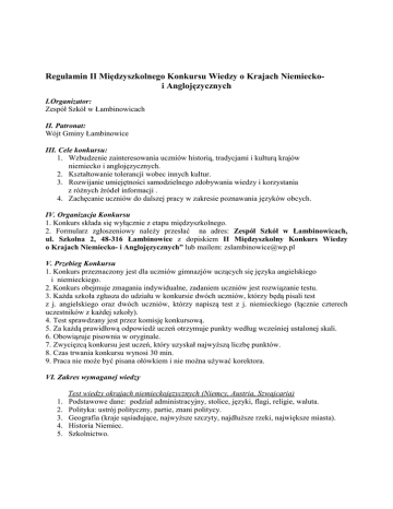 Regulamin II Międzyszkolnego Konkursu Wiedzy o Krajach Niemieckoi Anglojęzycznych I.Organizator: Zespół Szkół w Łambinowicach II. Patronat: Wójt Gminy Łambinowice III. Cele konkursu: 1. Wzbudzenie zainteresowania uczniów historią, tradycjami i kulturą krajów niemiecko i anglojęzycznych. 2. Kształtowanie tolerancji wobec innych kultur. 3. Rozwijanie umiejętności samodzielnego zdobywania wiedzy i korzystania z różnych źródeł informacji . 4. Zachęcanie uczniów do dalszej pracy w zakresie poznawania języków obcych. IV. Organizacja Konkursu 1. Konkurs składa się wyłącznie z etapu międzyszkolnego. 2. Formularz zgłoszeniowy należy przesłać na adres: Zespół Szkół w Łambinowicach, ul. Szkolna 2, 48-316 Łambinowice z dopiskiem II Międzyszkolny Konkurs Wiedzy o Krajach Niemiecko- i Anglojęzycznych” lub mailem: [email protected] V. Przebieg Konkursu 1. Konkurs przeznaczony jest dla uczniów gimnazjów uczących się języka angielskiego i niemieckiego. 2. Konkurs obejmuje zmagania indywidualne, zadaniem uczniów jest rozwiązanie testu. 3. Każda szkoła zgłasza do udziału w konkursie dwóch uczniów, którzy będą pisali test z j. angielskiego oraz dwóch uczniów, którzy napiszą test z j. niemieckiego (łącznie czterech uczestników z każdej szkoły). 4. Test sprawdzany jest przez komisję konkursową. 5. Za każdą prawidłową odpowiedź uczeń otrzymuje punkty według wcześniej ustalonej skali. 6. Obowiązuje pisownia w oryginale. 7. Zwycięzcą konkursu jest uczeń, który uzyskał najwyższą liczbę punktów. 8. Czas trwania konkursu wynosi 30 min. 9. Praca nie może być pisana ołówkiem i nie można używać korektora. VI. Zakres wymaganej wiedzy 1. 2. 3. 4. 5. Test wiedzy okrajach niemieckojęzycznych (Niemcy, Austria, Szwajcaria) Podstawowe dane: podział administracyjny, stolice, języki, flagi, religie, waluta. Polityka: ustrój polityczny, partie, znani politycy. Geografia (kraje sąsiadujące, najwyższe szczyty, najdłuższe rzeki, największe miasta). Historia Niemiec. Szkolnictwo. 6. 7. 8. 9. Obcokrajowcy w Niemczech. Święta, zwyczaje. Społeczeństwo, życie codzienne. Unia Europejska – podstawowe informacje Test wiedzy o krajach anglojęzycznych 1. Symbole narodowe Stanów Zjednoczonych i Wielkiej Brytanii. 2. Geografia Stanów Zjednoczonych i Wielkiej Brytanii. 3. Ustrój Polityczny. 4. Święta: Guy Fawke’s Day, ST. Patrick’s Day, Independence Day, Valentine’s Day, Thanksgiving, Haloween, Christmas, Easter. 5. Historia: Najazd Normanów, Wojna Dwóch Róż, Henryk VIII, Elżbieta I, Wojna o Niepodległość Stanów Zjednoczonych, Wojna Secesyjna. 6. Szkolnictwo. 7. Miary i wagi. 8. Sławni ludzie. 9. Jedzenie. VII. Jury W skład jury wchodzą opiekunowie z poszczególnych szkół. VIII. Nagrody 1. Uczestnicy konkursu, którzy zajmą trzy pierwsze miejsca otrzymają nagrody. 2. Szkoła, której reprezentanci uzyskają najwyższą liczbę punktów z obu testów, zostanie uhonorowana pucharem. 3. Dla wszystkich uczestników konkursu przewidziane są dyplomy. IX. Harmonogram konkursu 10.00 uroczyste rozpoczęcie Konkursu 10.15 rozwiązanie zadań testowych 10.45 poczęstunek dla uczestników konkursu, sprawdzenie prac 11.30 ogłoszenie wyników i wręczenie nagród 11.45 – 12.00 zakończenie imprezy, krótki program przygotowany przez uczniów Zespołu Szkół w Łambinowicach