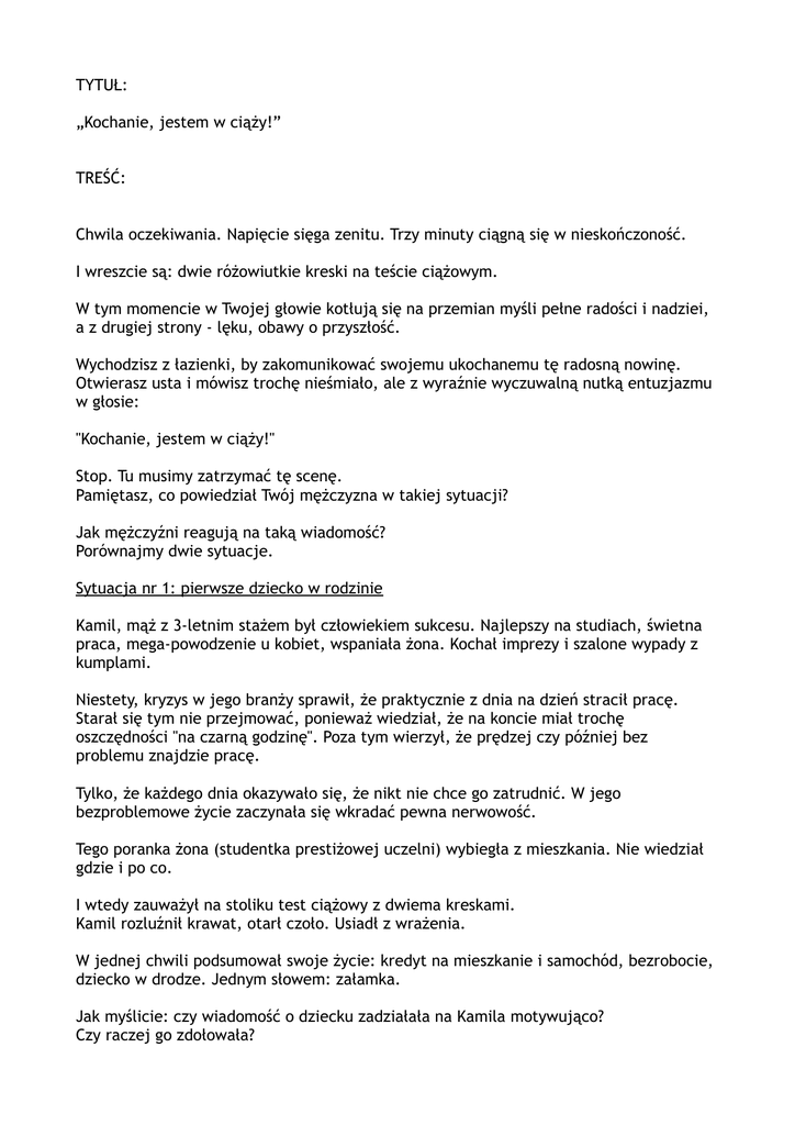 TYTUŁ: „Kochanie, jestem w ciąży!” TREŚĆ: Chwila oczekiwania. Napięcie sięga zenitu. Trzy minuty ciągną się w nieskończoność. I wreszcie są: dwie różowiutkie kreski na teście ciążowym. W tym momencie w Twojej głowie kotłują się na przemian myśli pełne radości i nadziei, a z drugiej strony - lęku, obawy o przyszłość. Wychodzisz z łazienki, by zakomunikować swojemu ukochanemu tę radosną nowinę. Otwierasz usta i mówisz trochę nieśmiało, ale z wyraźnie wyczuwalną nutką entuzjazmu w głosie: "Kochanie, jestem w ciąży!" Stop. Tu musimy zatrzymać tę scenę. Pamiętasz, co powiedział Twój mężczyzna w takiej sytuacji? Jak mężczyźni reagują na taką wiadomość? Porównajmy dwie sytuacje. Sytuacja nr 1: pierwsze dziecko w rodzinie Kamil, mąż z 3-letnim stażem był człowiekiem sukcesu. Najlepszy na studiach, świetna praca, mega-powodzenie u kobiet, wspaniała żona. Kochał imprezy i szalone wypady z kumplami. Niestety, kryzys w jego branży sprawił, że praktycznie z dnia na dzień stracił pracę. Starał się tym nie przejmować, ponieważ wiedział, że na koncie miał trochę oszczędności "na czarną godzinę". Poza tym wierzył, że prędzej czy później bez problemu znajdzie pracę. Tylko, że każdego dnia okazywało się, że nikt nie chce go zatrudnić. W jego bezproblemowe życie zaczynała się wkradać pewna nerwowość. Tego poranka żona (studentka prestiżowej uczelni) wybiegła z mieszkania. Nie wiedział gdzie i po co. I wtedy zauważył na stoliku test ciążowy z dwiema kreskami. Kamil rozluźnił krawat, otarł czoło. Usiadł z wrażenia. W jednej chwili podsumował swoje życie: kredyt na mieszkanie i samochód, bezrobocie, dziecko w drodze. Jednym słowem: załamka. Jak myślicie: czy wiadomość o dziecku zadziałała na Kamila motywująco? Czy raczej go zdołowała? Sytuacja nr 2: n-te dziecko w rodzinie Artur, ojciec piątki dzieci, jadł właśnie śniadanie i przeglądał z nudów wczorajszą gazetę, gdy usłyszał dochodzący z łazienki krzyk żony: - "Kochanie, jestem w ciąży!" - "Ooo, fajnie, cieszę się!" (fantastyczna reakcja faceta, prawda?) Tu trzeba zaznaczyć, że Artur słyszał już podobny tekst pięć razy, więc człowiek mógł się przyzwyczaić. Dlatego też nie powinny nas dziwić dalsze słowa mężczyzny: - "No dobra, pogadamy wieczorem, lecę do roboty. Co będzie na kolację?" Jednak niech nie zmyli was pozorny spokój Artura. Tego dnia w pracy nie mógł się na niczym skupić. Zastanawiał się kiedy najlepiej będzie pójść do szefa i poprosić o podwyżkę. Zaczął nawet podczas przerwy przeglądać ogłoszenia motoryzacyjne (szukał busa albo wręcz jakiegoś małego autobusu, który pomieścił by jego rodzinę). Wnioski: Dziecko / dzieci powodują, że mężczyźni nie tylko stają się mniej egoistyczni i zapatrzeni w siebie, ale przede wszystkim - bardziej kreatywni. Widmo braku pieniędzy na utrzymanie rodziny sprawia, że faceci stają na głowie, żeby zapewnić byt swoim najbliższym. Szukają dodatkowej pracy, zakładają własne firmy, wiele przy tym ryzykując. Ale wiedzą, że tak trzeba. Dodajmy - prawdziwi faceci. Niektórym bowiem zdarza się zdezerterować z pola bitwy pt. "życie rodzinne"...