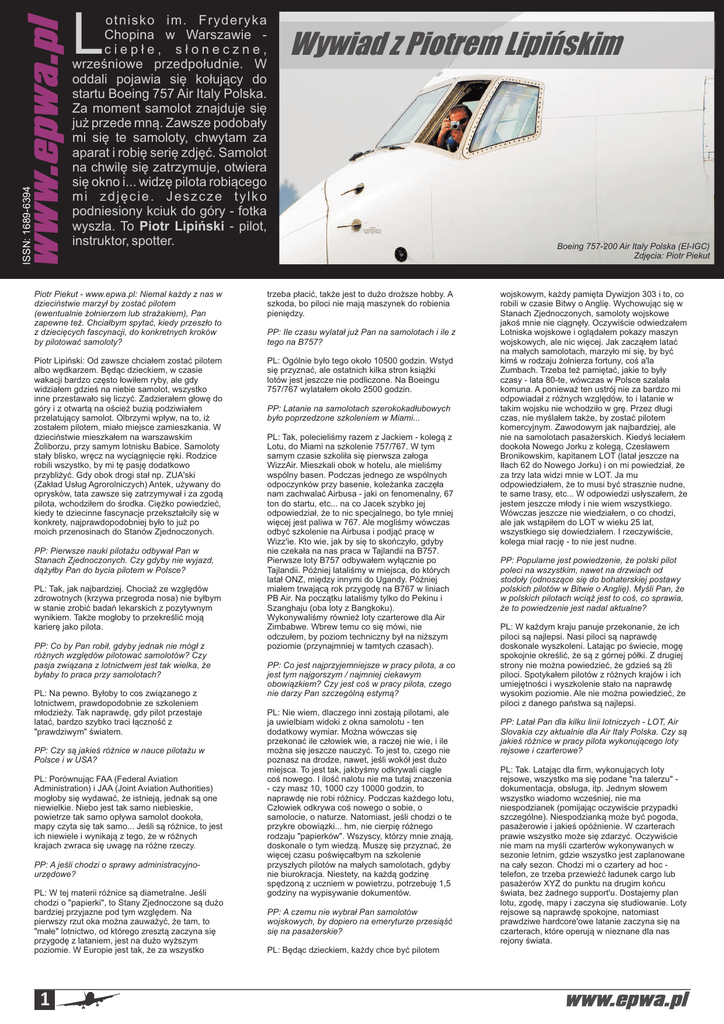 L ISSN: 1689-6394 otnisko im. Fryderyka Chopina w Warszawie ciepłe, słoneczne, wrześniowe przedpołudnie. W oddali pojawia się kołujący do startu Boeing 757 Air Italy Polska. Za moment samolot znajduje się już przede mną. Zawsze podobały mi się te samoloty, chwytam za aparat i robię serię zdjęć. Samolot na chwilę się zatrzymuje, otwiera się okno i... widzę pilota robiącego mi zdjęcie. Jeszcze tylko podniesiony kciuk do góry - fotka wyszła. To Piotr Lipiński - pilot, instruktor, spotter. Piotr Piekut - www.epwa.pl: Niemal każdy z nas w dzieciństwie marzył by zostać pilotem (ewentualnie żołnierzem lub strażakiem), Pan zapewne też. Chciałbym spytać, kiedy przeszło to z dziecięcych fascynacji, do konkretnych kroków by pilotować samoloty? Piotr Lipiński: Od zawsze chciałem zostać pilotem albo wędkarzem. Będąc dzieckiem, w czasie wakacji bardzo często łowiłem ryby, ale gdy widziałem gdzieś na niebie samolot, wszystko inne przestawało się liczyć. Zadzierałem głowę do góry i z otwartą na oścież buzią podziwiałem przelatujący samolot. Olbrzymi wpływ, na to, iż zostałem pilotem, miało miejsce zamieszkania. W dzieciństwie mieszkałem na warszawskim Żoliborzu, przy samym lotnisku Babice. Samoloty stały blisko, wręcz na wyciągnięcie ręki. Rodzice robili wszystko, by mi tę pasję dodatkowo przybliżyć. Gdy obok drogi stał np. ZUA'ski (Zakład Usług Agrorolniczych) Antek, używany do oprysków, tata zawsze się zatrzymywał i za zgodą pilota, wchodziłem do środka. Ciężko powiedzieć, kiedy te dziecinne fascynacje przekształciły się w konkrety, najprawdopodobniej było to już po moich przenosinach do Stanów Zjednoczonych. PP: Pierwsze nauki pilotażu odbywał Pan w Stanach Zjednoczonych. Czy gdyby nie wyjazd, dążyłby Pan do bycia pilotem w Polsce? PL: Tak, jak najbardziej. Chociaż ze względów zdrowotnych (krzywa przegroda nosa) nie byłbym w stanie zrobić badań lekarskich z pozytywnym wynikiem. Także mogłoby to przekreślić moją karierę jako pilota. PP: Co by Pan robił, gdyby jednak nie mógł z różnych względów pilotować samolotów? Czy pasja związana z lotnictwem jest tak wielka, że byłaby to praca przy samolotach? PL: Na pewno. Byłoby to cos związanego z lotnictwem, prawdopodobnie ze szkoleniem młodzieży. Tak naprawdę, gdy pilot przestaje latać, bardzo szybko traci łączność z "prawdziwym" światem. PP: Czy są jakieś różnice w nauce pilotażu w Polsce i w USA? PL: Porównując FAA (Federal Aviation Administration) i JAA (Joint Aviation Authorities) mogłoby się wydawać, że istnieją, jednak są one niewielkie. Niebo jest tak samo niebieskie, powietrze tak samo opływa samolot dookoła, mapy czyta się tak samo... Jeśli są różnice, to jest ich niewiele i wynikają z tego, że w różnych krajach zwraca się uwagę na różne rzeczy. PP: A jeśli chodzi o sprawy administracyjnourzędowe? PL: W tej materii różnice są diametralne. Jeśli chodzi o "papierki", to Stany Zjednoczone są dużo bardziej przyjazne pod tym względem. Na pierwszy rzut oka można zauważyć, że tam, to "małe" lotnictwo, od którego zresztą zaczyna się przygodę z lataniem, jest na dużo wyższym poziomie. W Europie jest tak, że za wszystko 1 Wywiad z Piotrem Lipińskim Boeing 757-200 Air Italy Polska (EI-IGC) Zdjęcia: Piotr Piekut trzeba płacić, także jest to dużo droższe hobby. A szkoda, bo piloci nie mają maszynek do robienia pieniędzy. PP: Ile czasu wylatał już Pan na samolotach i ile z tego na B757? PL: Ogólnie było tego około 10500 godzin. Wstyd się przyznać, ale ostatnich kilka stron książki lotów jest jeszcze nie podliczone. Na Boeingu 757/767 wylatałem około 2500 godzin. PP: Latanie na samolotach szerokokadłubowych było poprzedzone szkoleniem w Miami... PL: Tak, polecieliśmy razem z Jackiem - kolegą z Lotu, do Miami na szkolenie 757/767. W tym samym czasie szkoliła się pierwsza załoga WizzAir. Mieszkali obok w hotelu, ale mieliśmy wspólny basen. Podczas jednego ze wspólnych odpoczynków przy basenie, koleżanka zaczęła nam zachwalać Airbusa - jaki on fenomenalny, 67 ton do startu, etc... na co Jacek szybko jej odpowiedział, że to nic specjalnego, bo tyle mniej więcej jest paliwa w 767. Ale mogliśmy wówczas odbyć szkolenie na Airbusa i podjąć pracę w Wizz'ie. Kto wie, jak by się to skończyło, gdyby nie czekała na nas praca w Tajlandii na B757. Pierwsze loty B757 odbywałem wyłącznie po Tajlandii. Później lataliśmy w miejsca, do których latał ONZ, między innymi do Ugandy. Później miałem trwającą rok przygodę na B767 w liniach PB Air. Na początku lataliśmy tylko do Pekinu i Szanghaju (oba loty z Bangkoku). Wykonywaliśmy również loty czarterowe dla Air Zimbabwe. Wbrew temu co się mówi, nie odczułem, by poziom techniczny był na niższym poziomie (przynajmniej w tamtych czasach). PP: Co jest najprzyjemniejsze w pracy pilota, a co jest tym najgorszym / najmniej ciekawym obowiązkiem? Czy jest coś w pracy pilota, czego nie darzy Pan szczególną estymą? PL: Nie wiem, dlaczego inni zostają pilotami, ale ja uwielbiam widoki z okna samolotu - ten dodatkowy wymiar. Można wówczas się przekonać ile człowiek wie, a raczej nie wie, i ile można się jeszcze nauczyć. To jest to, czego nie poznasz na drodze, nawet, jeśli wokół jest dużo miejsca. To jest tak, jakbyśmy odkrywali ciągle coś nowego. I ilość nalotu nie ma tutaj znaczenia - czy masz 10, 1000 czy 10000 godzin, to naprawdę nie robi różnicy. Podczas każdego lotu, Człowiek odkrywa coś nowego o sobie, o samolocie, o naturze. Natomiast, jeśli chodzi o te przykre obowiązki... hm, nie cierpię różnego rodzaju "papierków". Wszyscy, którzy mnie znają, doskonale o tym wiedzą. Muszę się przyznać, że więcej czasu poświęcałbym na szkolenie przyszłych pilotów na małych samolotach, gdyby nie biurokracja. Niestety, na każdą godzinę spędzoną z uczn