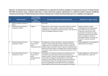 Załącznik 1 do Podsumowania strategicznej oceny oddziaływania na środowisko dla Programu Współpracy Transgranicznej Interreg V-A Polska-Słowacja 2014-2020: Zestawienie uwag i wniosków zgłoszonych na etapie opiniowania prognozy oddziaływania na środowisko projektu Programu Współpracy Transgranicznej Interreg V-A Polska-Słowacja przez właściwe instytucje oraz w trakcie konsultacji społecznych wraz z podjętym rozstrzygnięciem Nr 1. Część Prognozy/ Programu, której dotyczy uwaga/wniosek Nazwa instytucji Treść uwagi / wniosku lub proponowany zapis Odpowiedź na uwagę / wniosek Główny Inspektor Sanitarny w Polsce Generalna Dyrekcja Ochrony Środowiska w Polsce - Brak uwag - Program Wskazane jest, o ile to możliwe, rozszerzenie alokacji na ochronę środowiska i przyrody, zgodnie z sugestią Autorów Prognozy oddziaływania na środowisko, ponieważ potrzeby w tym zakresie są istotne dla objętego Programem regionu. 3. Generalna Dyrekcja Ochrony Środowiska w Polsce str. 17 Prognozy, Streszczenie w języku niespecjalistycznym Uwaga do Programu. Uwaga nieuwzględniona ponieważ głównym celem Programu nie jest ochrona środowiska, a ograniczone środki przeznaczone na Program nie mogą zaspokoić wszystkich potrzeb obszaru wsparcia. Dlatego ich rozdział na poszczególne działania musiał uzyskać konsensus w zakresie wszystkich działań. Uwaga uwzględniona. Przeredagowano odpowiednio treść Prognozy. 4. Generalna Dyrekcja Ochrony Środowiska w Polsce str. 19 Prognozy, Streszczenie w języku niespecjalistyczny, str. 141 We fragmencie, w którym jako jedną z wersji alternatywnych Programu wskazano brak jego realizacji. Podobne stwierdzenie znajduje się na str. 128 Prognozy. Wariant zerowy nie może być traktowany jako alternatywa. Został on opisany w oddzielnej części dokumentu (Ocena skutków w przypadku braku realizacji Programu oraz korzyści z jego realizacji) i nie należy go przywoływać w innym kontekście. Stwierdzono, że na obecnym poziomie oceny Programu nie ma Uwaga uwzględniona. Tekst Prognozy uzasadnienia dla proponowania działań kompensacyjnych. Z został odpowiednio uzupełniony. prognozy wynika, iż pomimo bardzo ogólnych zapisów projektu, nie można wykluczyć negatywnych oddziaływań na środowisko związanych z jego realizacją. Zaproponowano także rozwiązania minimalizujące. Zostały one scharakteryzowane stosownie do poziomu szczegółowości ocenianego dokumentu. W podobny sposób (ogólnie, problemowo) zaleca się uzupełnić informację o 2. 1 5. Generalna Dyrekcja Ochrony Środowiska w Polsce Generalna Dyrekcja Ochrony Środowiska w Polsce str. 24 Prognozy, przypis str. 50 Prognozy 7. Generalna Dyrekcja Ochrony Środowiska w Polsce str. 59 Prognozy 8. Generalna Dyrekcja Ochrony Środowiska w Polsce str. 90 Prognozy, Tabela 10 oraz Załącznik 5 9. Generalna Dyrekcja Ochrony Środowiska w Polsce str. 94 Prognozy, tabela 11 6. najbardziej prawdopodobnych rozwiązaniach w zakresie kompensacji, ponieważ nie można wykluczyć, że zaistnieje taka potrzeba. W przypadku ustawy ooś przywołano nieaktualny Dziennik Ustaw. Powinno być: "Dz. U. z 2013r., poz. 1235 ze zm". W części Podsumowanie znajduje się błąd redakcyjny, który zmienia sens zdania. W punkcie 3 zamiast: "Tylko dla jednego dokumentu strategicznego nie znaleziono żadnej korelacji z celami Programu, gdyż "nie jest on" bezpośrednio związany z tematyką, zawartą we Wstępnej ocenie ryzyka powodziowego" powinno być: "gdyż jest on". "Większość roślin na tym terenie występuje w całej Słowacji (...)" powinien brzmieć: "Większość roślin chronionych na tym terenie występuje w całej Słowacji (...)". Podano, że oddziaływania, związane z budową ścieżek rowerowych na powierzchnię ziemi mogą mieć charakter wyłącznie negatywny, bezpośredni i krótkoterminowy. Trzeba wskazać, że funkcjonowanie szlaków pieszych i rowerowych może także wiązać się z oddziaływaniami o charakterze długoterminowym, za sprawą intensyfikacji procesów erozyjnych. Stwierdzenie w tej samej tabeli (oraz w Załączniku 5) długoterminowego, negatywnego wpływu ścieżek rowerowych na zasoby naturalne wymaga uspójnienia z opisem oddziaływania tej formy wykorzystania terenu na zasoby naturalne przedstawione na stronie 106. Wśród propozycji działań minimalizujących i kompensujących sugeruje się uzupełnienie zaleceń dla budowy ścieżek rowerowych o właściwe, umożliwiające korzystne dla środowiska skanalizowanie ruchu turystycznego, planowanie przebiegu tras. Podobne zalecenie powinno także dotyczyć budowy parkingów powiązanych z systemem ścieżek oraz innych działań, wpływających na sposób przemieszczania się odwiedzających (także o charakterze organizacyjnym). Przy planowaniu ich usytuowania czy funkcjonowania należy brać pod uwagę nie tylko ryzyko bezpośredniej kolizji z obszarami cennymi, ale także potrzebę skoncentrowania ruchu turystycznego w miejscach, w których nie Uwaga uwzględniona. Poprawiono odwołanie. Uwaga uwzględniona. Poprawiono błąd redakcyjny. Uwaga uwzględniona. Poprawiono tekst. Uwaga uwzględniona. Uzupełniono ocenę. Uwaga uwzględniona. Uzupełniono zalecenie. 2 10. Generalna Dyrekcja Ochrony Środowiska w Polsce str. 117 Prognozy 11. Generalna Dyrekcja Ochrony Środowiska w Polsce str. 129 Prognozy, tabela 14 12. Generalna Dyrekcja Ochrony Środowiska w Polsce str. 136-140 Prognozy 13. Ministerstwo Transportu, Budownictwa i Rozwoju Regionalnego Republiki Słowackiej (Departament Programu Operacyjnego Transport) Ministerstwo Środowiska Republiki Słowackiej (Sekcja ochrony przyrody i krajobrazu) - 14. Program będzie on znacząco uciążliwy dla środowiska (ruch turystyczny jest najintensywniejszy w lokalizacjach węzłowych, np. blisko parkingów i miejsc odpoczynku oraz miejscach z ułatwionym dostępem - np. ścieżki przyrodnicze). Proponuje się "przy wyborze projektów uwzględnić kryteri
