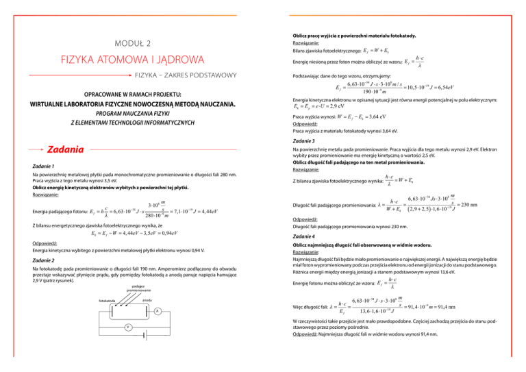 MODUŁ 2 Oblicz pracę wyjścia z powierzchni materiału fotokatody. Rozwiązanie: FIZYKA ATOMOWA I JĄDROWA Energię niesioną przez foton można obliczyć ze wzoru: E f = FIZYKA – ZAKRES PODSTAWOWY OPRACOWANE W RAMACH PROJEKTU: WIRTUALNE LABORATORIA FIZYCZNE NOWOCZESNĄ METODĄ NAUCZANIA. PROGRAM NAUCZANIA FIZYKI Z ELEMENTAMI TECHNOLOGII INFORMATYCZNYCH Bilans zjawiska fotoelektrycznego: E f = W + Ek h⋅c λ Podstawiając dane do tego wzoru, otrzymujemy: Ef = 6, 63 ⋅10−34 J ⋅ s ⋅ 3 ⋅108 m / s = 10, 5 ⋅10−19 J = 6, 54eV 190 ⋅10−9 m Energia kinetyczna elektronu w opisanej sytuacji jest równa energii potencjalnej w polu elektrycznym: Ek = E p = e ⋅ U = 2,9 eV Praca wyjścia wynosi: W = E f − Ek = 3,64 eV Odpowiedź: Praca wyjścia z materiału fotokatody wynosi 3,64 eV. Zadanie 3 Zadania Zadanie 1 Na powierzchnię metalowej płytki pada monochromatyczne promieniowanie o długości fali 280 nm. Praca wyjścia z tego metalu wynosi 3,5 eV. Oblicz energię kinetyczną elektronów wybitych z powierzchni tej płytki. Rozwiązanie: m 3 ⋅108 c s = 7,1 ⋅10−19 J = 4, 44eV Energia padającego fotonu: E f = h = 6, 63 ⋅10−34 J ⋅ s λ 280 ⋅10−9 m Z bilansu energetycznego zjawiska fotoelektrycznego wynika, że Ek = E f − W = 4, 44eV − 3, 5eV = 0, 94eV Odpowiedź: Energia kinetyczna wybitego z powierzchni metalowej płytki elektronu wynosi 0,94 V. Zadanie 2 Na fotokatodę pada promieniowanie o długości fali 190 nm. Amperomierz podłączony do obwodu przestaje wskazywać płynięcie prądu, gdy pomiędzy fotokatodą a anodą panuje napięcia hamujące 2,9 V (patrz rysunek). padające promieniowanie anoda fotokatoda A V Na powierzchnię metalu pada promieniowanie. Praca wyjścia dla tego metalu wynosi 2,9 eV. Elektron wybity przez promieniowanie ma energię kinetyczną o wartości 2,5 eV. Oblicz długość fali padającego na ten metal promieniowania. Rozwiązanie: Z bilansu zjawiska fotoelektrycznego wynika: h⋅c = W + Ek λ m 6, 63 ⋅10−34 Js ⋅ 3 ⋅108 h⋅c s = 230 nm = Długość fali padającego promieniowania: λ = −19 W + Ek ( 2, 9 + 2, 5 ) ⋅1, 6 ⋅10 J Odpowiedź: Długość fali padającego promieniowania wynosi 230 nm. Zadanie 4 Oblicz najmniejszą długość fali obserwowaną w widmie wodoru. Rozwiązanie: Najmniejszą długość fali będzie miało promieniowanie o największej energii. A największą energię będzie miał foton wypromieniowany podczas przejścia elektronu od energii jonizacji do stanu podstawowego. Różnica energii między energią jonizacji a stanem podstawowym wynosi 13,6 eV. Energię fotonu można obliczyć ze wzoru: E f = h⋅c Więc długość fali: λ = = Ef h⋅c λ 6, 63 ⋅10−34 J ⋅ s ⋅ 3 ⋅108 13, 6 ⋅1, 6 ⋅10−19 J m s = 91, 4 ⋅10−9 m = 91,,4 nm W rzeczywistości takie przejście jest mało prawdopodobne. Częściej zachodzą przejścia do stanu podstawowego przez poziomy pośrednie. Odpowiedź: Najmniejsza długość fali w widmie wodoru wynosi 91,4 nm. Zadanie 5 Z ostatniego równania wynika, że gęstość materii w jądrze atomowym jest stała dla każdego jądra i wy- Atomy wodoru zostały wzbudzone tak, że znajdują się w stanie opisanym główną liczbą kwantową n = 4. Wyznacz, ile linii widmowych będzie można obserwować. Oblicz wartości energii wyemitowanych fotonów. Rozwiązanie: E 4 = – 0,84 eV Narysujmy schemat poziomów energetycznych: Zgodnie ze schematem w sprzyjających warunkach będzie E 3 = – 1,51 eV można 6 linii widmowych. Energie wyemitowanych fotonów: E 2 = – 3,40 eV 17 nosi: ρ = 2, 31 ⋅10 E1 = −0, 84eV − (−1, 51eV ) = 0, 67eV E2 = −0, 84eV − (−3, 40eV ) = 2, 56eV E3 = −0, 84eV − (−13, 6eV ) = 12, 76eV E 1 = – 13,6 eV E4 = −1, 51eV − (−3, 40eV ) = 1, 89eV E5 = −1, 51eV − (−13, 6eV ) = 12, 09eV E5 = −3, 40eV − (−13, 6eV ) = 10, 2eV kg . m3 Odpowiedź: 17 Gęstość materii w jądrze atomowym wynosi ρ = 2, 31 ⋅10 Zadanie 8 kg . m3 Jądro izotopu węgla 146 C jest promieniotwórcze. Czas połowicznego rozpadu tego izotopu wynosi 5730 lat. Izotop ten rozpada się tworząc izotop azotu 147 N . Zad. 8.1. Zapisz reakcję rozpadu jądra izotopu węgla 146 C . Zad. 8.2. Aktywność promieniotwórcza pewnego kawałka drewna była 4 razy mniejsza od aktywności świeżo ściętego drzewa. Oblicz wiek tego kawałka drzewa. Rozwiązanie: 8.1. 14 6 Zadanie 6 C → 147 N + −01e +νe Na atomy wodoru znajdujące się w stanie podstawowym pada światło monochromatyczne, w którym fotony mają energię 5eV. Czy zostanie ono zaabsorbowane przez wodór? Swoją odpowiedź uzasadnij. Rozwiązanie: Nie, takie fotony nie mogą zostać zaabsorbowane przez atomy wodoru znajdujące się w stanie podstawowym. Najbliższy poziom energetyczny ma w atomie wodoru energię – 3,40 eV. Aby ze stanu podstawowego przenieść elektron do pierwszego stanu wzbudzonego należy dostarczyć energię 10,2 eV. 8.2. Aktywność promieniotwórcza źródła maleje z czasem zgodnie z wyrażeniem: Zadanie 7 1 1 T1/2 A0 = A0 4 2 Z treści zadania wynika, że A = t 12 Oblicz gęstość materii w jądrze atomowym atomu węgla 6 C . Rozwiązanie: Gęstość można wyznaczyć korzystając ze wzoru: ρ = m V Objętość jądra atomu węgla zapisujemy wzorem: V = 4 π R 3, 3 gdzie promień jądra węgla t 1 T1/2 A = A0 2 C : RJ = 1, 2 ⋅10−15 m 3 A = 1, 2 ⋅10−15 3 12 12 6 Objętość jądra atomu węgla: V = 4 π ⋅ (1, 2 ⋅10−15 )3 ⋅12 m3 3 Możemy w przybliżeniu uznać, że masa jądra węgla jest równa masie 12 protonów: m = 12 ⋅1, 67 ⋅10−27 kg Gęstość materii w jądrze węgla: ρ = 12 ⋅1, 67 ⋅10−27 kg 3 4 π ⋅12 ⋅ (1, 2 ⋅10−15 ) 3 1 A0 . Wstawiając to do poprzedniego wyrażenia otrzymujemy: 4 2 t 1 1 T1/2 Przekształcając ten wzór otrzymujemy: = ’ 2 2 Korzystając z własności funkcji wykładniczej otrzymujemy: 2 = Szukany wiek kawałka drewna: t = 2 ⋅ T1/ 2 = 11460lat Odpowiedź: Kawałek drewna ma około 1150