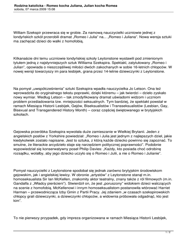 Rodzina katolicka - Romeo kocha Juliana, Julian kocha Romea sobota, 07 marca 2009 15:08 William Szekspir przewraca się w grobie. Za namową nauczycielki uczniowie jednej z londyńskich szkół przerobili dramat „Romeo i Julia” na... „Romeo i Juliana”. Nowa wersja sztuki ma zachęcać dzieci do walki z homofobią. Kilkanaście dni temu uczniowie londyńskiej szkoły Leytonstone wystawili pod zmienionym tytułem jedną z najsłynniejszych sztuk Williama Szekspira. Spektakl, zatytułowany „Romeo i Julian”, opowiada o nieszczęśliwej miłości dwóch zakochanych w sobie 16-letnich chłopców. W nowej wersji towarzyszy im para lesbijek, grana przez 14-letnie dziewczynki z Leytonstone. Na pomysł „uwspółcześnienia” sztuki Szekspira wpadła nauczycielka Jo Letson. Ona też wprowadziła do oryginalnego tekstu poprawki, dzięki któremu – jak twierdzi – dzieło zyskało nowy wymiar. Według Letson – tak zmodyfikowany dramat uświadomi widzom i uczniom problem prześladowania tzw. mniejszości seksualnych. Tym bardziej, że spektakt powstał w ramach Miesiąca Historii Lesbijek, Gejów, Biseksualistów i Transseksualistów (Lesbian, Gay, Bisexual and Transgendered History Month) – coraz częściej świętowanego w brytyjskich szkołach. Gejowska przeróbka Szekspira wywołała duże zamieszanie w Wielkiej Brytanii. Jeden z angielskich posłów z Yorkshire powiedział: „Romeo i Julia jest jednym z najlepszych dzieł, jakie kiedykolwiek zostało napisane. Jest to sztuka, z którą każde dziecko powinno się zapoznać. To smutne, że literackie arcydzieło staje się narzędziem politycznej poprawności”. Podobnie wypowiedział się konserwatywny poseł Philip Davies: „Każdy, kto posiada choć odrobinę rozsądku, wolałby, aby jego dziecko uczyło się o Romeo i Julii, a nie o Romeo i Julianie”. Pomysł nauczycielki z Leytonstone spodobał się jednak zarówno brytyjskim środowiskom gejowskim, jak i angielskiej lewicy. W obronie „artystów” z Leytonstone stanął m.in. homoseksualista Sir Ian McKellen, znakomity aktor teatralny, znany także z ról filmowych (m.in. Gandalfa z „Władcy pierścieni”). Stwierdził on, że jest „poruszony” widokiem dzieci walczących na scenie z homofobią. McKellenowi i innym homoseksualistom postanowiła wtórować Harriet Harman – przewodnicząca Izby Gmin z Partii Pracy. Jej zdaniem „w czasach szekspirowskich chłopcy grali dziewczynki, a dziewczynki chłopców, a widownia próbowała odgadnąć, kto jest kim”. To nie pierwszy przypadek, gdy impreza organizowana w ramach Miesiąca Historii Lesbijek, 1/2 Rodzina katolicka - Romeo kocha Juliana, Julian kocha Romea sobota, 07 marca 2009 15:08 Gejów, Biseksualistów i Transseksualistów wywołuje takie kontrowersje. W 2007 r. w jednej z londyńskich szkół sześć uczennic przyznających się do chrześcijaństwa próbowało zwolnić się z obowiązku współorganizowania imprezy towarzyszącej obchodom Miesiąca. Nauczyciele jednak, pod groźbą kar dyscyplinarnych, zmusili je do uczestnictwa. Z kolei w 2008 r. organizatorzy kampanii wmawiali uczniom, że fizyk Isaac Newton był gejem, a Florence Nightingale (angielska działaczka społeczna, twórczyni nowoczesnego pielęgniarstwa i gorliwa chrześcijanka) – lesbijką. Magdalena Żuraw Źródło: Niezależna.pl 2/2