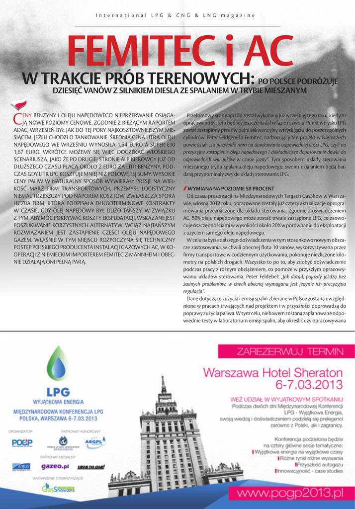 Inter national LP G & CNG & L NG ma ga zin e FEMITEC i AC W TRAKCIE PRÓB TERENOWYCH: PO POLSCE PODRÓŻUJE DZIESIĘĆ VANÓW Z SILNIKIEM DIESLA ZE SPALANIEM W TRYBIE MIESZANYM C ENY BENZYNY I OLEJU NAPĘDOWEGO NIEPRZERWANIE OSIĄGAJĄ NOWE POZIOMY CENOWE. ZGODNIE Z BIEŻĄCYM RAPORTEM ADAC, WRZESIEŃ BYŁ JAK DO TEJ PORY NAJKOSZTOWNIEJSZYM MIESIĄCEM, JEŻELI CHODZI O TANKOWANIE. ŚREDNIA CENA LITRA OLEJU NAPĘDOWEGO WE WRZEŚNIU WYNOSIŁA 1,54 EURO A SUPER E10 1,67 EURO. WKRÓTCE MOŻEMY SIĘ WIĘC DOCZEKAĆ WŁOSKIEGO SCENARIUSZA, JAKO ŻE PO DRUGIEJ STRONIE ALP KIEROWCY JUŻ OD DŁUŻSZEGO CZASU PŁACĄ OKOŁO 2 EURO ZA LITR BENZYNY, PODCZAS GDY LITR LPG KOSZTUJE MNIEJ NIŻ POŁOWĘ TEJ SUMY. WYSOKIE CENY PALIW W NATURALNY SPOSÓB WYWIERAŁY PRESJĘ NA WIELKOŚĆ MARŻ FIRM TRANSPORTOWYCH, PRZEMYSŁ LOGISTYCZNY NIEMAL TRZESZCZY POD NAPOREM KOSZTÓW, ZWŁASZCZA SPORA LICZBA FIRM, KTÓRA PODPISAŁA DŁUGOTERMINOWE KONTRAKTY W CZASIE, GDY OLEJ NAPĘDOWY BYŁ DUŻO TAŃSZY. W ZWIĄZKU Z TYM, ABY MÓC POKRYWAĆ KOSZTY EKSPLOATACJI, WSKAZANE JEST POSZUKIWANIE KORZYSTNYCH ALTERNATYW. WCIĄŻ NAJTAŃSZYM ROZWIĄZANIEM JEST ZASTĄPIENIE CZĘŚCI OLEJU NAPĘDOWEGO GAZEM. WŁAŚNIE W TYM MIEJSCU ROZPOCZYNA SIĘ TECHNICZNY POSTĘP POLSKIEGO PRODUCENTA INSTALACJI GAZOWYCH AC, W KOOPERACJI Z NIEMIECKIM IMPORTEREM FEMITEC Z MANNHEIM I OBECNIE DZIAŁAJĄ ONI PEŁNĄ PARĄ. Przełomowy krok naprzód został wykonany już wcześniej tego roku, kiedy to opracowano system będący jeszcze nadal w fazie rozwoju. Punkt wtrysku LPG został zastąpiony przez w pełni sekwencyjny wtrysk gazu do poszczególnych cylindrów. Peter Feldgebel z Femitec, nadzorujący ten projekt w Niemczech powiedział: „To pozwoliło nam na dawkowanie odpowiedniej ilości LPG, czyli na precyzyjne zastąpienie oleju napędowego i dokładniejsze dopasowanie dawki do odpowiednich warunków w czasie jazdy”. Tym sposobem układy sterowania mieszanego trybu spalania oleju napędowego, swoim działaniem będą bardziej przypominały zwykłe układy sterowania LPG. WYMIANA NA POZIOMIE 50 PROCENT Od czasu prezentacji na Międzynarodowych Targach GasShow w Warszawie, wiosną 2012 roku, opracowane zostały już cztery aktualizacje oprogramowania przeznaczone dla układu sterowania. Zgodnie z oświadczeniem AC, 50% oleju napędowego może zostać trwale zastąpione LPG, co zaowocuje oszczędnościami w wysokości około 20% w porównaniu do eksploatacji z użyciem samego oleju napędowego. W celu nabycia dalszego doświadczenia w tym stosunkowo nowym obszarze zastosowania, w chwili obecnej flota 10 vanów, wykorzystywana przez firmy transportowe w codziennym użytkowaniu, pokonuje niezliczone kilometry na polskich drogach. Wszystko to po to, aby zdobyć doświadczenie podczas pracy z różnym obciążeniem, co pomoże w przyszłym opracowywaniu układów sterowania. Peter Feldebel: „Jak dotąd, pojazdy jeżdżą bez żadnych problemów, w chwili obecnej wymagana jest jedynie ich precyzyjna regulacja”. Dane dotyczące zużycia i emisji spalin zbierane w Polsce zostaną uwzględnione w pracach trwających nad projektem i w przyszłości doprowadzą do poprawy zużycia paliwa. W tym celu, niebawem zostaną zaplanowane odpowiednie testy w laboratorium emisji spalin, aby określić czy opracowywana Opracowany wspólnie przez AC i Femitec układ sterowania diesel-gaz jest obecnie sprawdzany w trakcie prób terenowych. Wdrażanie „zielonej” technologii: kiedy przełącznik świeci na zielono, instalacja gazowa oszczędza kosztowny olej napędowy. W zbiorniku na gaz do mieszanego spalania pomyślano o wszystkim, nawet o podgrzewaczu zbiornika na chłodne zimowe dni. Peter Feldgebel sprawdza plan instalacji gazowej oraz stopień mieszania, w którym olej napędowy jest zastępowany przez gaz za pomocą układu sterowania wtryskiem. technologia, bez wprowadzania dalszych zmian, otrzymałaby aprobatę legislatora. Wdrożenie tej technologii w Niemczech prawdopodobnie spotkałoby się ze sporymi problemami, ale już za granicą, w sąsiedniej Belgii, zagadnienie to przedstawia się zupełnie inaczej. ZAPOTRZEBOWANIE WE WSCHODNIEJ EUROPIE Ostatnie targi Automechanika, gdzie AC wraz z Femitec pojawili się razem jako jeden wystawca, potwierdziły, że rozwiązanie w postaci mieszanego trybu spalania w silniku wysokoprężnym zyskało niespodziewane zainteresowanie. W międzyczasie przeprowadzono rozmowy handlowe, po których Peter Felgebel mógł przedstawić pozytywne wnioski: „Zapotrzebowanie na te instalacje jest większe niż się spodziewałem, zwłaszcza, że AC w Białymstosku jest w stanie wyzwolić więcej możliwości produkcyjnej, aby obsłużyć zapotrzebowania tak szybko jak to możliwe”. MOŻLIWE JEST UZYSKANIE 65% W tym samym czasie Femitec w Mannheim również pracuje nad dalszym rozwojem technologii. Pojazd testowy MAN TGA 430 robi znaczne postępy. Zgodnie z tym, co mówi Peter Gebel, już do 65% oleju napędowego może zostać zastąpione przez LPG. Powoduje to zwiększenie oszczędności do 25,3%. Wątpliwe jest jednak to, aby w najbliższej przyszłości na niemieckich drogach stosowane były instalacje tego typu. Od czasu, kiedy Niemcy są jedynym europejskim krajem ratyfikującym ECE R 115 a organizacje rzeczoznawców wietrzą interes w pomiarach spalin, nie powinniśmy mieć nadziei na spory postęp w procesie legalizacji. „W chwili obecnej bardziej skupiamy się na sprzedaży zagranicznej, aby w krótkim okresie czasu uzyskać zwrot inwestycji.” Kia Carnival z silnikiem wysokoprężnym o pojemności 2,9 litra jest właśnie stosowana jako dodatkowy pojazd testowy, również dostosowany do eksploatacji w trybie mieszanym. Może to pozwolić na rozszerzenie działalności w siedzibie głównej AC w Białymstoku, pomagając w nabieraniu dodatkowego doświadczenia z użyciem tej nowej technologii. Niewykluczona jest również możliwość wykonywania późniejszych pomiarów spalin. Zagadnienie związane z technolo