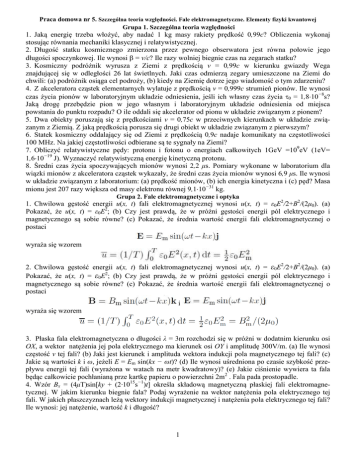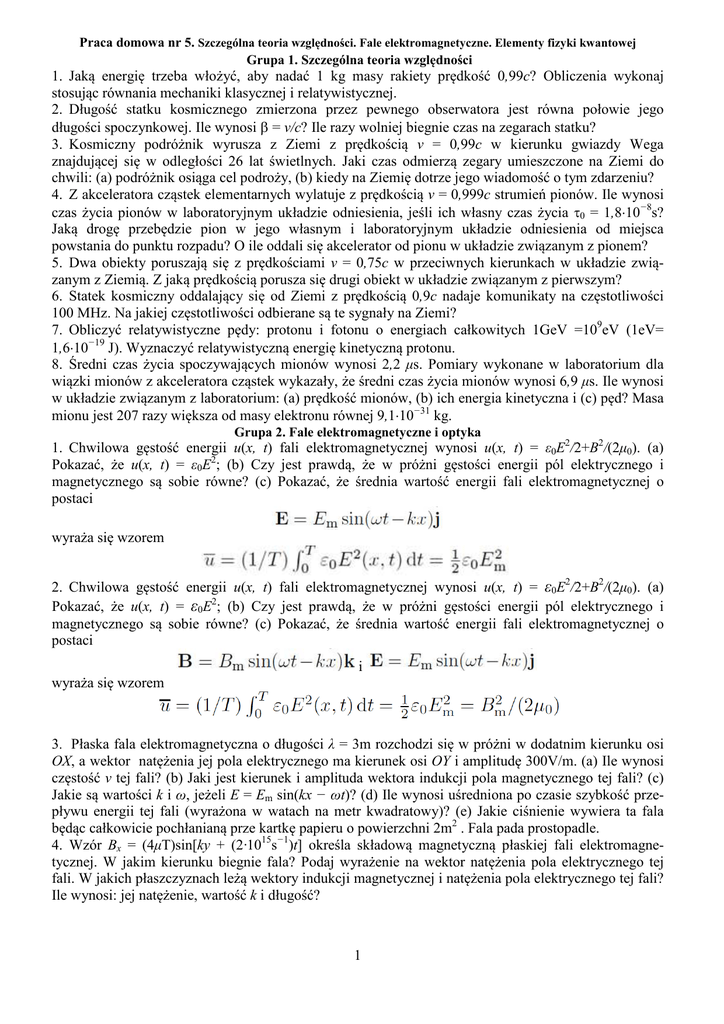 Praca domowa nr 5. Szczególna teoria względności. Fale elektromagnetyczne. Elementy fizyki kwantowej Grupa 1. Szczególna teoria względności 1. Jaką energię trzeba włożyć, aby nadać 1 kg masy rakiety prędkość 0,99c? Obliczenia wykonaj stosując równania mechaniki klasycznej i relatywistycznej. 2. Długość statku kosmicznego zmierzona przez pewnego obserwatora jest równa połowie jego długości spoczynkowej. Ile wynosi β = v/c? Ile razy wolniej biegnie czas na zegarach statku? 3. Kosmiczny podróżnik wyrusza z Ziemi z prędkością v = 0,99c w kierunku gwiazdy Wega znajdującej się w odległości 26 lat świetlnych. Jaki czas odmierzą zegary umieszczone na Ziemi do chwili: (a) podróżnik osiąga cel podroży, (b) kiedy na Ziemię dotrze jego wiadomość o tym zdarzeniu? 4. Z akceleratora cząstek elementarnych wylatuje z prędkością v = 0,999c strumień pionów. Ile wynosi czas życia pionów w laboratoryjnym układzie odniesienia, jeśli ich własny czas życia τ0 = 1,8⋅10−8s? Jaką drogę przebędzie pion w jego własnym i laboratoryjnym układzie odniesienia od miejsca powstania do punktu rozpadu? O ile oddali się akcelerator od pionu w układzie związanym z pionem? 5. Dwa obiekty poruszają się z prędkościami v = 0,75c w przeciwnych kierunkach w układzie związanym z Ziemią. Z jaką prędkością porusza się drugi obiekt w układzie związanym z pierwszym? 6. Statek kosmiczny oddalający się od Ziemi z prędkością 0,9c nadaje komunikaty na częstotliwości 100 MHz. Na jakiej częstotliwości odbierane są te sygnały na Ziemi? 7. Obliczyć relatywistyczne pędy: protonu i fotonu o energiach całkowitych 1GeV =109eV (1eV= 1,6⋅10−19 J). Wyznaczyć relatywistyczną energię kinetyczną protonu. 8. Średni czas życia spoczywających mionów wynosi 2,2 µs. Pomiary wykonane w laboratorium dla wiązki mionów z akceleratora cząstek wykazały, że średni czas życia mionów wynosi 6,9 µs. Ile wynosi w układzie związanym z laboratorium: (a) prędkość mionów, (b) ich energia kinetyczna i (c) pęd? Masa mionu jest 207 razy większa od masy elektronu równej 9,1⋅10−31 kg. Grupa 2. Fale elektromagnetyczne i optyka 1. Chwilowa gęstość energii u(x, t) fali elektromagnetycznej wynosi u(x, t) = ε0E2/2+B2/(2µ0). (a) Pokazać, że u(x, t) = ε0E2; (b) Czy jest prawdą, że w próżni gęstości energii pól elektrycznego i magnetycznego są sobie równe? (c) Pokazać, że średnia wartość energii fali elektromagnetycznej o postaci wyraża się wzorem 2. Chwilowa gęstość energii u(x, t) fali elektromagnetycznej wynosi u(x, t) = ε0E2/2+B2/(2µ0). (a) Pokazać, że u(x, t) = ε0E2; (b) Czy jest prawdą, że w próżni gęstości energii pól elektrycznego i magnetycznego są sobie równe? (c) Pokazać, że średnia wartość energii fali elektromagnetycznej o postaci i wyraża się wzorem 3. Płaska fala elektromagnetyczna o długości λ = 3m rozchodzi się w próżni w dodatnim kierunku osi OX, a wektor natężenia jej pola elektrycznego ma kierunek osi OY i amplitudę 300V/m. (a) Ile wynosi częstość ν tej fali? (b) Jaki jest kierunek i amplituda wektora indukcji pola magnetycznego tej fali? (c) Jakie są wartości k i ω, jeżeli E = Em sin(kx − ωt)? (d) Ile wynosi uśredniona po czasie szybkość przepływu energii tej fali (wyrażona w watach na metr kwadratowy)? (e) Jakie ciśnienie wywiera ta fala będąc całkowicie pochłanianą prze kartkę papieru o powierzchni 2m2 . Fala pada prostopadle. 4. Wzór Bx = (4µT)sin[ky + (2·1015s−1)t] określa składową magnetyczną płaskiej fali elektromagnetycznej. W jakim kierunku biegnie fala? Podaj wyrażenie na wektor natężenia pola elektrycznego tej fali. W jakich płaszczyznach leżą wektory indukcji magnetycznej i natężenia pola elektrycznego tej fali? Ile wynosi: jej natężenie, wartość k i długość? 1 5. A) Laser neodymowy może w impulsie o długości fali 0,26 µm i czasie trwania 1 ns wysyłać promieniowanie o mocy 100 TW. Jaką energię niesie taki impuls? B) Najbliższa nam gwiazda, Proxima Centauri, znajduje się w odległości 4,3 lat świetlnych. Ziemska radiostacja ma moc 1MW. Jakie jest natężenie fali emitowanej przez tę stację na powierzchni gwiazdy Proxima Centauri? 6. Wyznacz wartość stałej słonecznej, tj. intensywność światła słonecznego padającego na jeden metr kwadratowy w odległości, w jakiej Ziemia znajduje się od Słońca. Potrzebne dane należy pozyskać samodzielnie. Ile wynosi ciśnienie tego światła na powierzchnię jednego metra kwadratowego? 7. Związek między zmianą energii ∆W wywołaną pochłonięciem światła niosącego pęd ∆p ma postać ∆W/c = ∆p. Statek kosmiczny o masie 1,5·103 kg dryfuje w przestrzeni kosmicznej. Działająca na niego wypadkowa siła zewnętrzna jest równa zeru. Astronauta włącza laser emitujący wiązkę promieniowania o mocy 10 kW. Jaką prędkość osiągnie po jednej dobie statek kosmiczny? 8. W pewnym obszarze przestrzeni kosmicznej, gdzie siły grawitacji są zaniedbywalnie małe, wiązka światła o stałym natężeniu I = 6mW/m2 przyspiesza kulkę o promieniu 2 µm i gęstości 5·103 kg/m3, całkowicie pochłaniającą światło. Oszacować wartość siły działającej na kulkę oraz jej przyspieszenie. Grupa 3. Elementy fizyki kwantowej 1. Spoczywający atom wodoru o masie m = 1,67·10−27 kg emituje foton o długości fali λ i energii 10,2 eV. Ile wynosi prędkość i energia kinetyczna atomu tuż po emisji? Ile wynosi λ? 2. Rozpatrujemy atom wodoropodobny o ładunku jądra Ze. Jaką częścią prędkości światła jest prędkość elektronu na pierwszej orbicie Bohra dla Z = 1? Dla jakich wartości Z prędkość elektronów jest równa c/10? Dla jakich wartości Z energia jonizacji elektronu jest równa E0/100, gdzie E0 jest energią spoczynkową elektronu? 3. Ujemny potencjał Vstop powodujący zanik prądu fotoelektrycznego dla pewnej fotokatody oświetlonej 