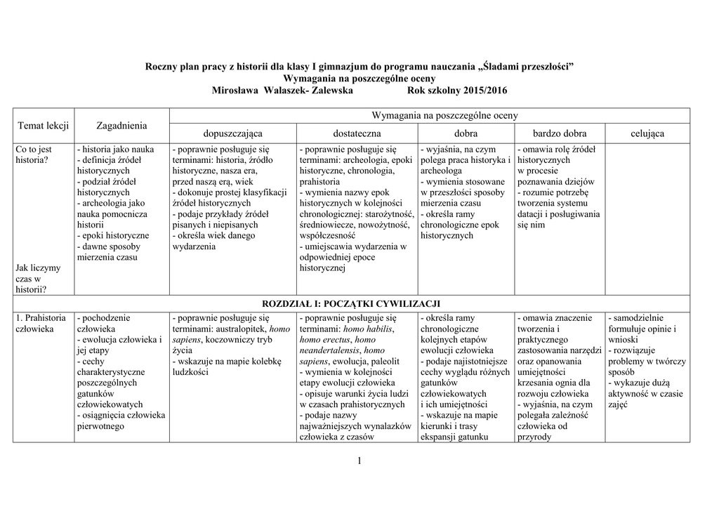 Roczny plan pracy z historii dla klasy I gimnazjum do programu nauczania „Śladami przeszłości” Wymagania na poszczególne oceny Mirosława Walaszek- Zalewska Rok szkolny 2015/2016 Wymagania na poszczególne oceny Temat lekcji Co to jest historia? Jak liczymy czas w historii? 1. Prahistoria człowieka Zagadnienia - historia jako nauka - definicja źródeł historycznych - podział źródeł historycznych - archeologia jako nauka pomocnicza historii - epoki historyczne - dawne sposoby mierzenia czasu dopuszczająca - poprawnie posługuje się terminami: historia, źródło historyczne, nasza era, przed naszą erą, wiek - dokonuje prostej klasyfikacji źródeł historycznych - podaje przykłady źródeł pisanych i niepisanych - określa wiek danego wydarzenia dostateczna dobra bardzo dobra - poprawnie posługuje się terminami: archeologia, epoki historyczne, chronologia, prahistoria - wymienia nazwy epok historycznych w kolejności chronologicznej: starożytność, średniowiecze, nowożytność, współczesność - umiejscawia wydarzenia w odpowiedniej epoce historycznej - wyjaśnia, na czym polega praca historyka i archeologa - wymienia stosowane w przeszłości sposoby mierzenia czasu - określa ramy chronologiczne epok historycznych - omawia rolę źródeł historycznych w procesie poznawania dziejów - rozumie potrzebę tworzenia systemu datacji i posługiwania się nim ROZDZIAŁ I: POCZĄTKI CYWILIZACJI - pochodzenie - poprawnie posługuje się - poprawnie posługuje się - określa ramy człowieka terminami: australopitek, homo terminami: homo habilis, chronologiczne - ewolucja człowieka i sapiens, koczowniczy tryb homo erectus, homo kolejnych etapów jej etapy życia neandertalensis, homo ewolucji człowieka - cechy - wskazuje na mapie kolebkę sapiens, ewolucja, paleolit - podaje najistotniejsze charakterystyczne ludzkości - wymienia w kolejności cechy wyglądu różnych poszczególnych etapy ewolucji człowieka gatunków gatunków - opisuje warunki życia ludzi człowiekowatych człowiekowatych w czasach prahistorycznych i ich umiejętności - osiągnięcia człowieka - podaje nazwy - wskazuje na mapie pierwotnego najważniejszych wynalazków kierunki i trasy człowieka z czasów ekspansji gatunku 1 - omawia znaczenie tworzenia i praktycznego zastosowania narzędzi oraz opanowania umiejętności krzesania ognia dla rozwoju człowieka - wyjaśnia, na czym polegała zależność człowieka od przyrody celująca - samodzielnie formułuje opinie i wnioski - rozwiązuje problemy w twórczy sposób - wykazuje dużą aktywność w czasie zajęć Tajemnice sprzed wieków – Jak zbadano pochodzenie człowieka? 2. Czas wielkich przemian - teorie dotyczące powstania człowieka - Karol Darwin i jego odkrycie - zadania antropologii - wpływ zmian klimatu na życie człowieka - rewolucja neolityczna - początki rolnictwa i hodowli - pierwsze osady - budowle megalityczne - początek metalurgii - przedstawia główne założenia teorii Karola Darwina - wymienia teorie dotyczące powstania człowieka - poprawnie posługuje się terminami: rewolucja neolityczna, osiadły tryb życia, osada, epoka brązu, epoka żelaza - przedstawia zmiany, które zaszły w życiu człowieka w okresie neolitu - podaje nazwy metali wykorzystywanych przez praludzi do wytopu broni, narzędzi, ozdób prahistorycznych ludzkiego - wymienia przyczyny powstania pierwszych dzieł sztuki praludzi - poprawnie posługuje się terminami: ewolucjonizm, antropologia - opisuje, czym zajmuje się antropolog - omawia sposoby ustalania wieku znalezisk - omawia teorię ewolucji Karola Darwina - wyjaśnia różnice między teorią kreacjonizmu a ewolucjonizmu - przedstawia znaczenie badań naukowych oraz wykorzystania różnych technologii dla poznania historii człowieka - poprawnie posługuje się terminami: neolit, megalit - określa ramy chronologiczne rewolucji neolitycznej - opisuje życie codzienne ludzi przed rewolucją neolityczną - omawia sposób wytopu brązu i żelaza - przedstawia wpływ zmian klimatycznych na tryb życia człowieka pierwotnego - omawia tryb życia i zajęcia ludzi epoki neolitu - nazywa i lokalizuje na mapie pozostałości najstarszej znanej osady ludzkiej - wskazuje na mapie miejsce położenia najbardziej znanej - omawia tryb życia i zajęcia ludzi epoki neolitu - charakteryzuje wygląd osad neolitycznych - opisuje wygląd i funkcje budowli megalitycznych 2 - prezentuje argumenty zwolenników i przeciwników ewolucjonizmu Ponadto: - samodzielnie formułuje opinie i wnioski - rozwiązuje problemy w twórczy sposób - wykazuje dużą aktywność w czasie zajęć - uzasadnia słuszność określenia rewolucja dla zmian, które zaszły w życiu człowieka w okresie neolitu Ponadto: - samodzielnie formułuje opinie i wnioski - rozwiązuje problemy w twórczy sposób 3. W kraju Sumerów 4. Babilonia i Asyria budowli megalitycznej - wyjaśnia, jakie zmiany nastąpiły w życiu człowieka dzięki opanowaniu umiejętności wytopu metali - położenie - poprawnie posługuje się - podaje ramy chronologiczne - charakteryzuje geograficzne i warunki terminami: cywilizacja, istnienia cywilizacji oddziaływanie naturalne Mezopotamii Mezopotamia, system sumeryjskiej warunków naturalnych - powstanie pierwszych irygacyjny, Sumerowie, miasto- - poprawnie posługuje się na życie mieszkańców państw państwo terminami: Żyzny Półksiężyc, Mezopotamii - organizacja państwa - lokalizuje na mapie król-kapłan, zikkurat Sumerów Mezopotamię - określa rolę rzek w - osiągnięcia - omawia położenie starożytnej Mezopotamii cywilizacji geograficzne i warunki - opisuje wygląd miast sumeryjskiej naturalne panujące w sumeryjskich Mezopotamii - wymienia osiągnięcia Sumerów - państwo babilońskie - Hammurabi i jego kodeks prawny - Babilon - państwo asyryjskie - organizacja armii asyryjskiej - poprawnie posługuje się terminami: Babilon, Kodeks Hammurabiego, politeizm - określa, kim był i czym za