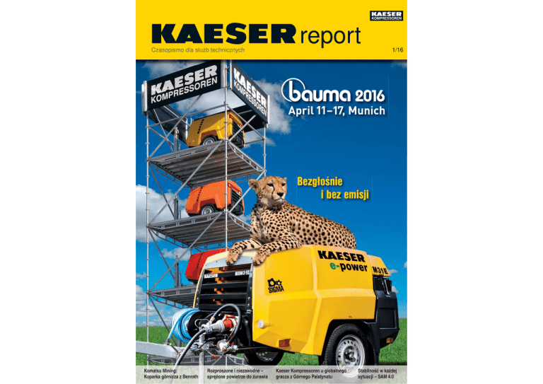 Czasopismo dla służb technicznych report 1/16 Bezgłośnie i bez emisji Komatsu Mining: Koparka górnicza z Benrath Rozproszone i niezawodne – sprężone powietrze do żurawia Kaeser Kompressoren u globalnego gracza z Górnego Palatynatu Stabilność w każdej sytuacji – SAM 4.0 report Spis treści report Wydanie 1/16 Nota wydawcy Prezes Kaeser Kompressoren Polska dr inż. Witold Molicki 3 Nota wydawcy 4 Kaeser Kompressoren na największych światowych targach Bauma 2016 8 Komatsu Mining: koparka górnicza z Benrath Czy można prosić o numer większą? 12 Rozproszone i niezawodne – sprężone powietrze do żurawia Ciężary i poprzeczkę podnosimy wysoko 16 Kaeser Kompressoren u globalnego gracza z Górnego Palatynatu Walce parowe bez pary 19 IFAT 2016: Wyśrubowany nadmuch Oszczędne napowietrzanie 20 Stabilność w każdej sytuacji Sigma Air Manager 4.0 w akcji 22 Sprężarka przewoźna Mobilair Mocna – oszczędna – ekologiczna 23 Sprężanie bez wtrysku oleju ze zintegrowanym osuszaczem rotacyjnym Nowość: seria CSG-2 4-5 8-11 12-15 Zintegrowane myślenie i działanie podstawą Przemysłu 4.0 Przemysł 4.0, integracja maszyn i ludzi dzięki Internetowi, cyfryzacja i tworzenie kopii lustrzanych danych maszynowych i procesowych w wysokowydajnych bazach danych oraz ich obróbka, w połączeniu z zastosowaniami zorientowanymi na klienta tworzą wielką szansę na zdecydowaną poprawę wydajności i efektywności przedsiębiorstw. W dalszej perspektywie idea ta przyczynia się również do wzrostu konkurencyjności. prawia kreatywność i wydajność. Ostatecznie korzyści odnoszą wszystkie zintegrowane obszary. Wspólne myślenie oraz działanie nie tylko kształtują miejsce pracy, ale także pomagają tworzyć elastyczne środowisko do kreatywnego współdziałania. Motywacją do działania staje się wspólny cel. Wprowadzenie powyższych zadań oraz idei Przemysłu 4.0 w życie wymaga jednak zmiany dotychczasowego sposobu myślenia i postępowania. Skostniałe podziały pomiędzy elementami sztywnej struktury organizacyjnej należy zlikwidować, a poprzez integrację w ramach działań projektowych wprowadzić do organizacji komunikację międzywydziałową. Współpraca musi zawsze przekraczać granice poszczególnych obszarów i mieć na względzie powodzenie konkretnych projektów, a także sukces całego przedsiębiorstwa. Tylko w ten sposób można będzie sprostać złożonym wyzwaniom idei Przemysłu 4.0. Niezbędne będą również takie cechy osobowości jak ciekawość, chęć ciągłego uczenia się, ochota do tworzenia rzeczy nietypowych oraz identyfikacja wspólnych zadań. Bezwarunkowe dzielenie się wiedzą i umiejętnościami jest koniecznością. Wzajemne wspieranie się zwiększa morale zarówno jednostki, jak i całego przedsiębiorstwa. Zróżnicowane podejście mieszanych zespołów będących w ciągłej komunikacji ponadprzeciętnie po- Proces zmiany stanowi ważne wyzwanie dla kadry zarządzającej. Wyzwanie, które należy nie tylko zrozumieć, ale i zrealizować. Tylko wtedy Przemysł 4.0 stanie się motorem historii sukcesu przedsiębiorstwa, jakiej oczekujemy. Stopka redakcyjna: Wydawca: KAESER KOMPRESSOREN SE, 96450 Coburg, Niemcy, Carl-Kaeser-Str. 26 Tel. (+49) 09561 640-0, Fax (+49) 09561 640-130, www.kaeser.com Redakcja: KAESER KOMPRESSOREN SE Zdjęcia: Marcel Hunger Druk: Schneider Printmedien GmbH, Weidhausen Redakcja nie ponosi odpowiedzialności za dobrowolnie nadesłane teksty i zdjęcia. Przedruk, także fragmentów, wyłącznie za pisemnym pozwoleniem. KAESER KOMPRESSOREN SE – Postfach 21 43 – 96410 Coburg Tel. (+49) 09561 640-0 – Fax (+49) 09561 640-130, www.kaeser.com – E-Mail: [email protected] 2 Report 1/16 – www.kaeser.com Report 1/16 – www.kaeser.com 3 Kaeser Kompressoren na największych światowych targach Bauma 2016 Od 11 do 17 kwietnia 2016 r. na Nowych Terenach Targowych w Monachium (Neue Messe München) odbędą się międzynarodowe specjalistyczne targi maszyn budowlanych, maszyn dla przemysłu materiałów budowlanych, a także pojazdów oraz urządzeń budowlanych. Zajmujące 605 000 m2 targi Bauma to pod względem powierzchni wystawowej największe targi na świecie – wystawa iście globalna. Podczas tego wydarzenia firma Kaeser Kompressoren przedstawi swoją ofertę sprężonego powietrza dla branży budowlanej całego świata. Charakterystyczna wieża z kompresorami typu M 31 w różnokolorowych obudowach z PE już z daleka wskazuje zwiedzającym drogę do stoiska firmy Kaeser Kompressoren (Tereny Otwarte FM, stoisko 708/15). Na gości i klientów czeka wiele nowości, jednak szczególnym powodem do dumy jest wyznacze- nie po raz kolejny nowych standardów w obszarach wydajności energetycznej i ograniczenia emisji spalin. Strefa „Low Emission Zone” firmy Kaeser Kompressoren Europejski standard emisji spalin obejmuje również maszyny budowlane. Fir- ma Kaeser Kompressoren od dawna uwzględnia to w swojej drodze rozwoju. Na tegorocznych targach prezentuje szeroką ofertę najnowszych modeli Mobilair wyposażonych w filtry spalin spełniające wymagania na poziomie IIIB (Tier 4 interim), a także nowe produkty M 125 i M 171 wyposażone w kataliza- e-Mobilair: „Zero Emission” na budowie Już przed trzema laty, na targach Bauma 2013, w strefie „Low Emission Zone” firma Kaeser Kompressoren prezentowała prototyp systemu Mobilair klasy 3 m3 z napędem elektrycznym. Pozytywny odbiór, z jakim się wówczas spotkaliśmy, stał się przyczynkiem do powstania szerokiej gamy kompresorów przewoźnych z napędem elektrycznym o nazwie „Mobilair e-power”. Rozwinięte na sprawdzonych platformach M 27, M 31 i M 50 oferują moc 15, 22 lub 30 kW przy wydajności od 2,4 do 5 m³/min i ciśnieniu powietrza od 7 do 14 barów. Kompresory z napędem elektrycznym są atrakcyjne dla dużych placów budowy, które dysponują niezależnym zasilaniem. Ponadto są one ekologiczne i mogą być przydatne w zastoso
